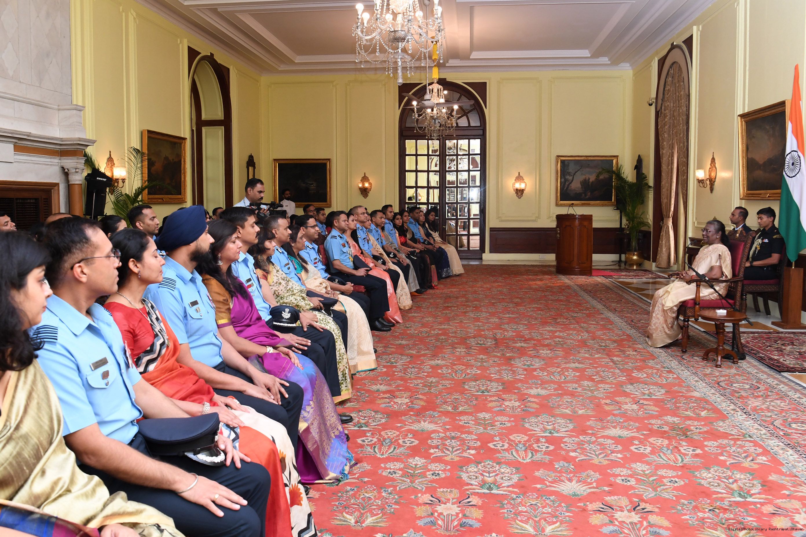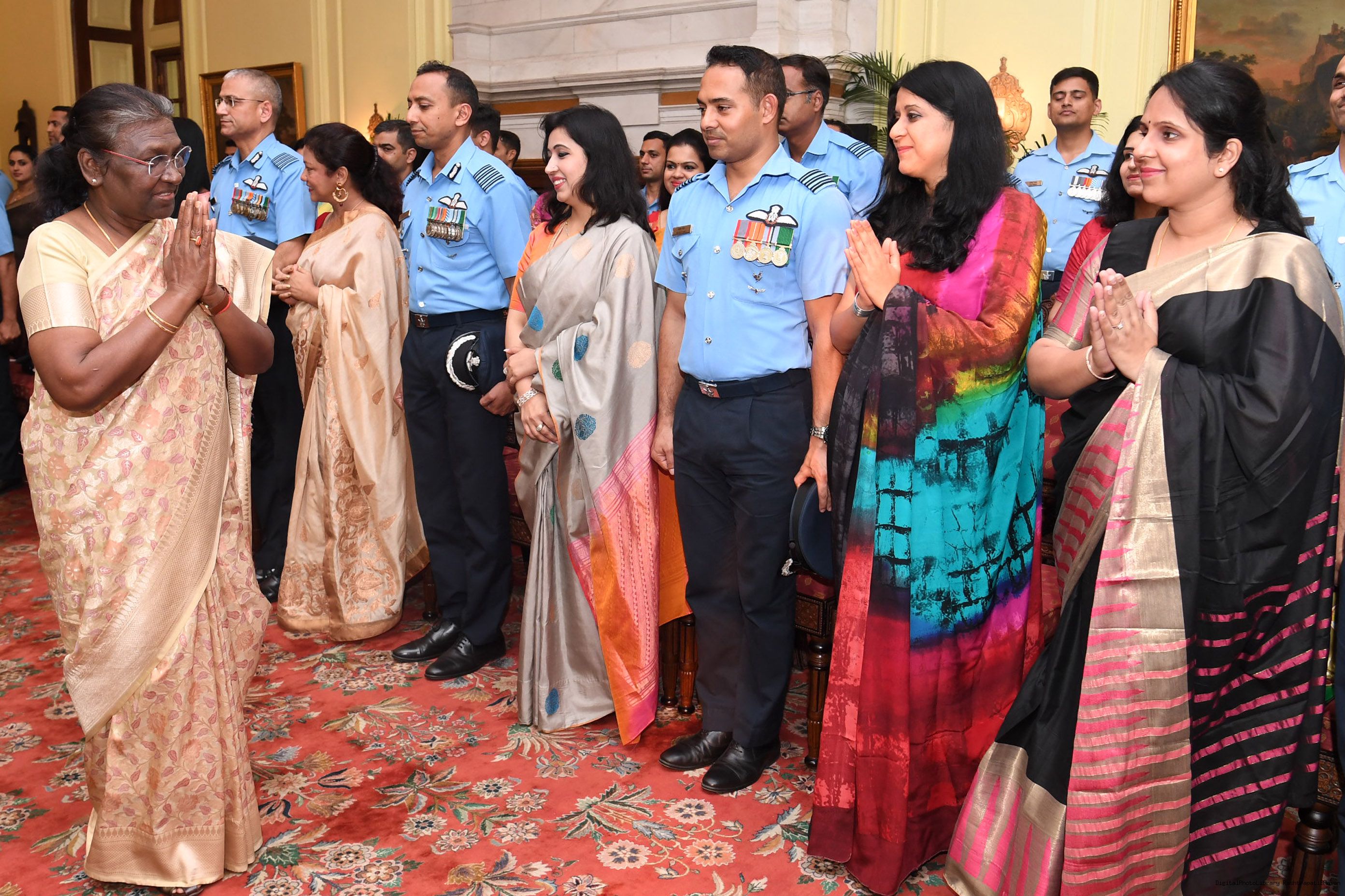| Caption: | The President Meeting the personnel and families of the Air HQ Communication Squadron on the occasion of Platinum Jubilee at Rashtrapati Bhavan on Nov 01, 2022. |