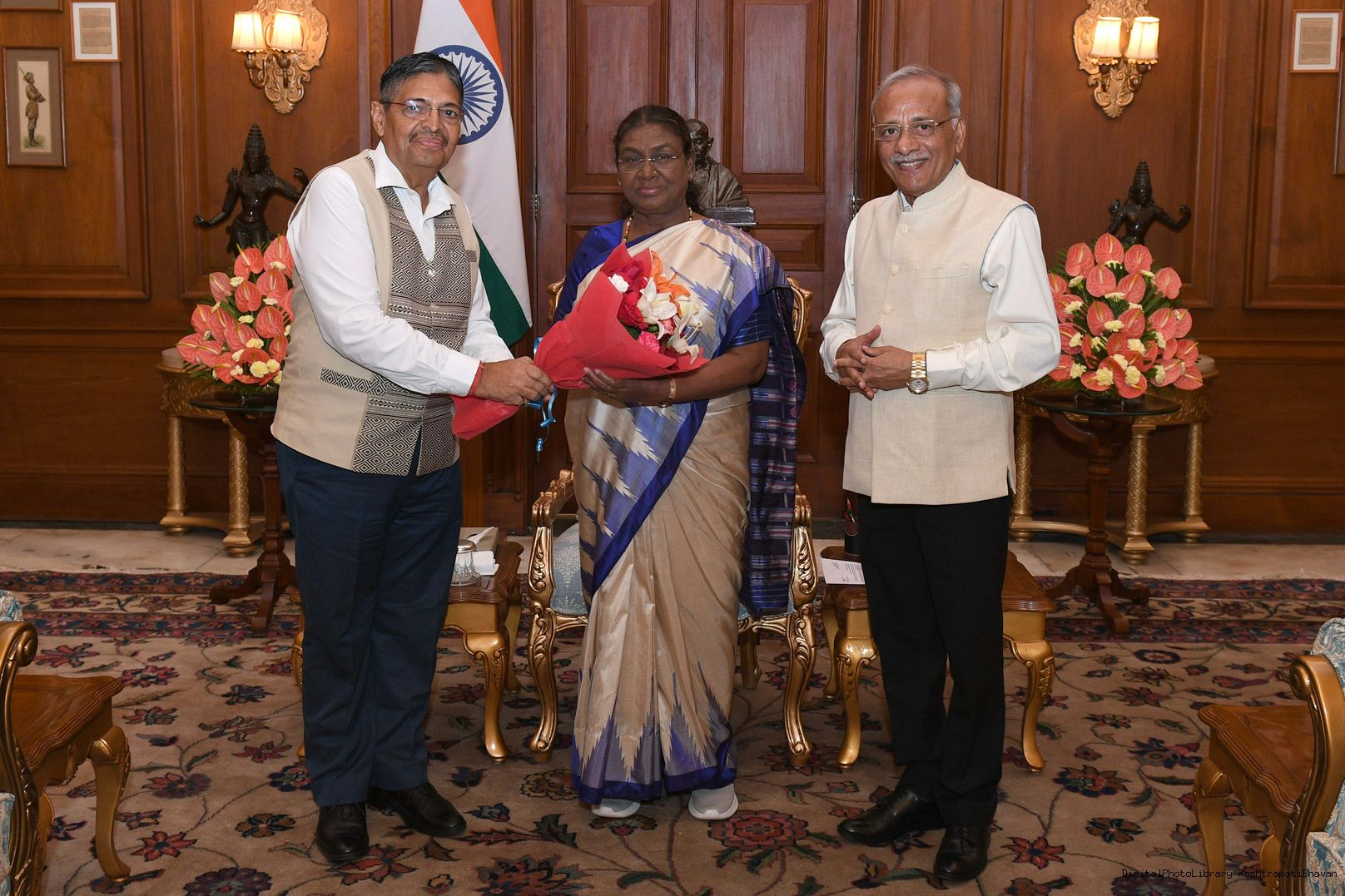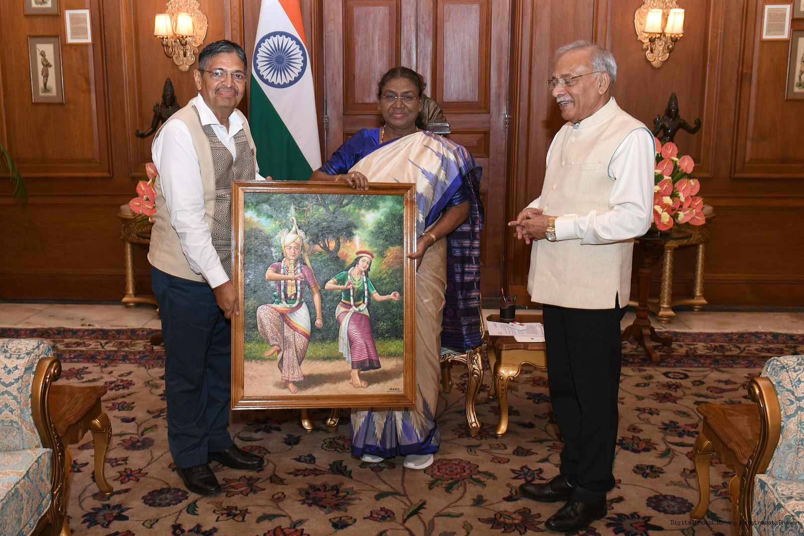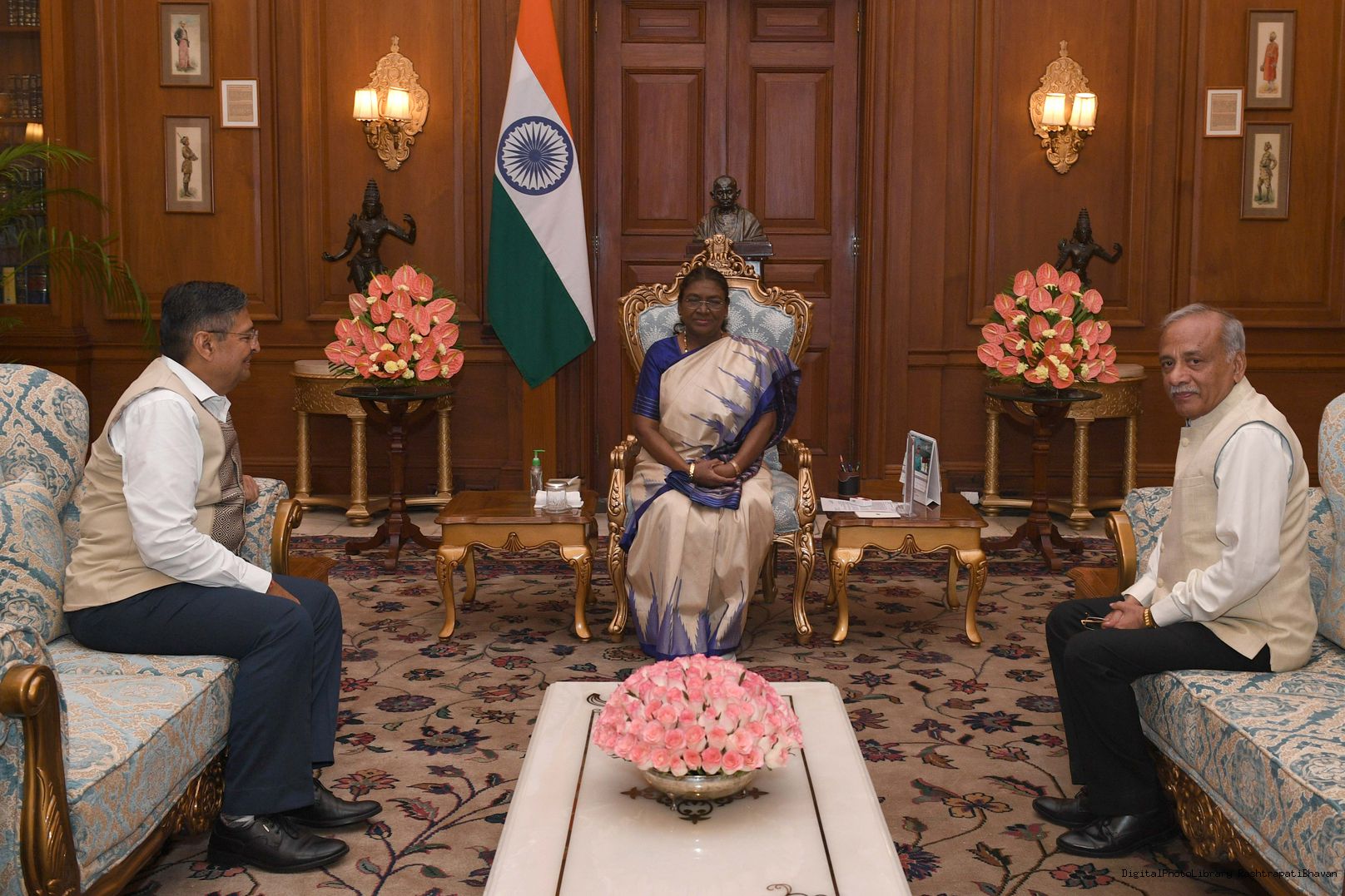 | Caption: | Prof. Dr. Pradeep Kumar Joshi, Chancellor, CAU, Manipal along with Dr. Anupam Mishra, Vice Chancellor, CAU Manipal meeting with the President of India Smt. Droupadi Murmu at Rashtrapati Bhavan on August 13, 2024. |