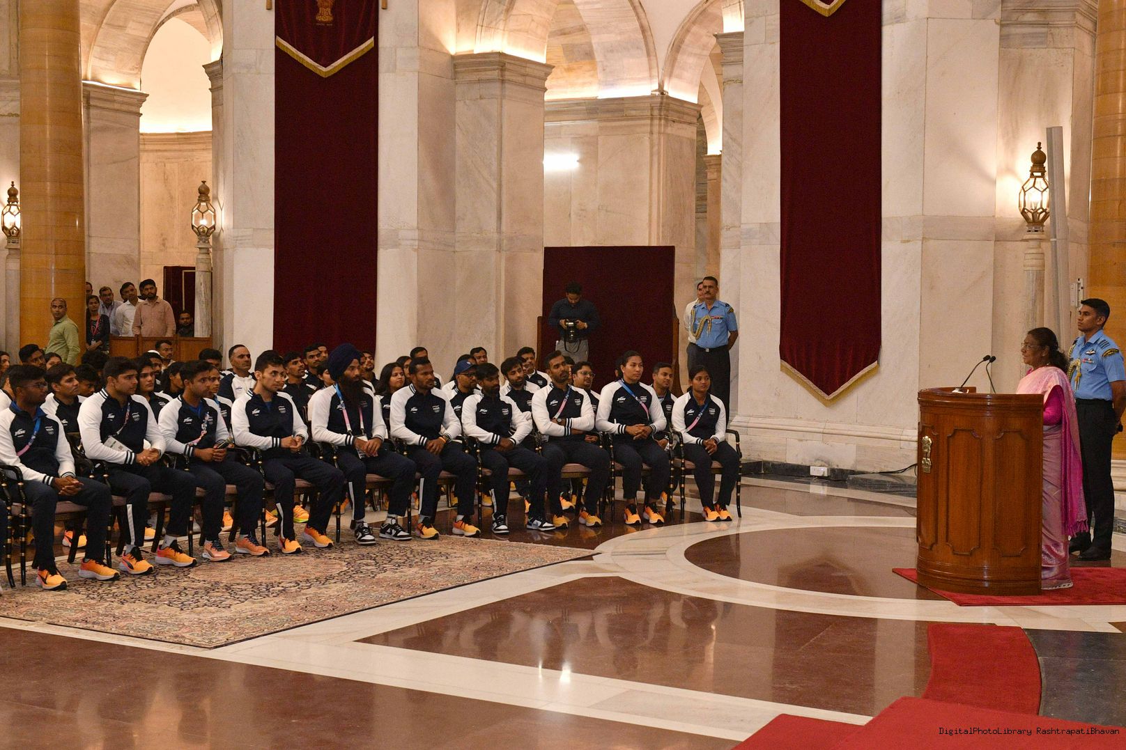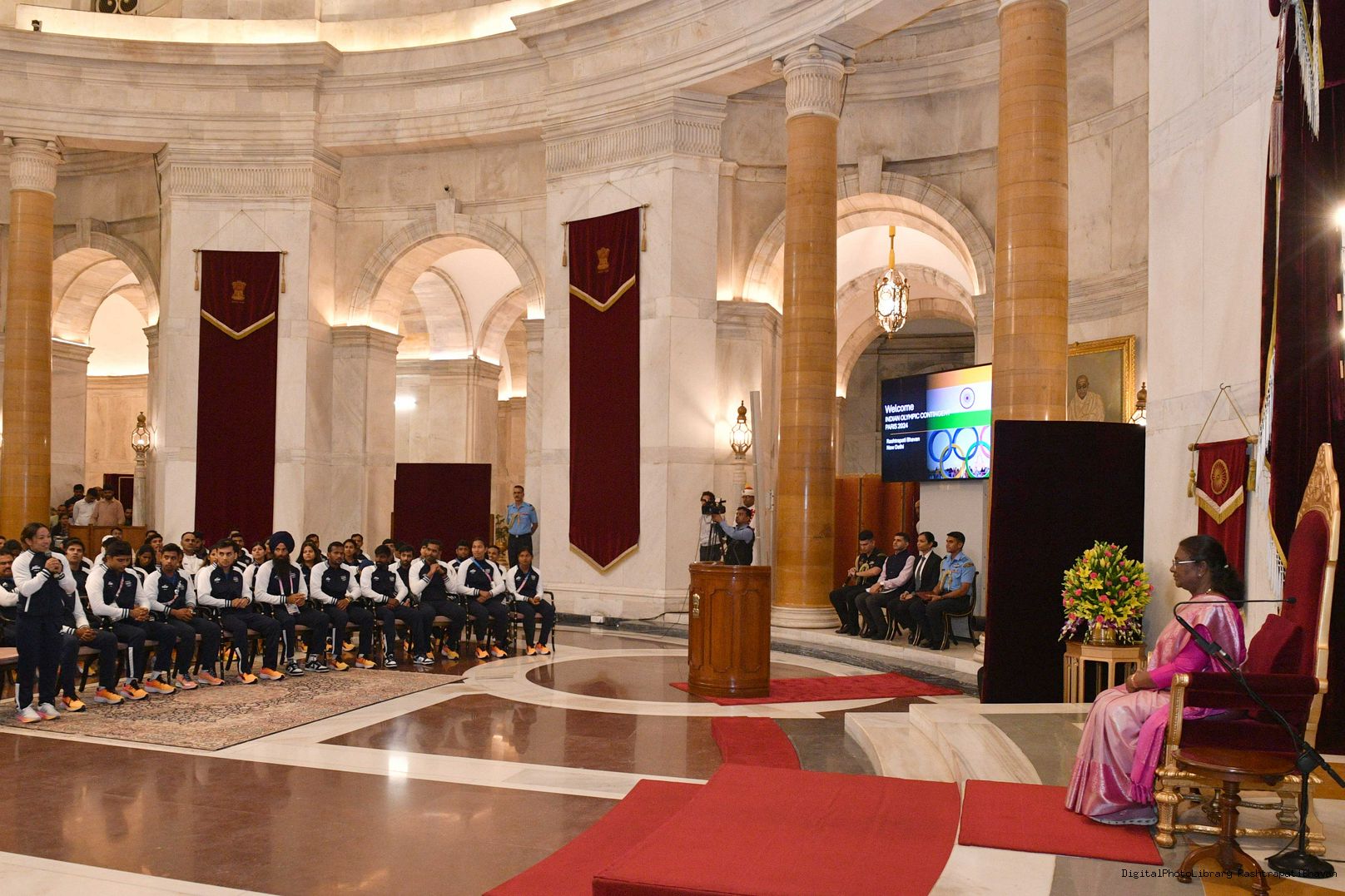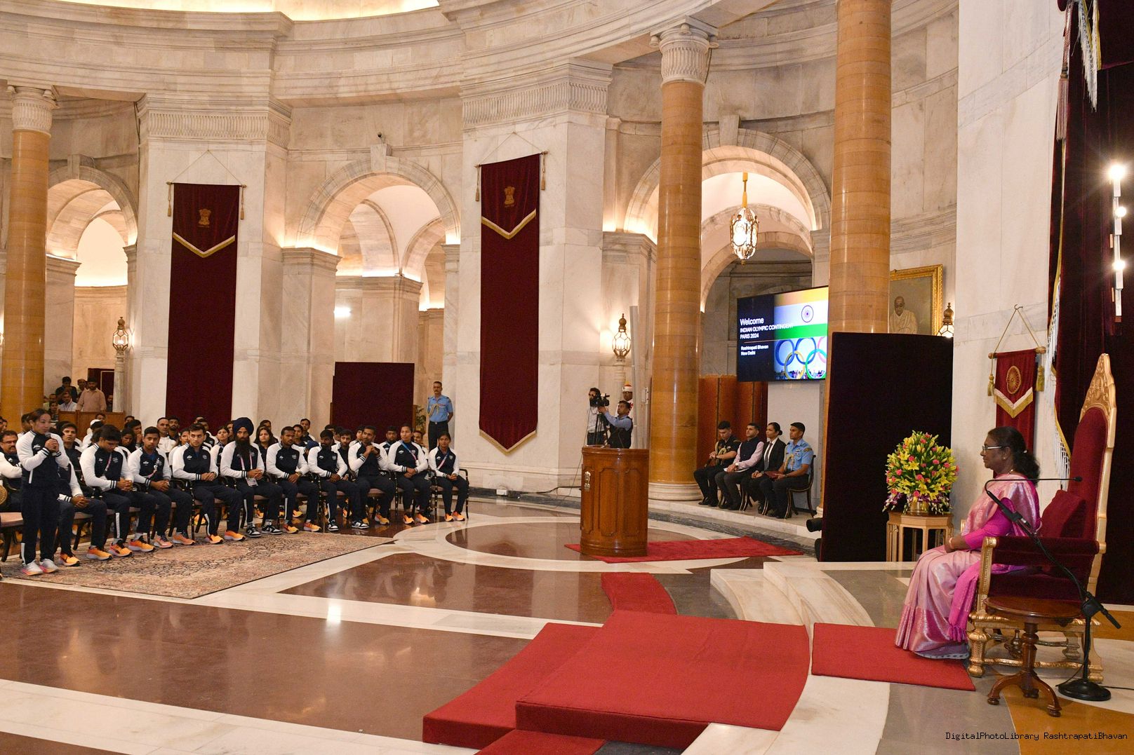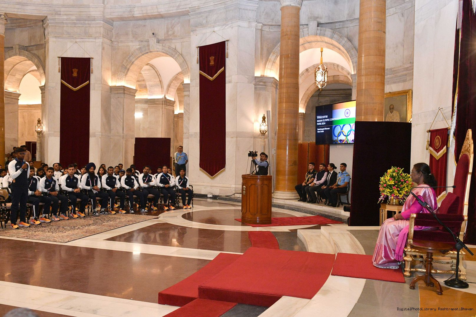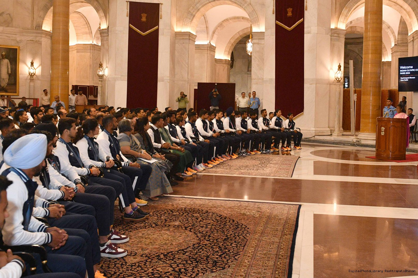 | Caption: | The President of India Smt. Droupadi Murmu met the Indian Contingent of the Paris Olympics 2024 at Ganatantra Mandap, Rashtrapati Bhavan on August 14, 2024. |