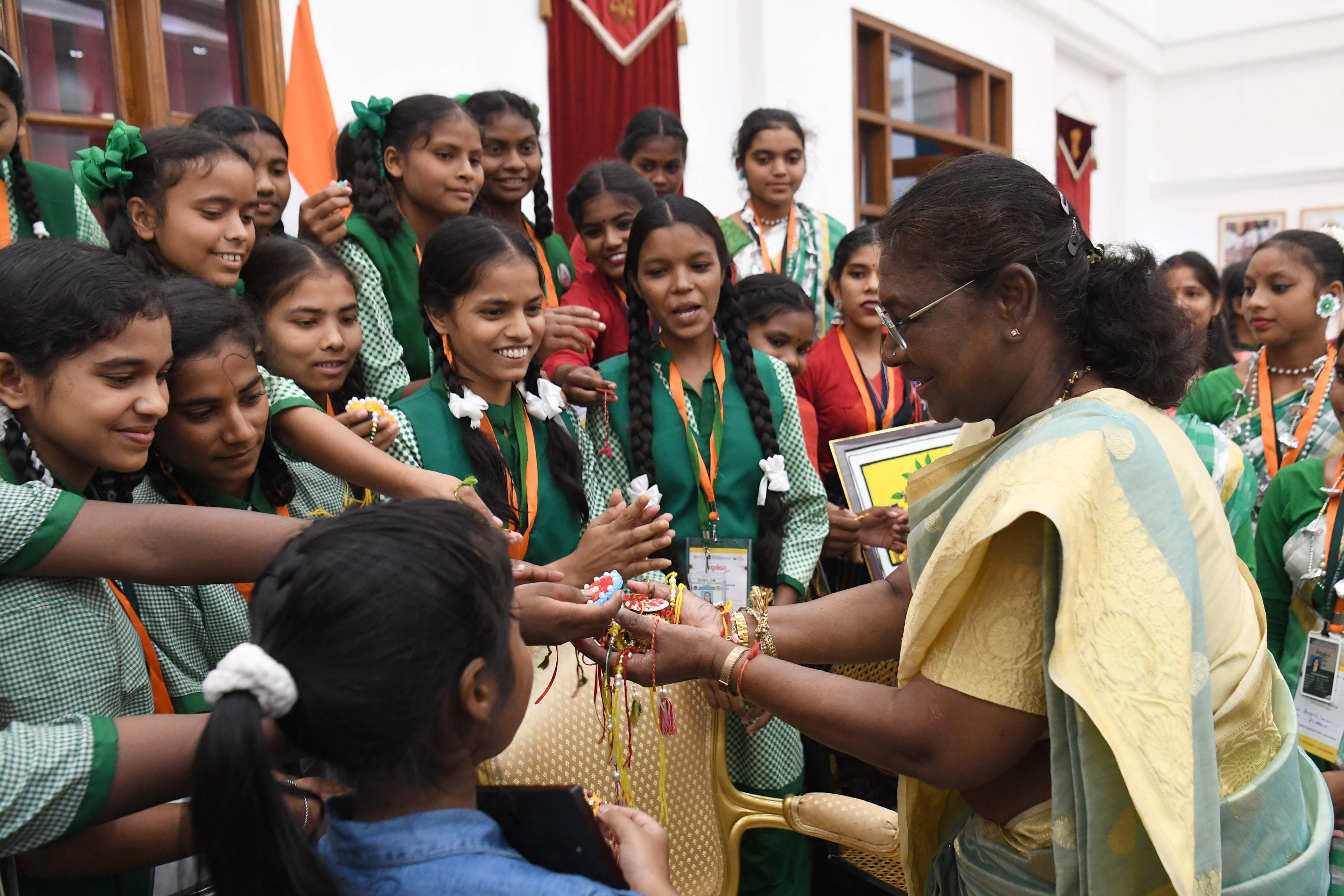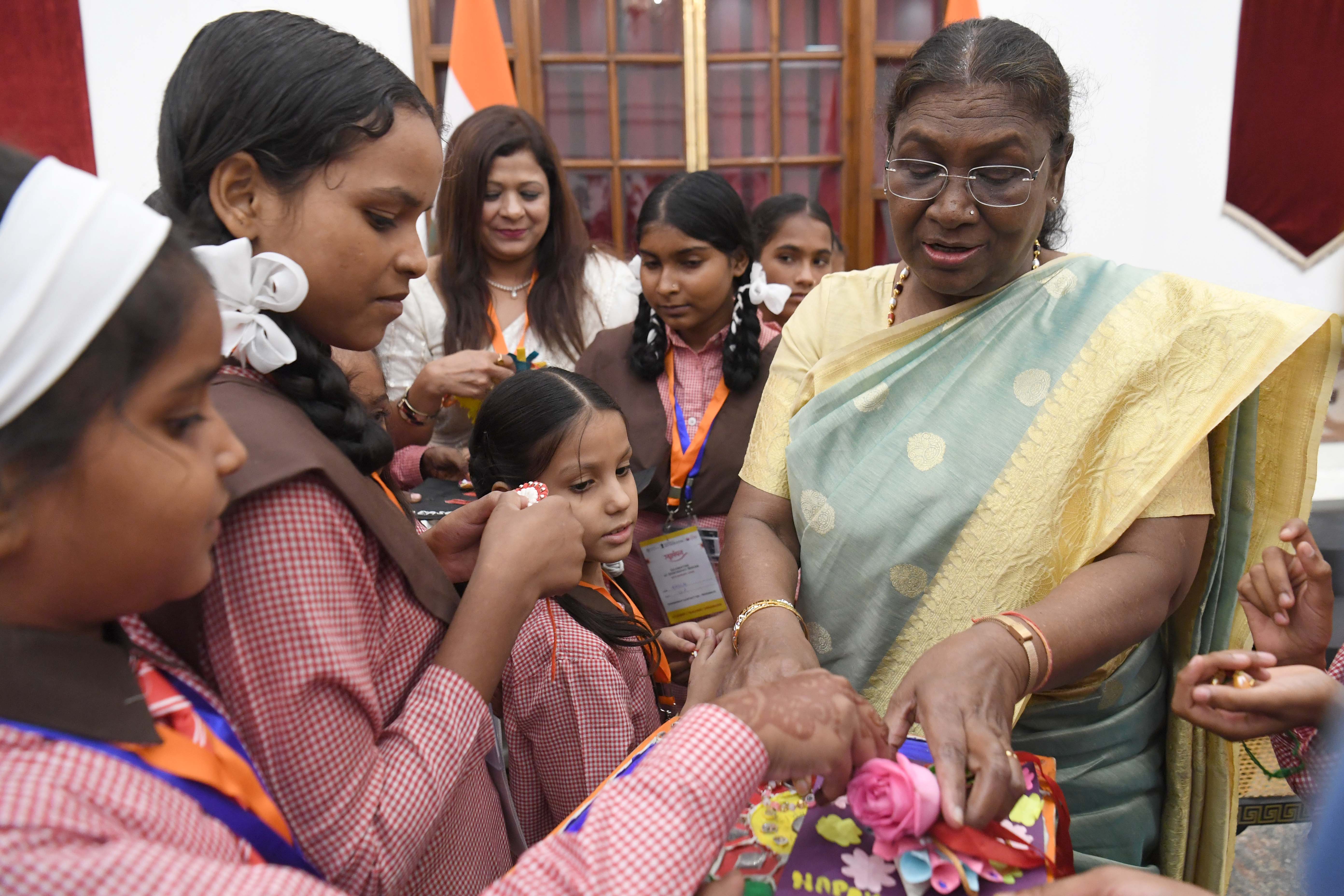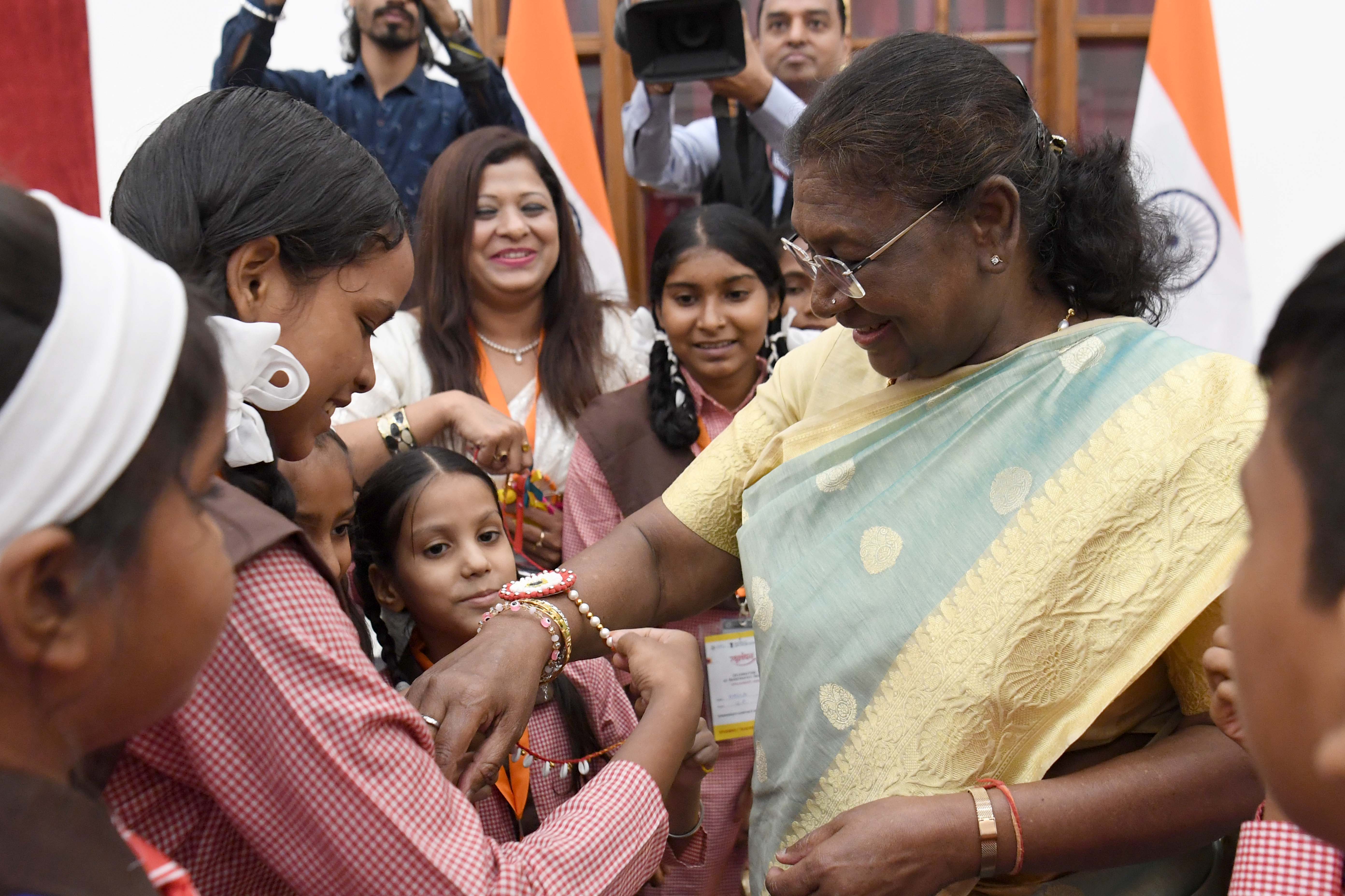 | Caption: | The President of India, Smt Droupadi Murmu interacting with the Children on the occasion of Raksha Bandhan at Rashtrapati Bhavan, New Delhi on August 19, 2024. |
