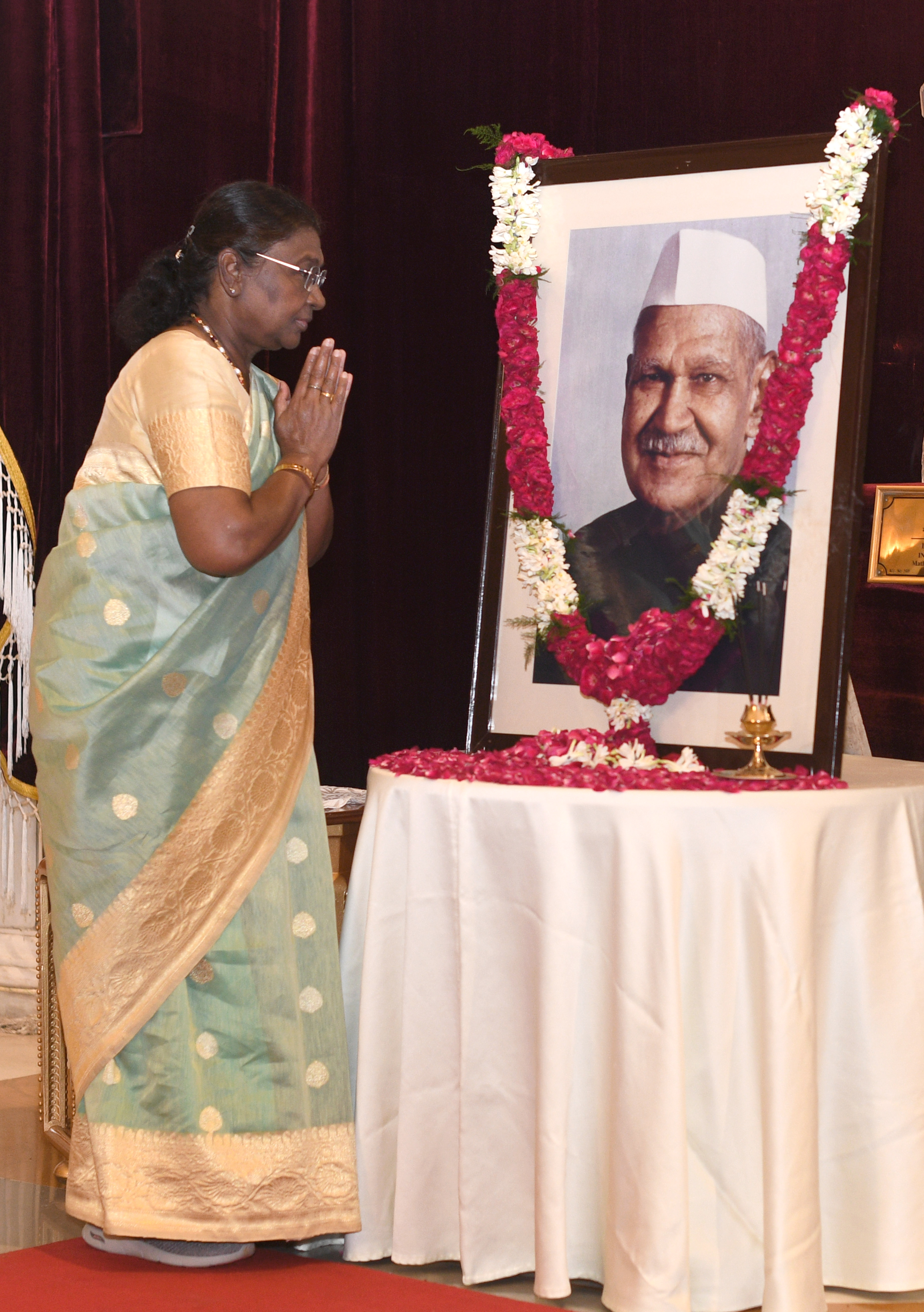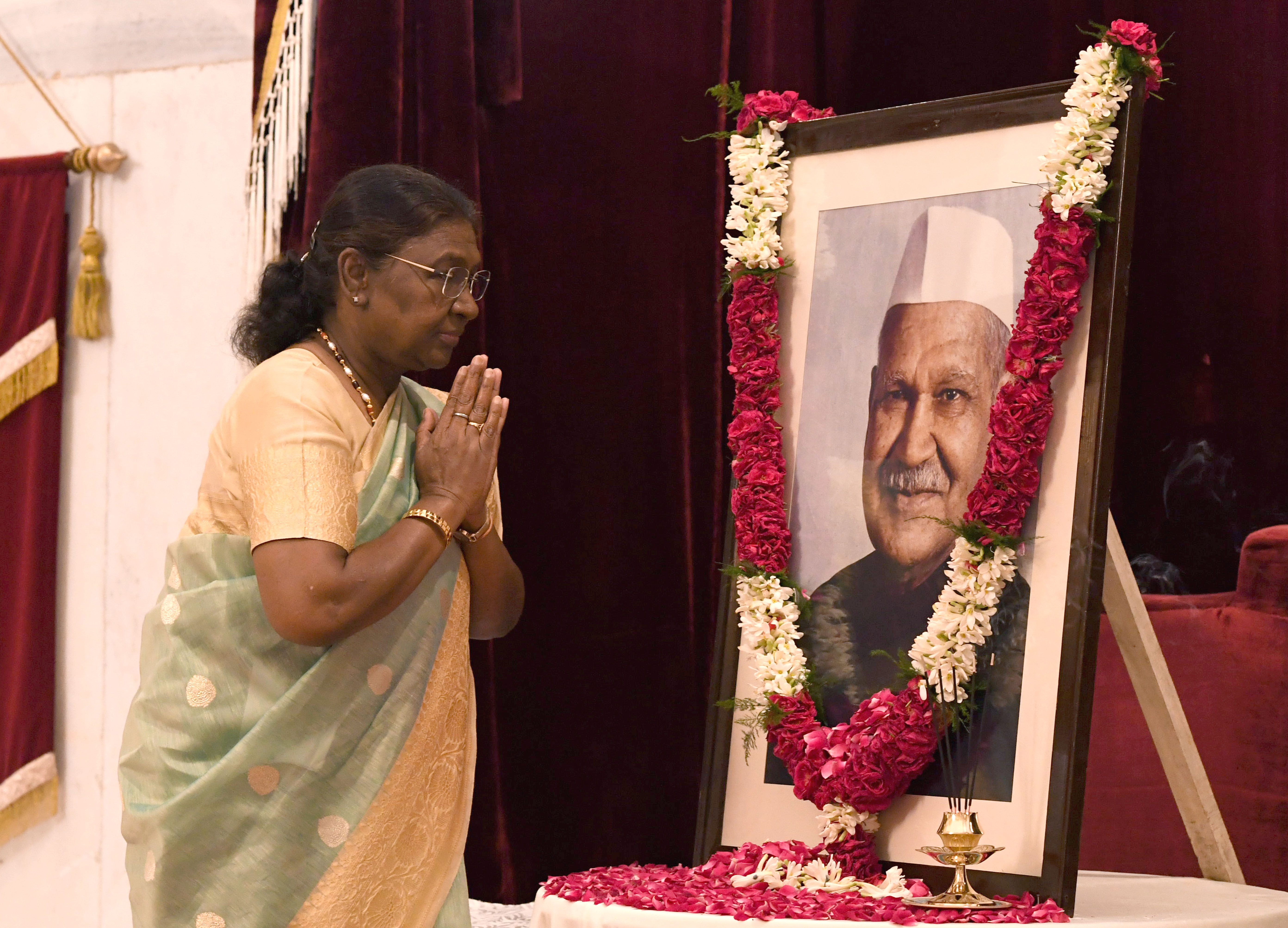 | Caption: | The President of India, Smt Droupadi Murmu paid floral tributes to Dr Shanker Dayal Sharma, former President of India, on his birth anniversary at Rashtrapati Bhavan on August 19, 2024. |