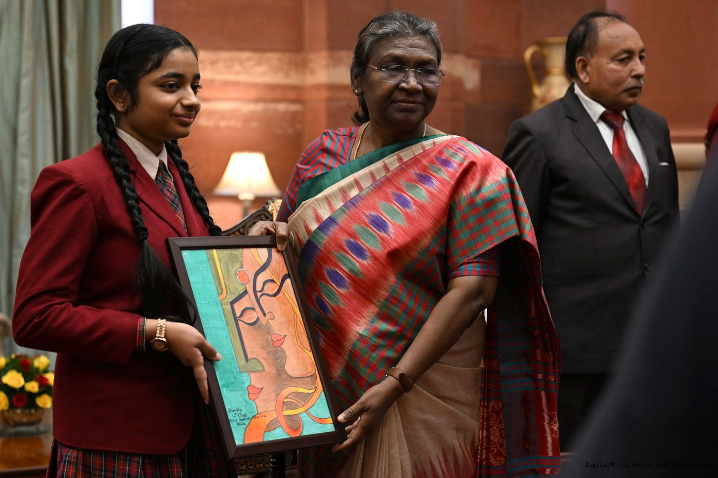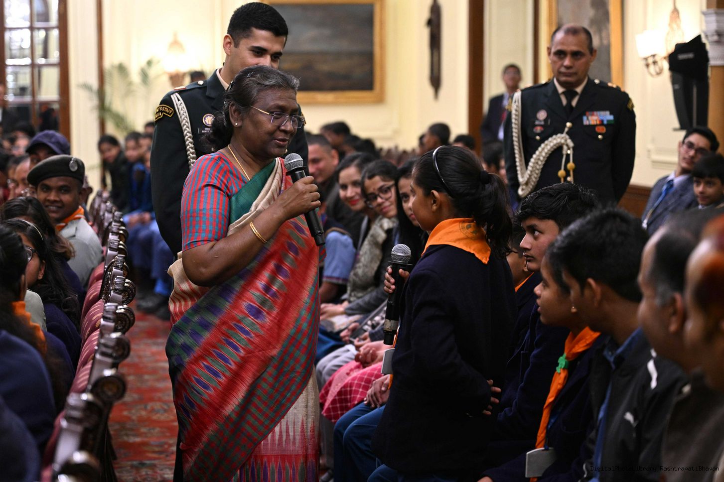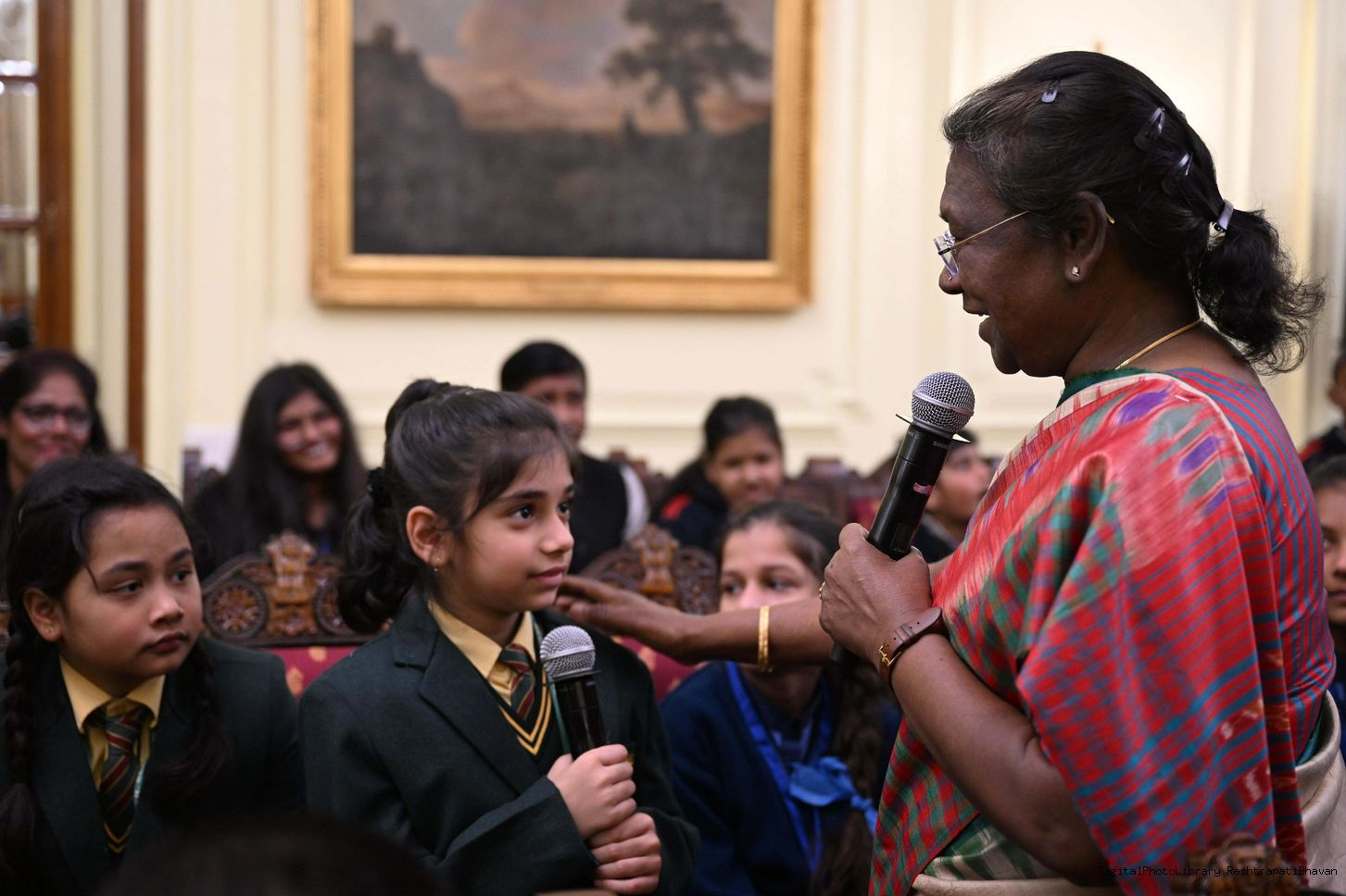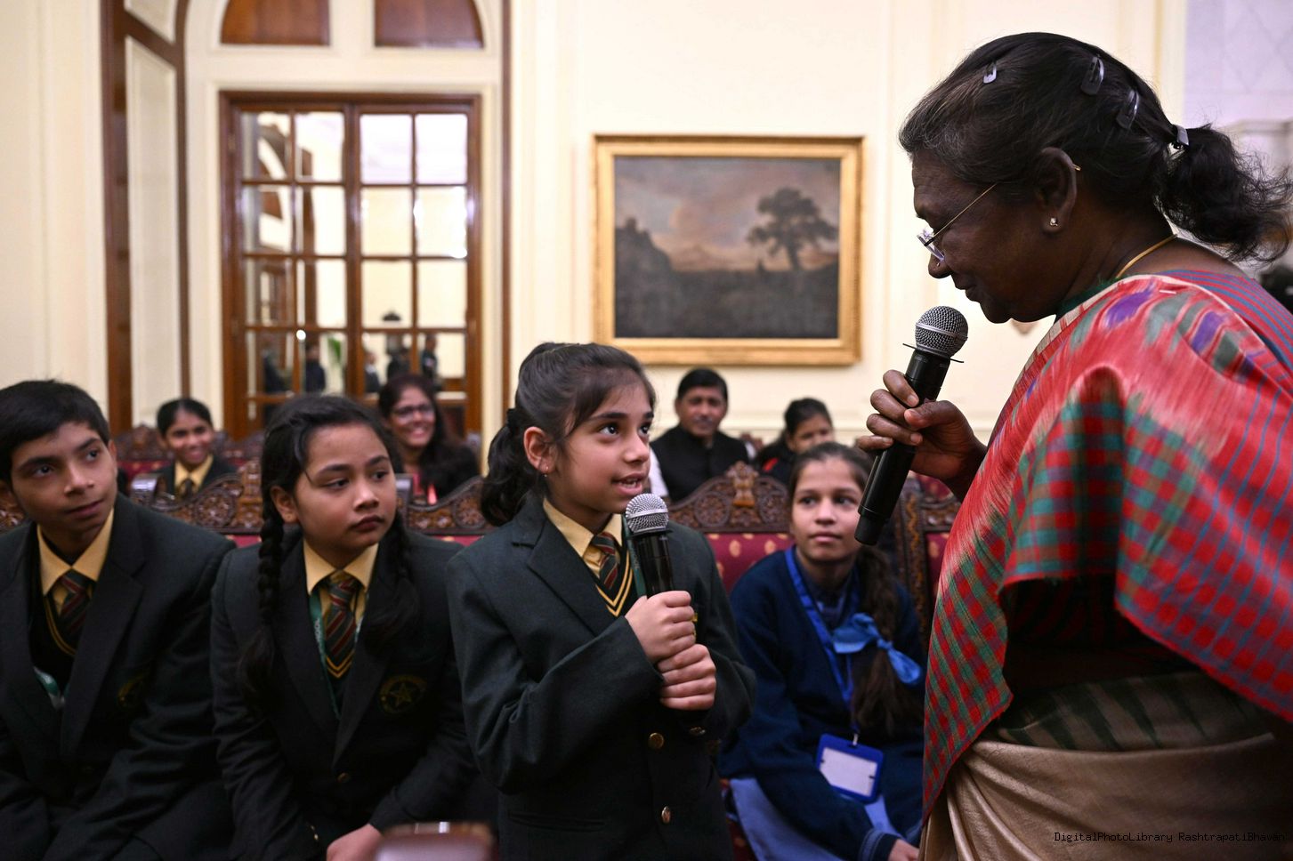 | Caption: | The President of India, Smt. Droupadi Murmu received New Year greetings from students of various schools at Rashtrapati Bhavan on January 01, 2023. |