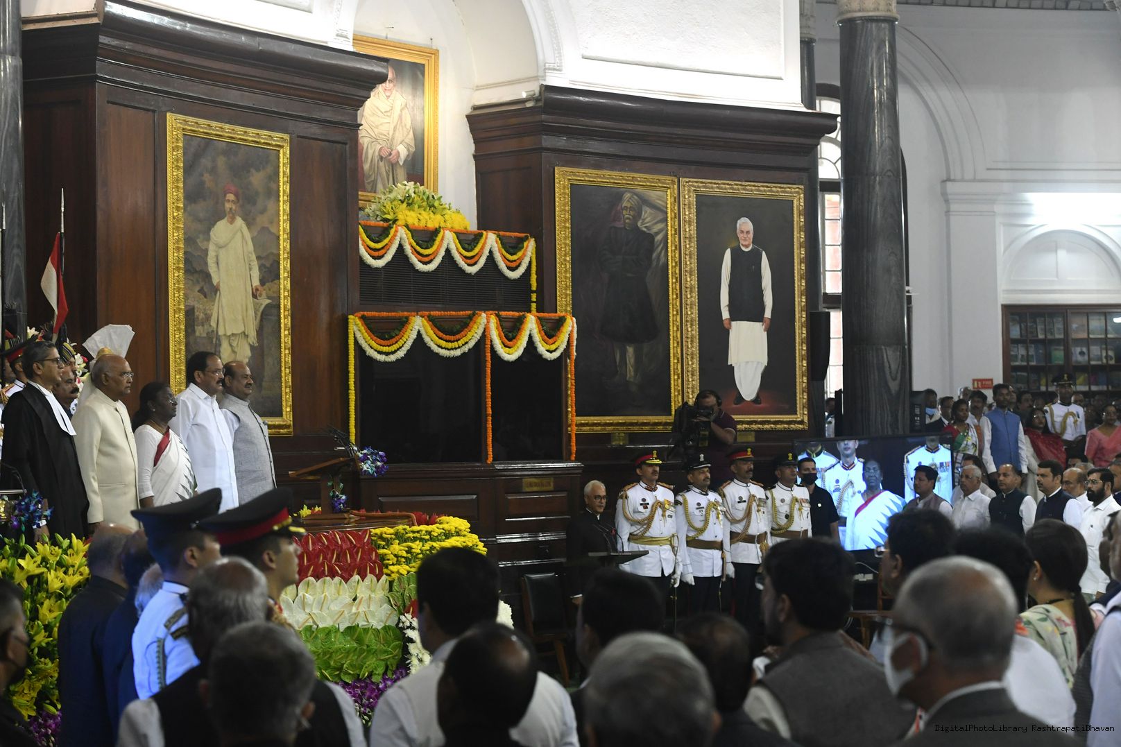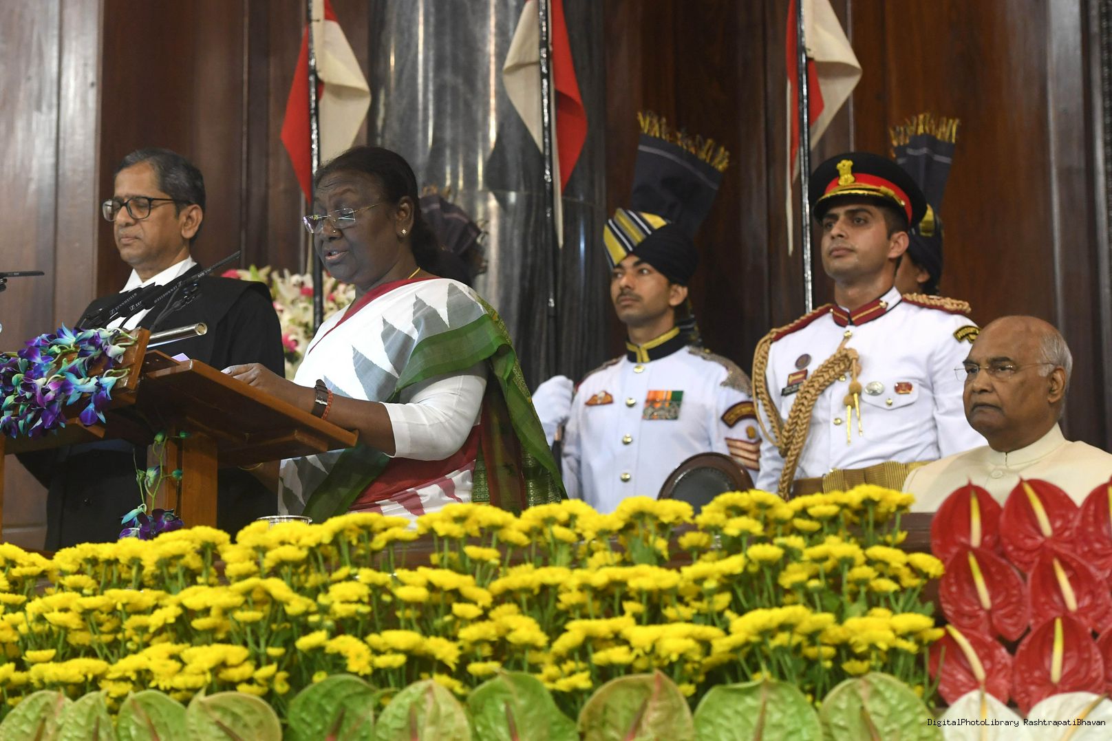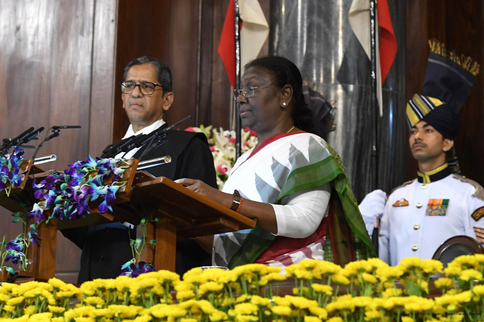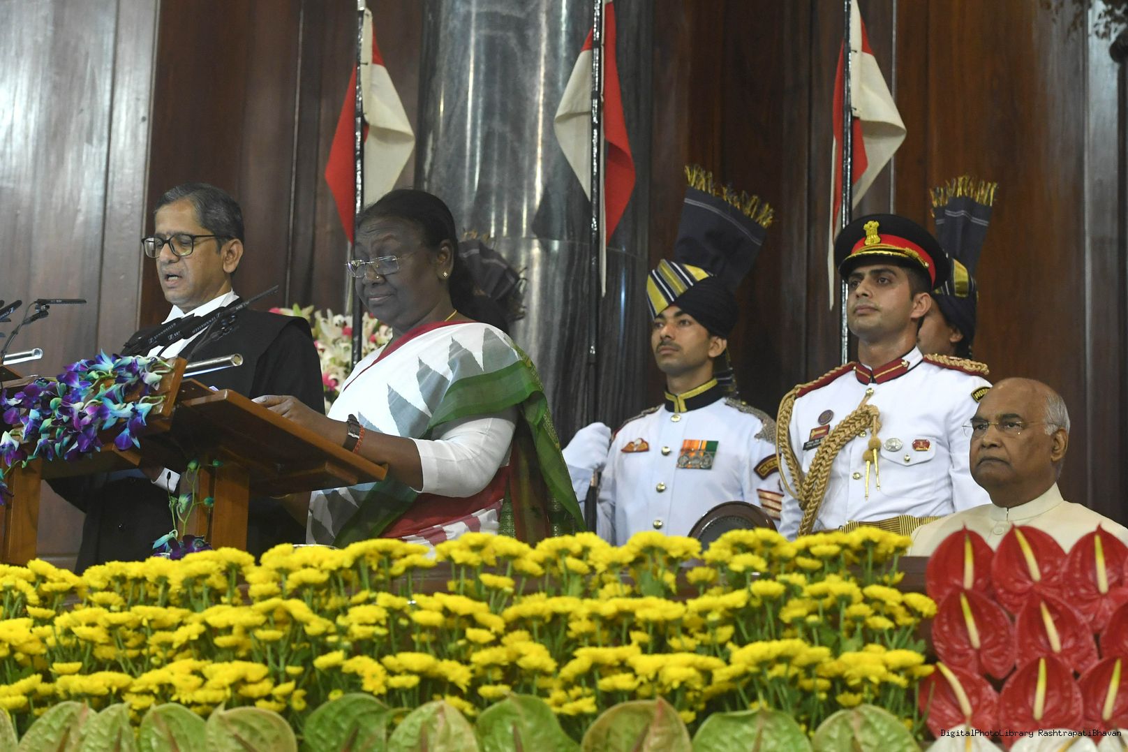 | Caption: | The Chief Justice of India, Shri Justice N.V. Ramana administered the oath of the office of the President of India to Smt. Droupadi Murmu, at a swearing-in ceremony in the central hall of Parliament, New Delhi on July 25, 2022. |