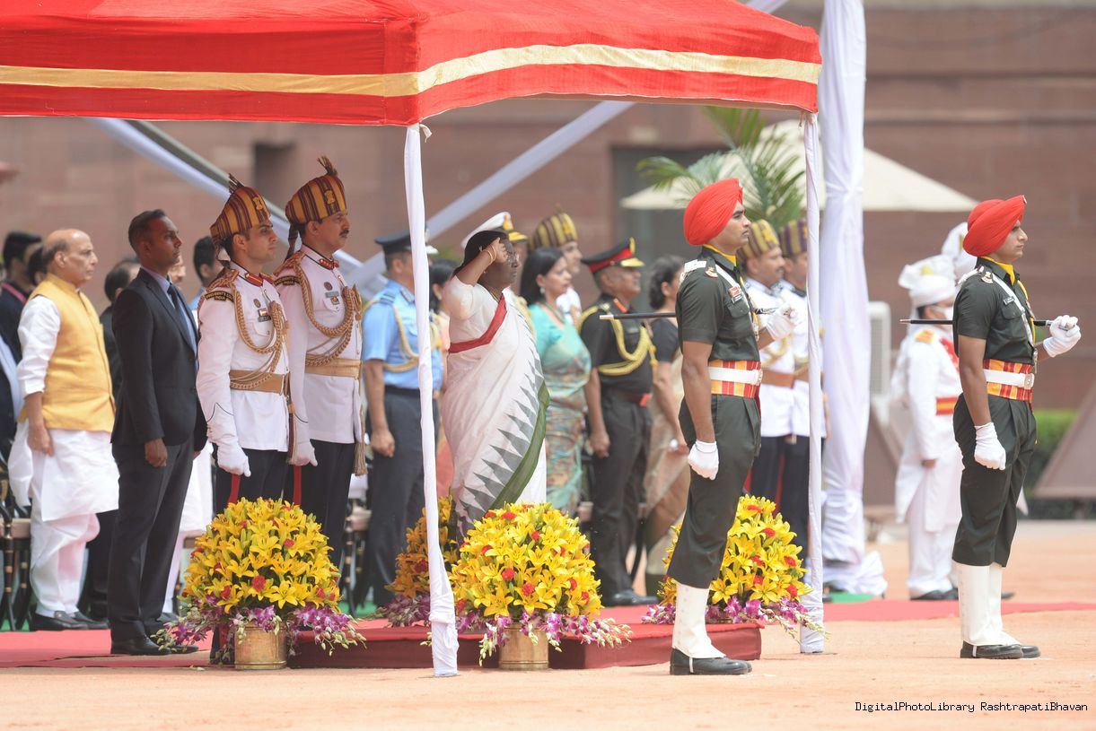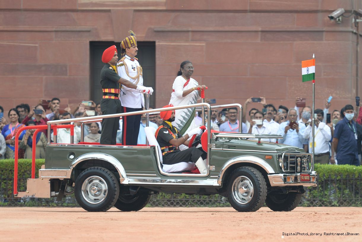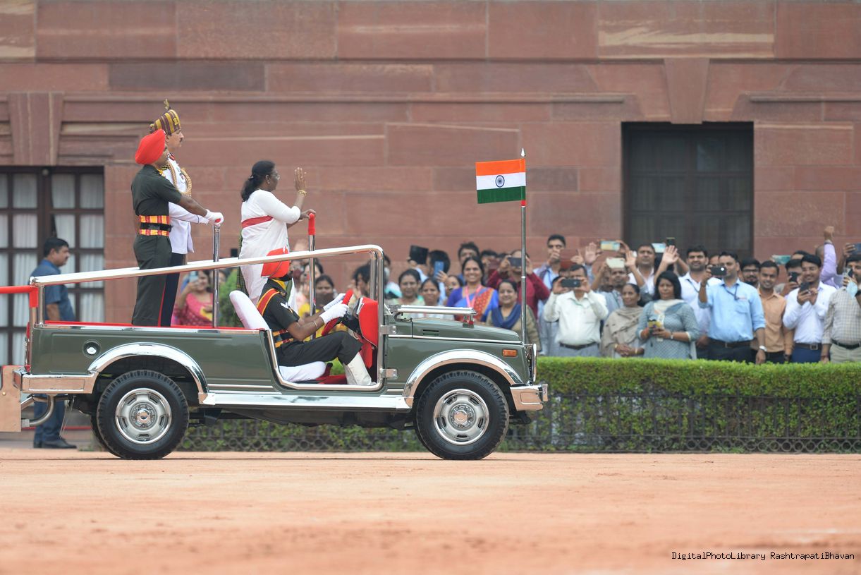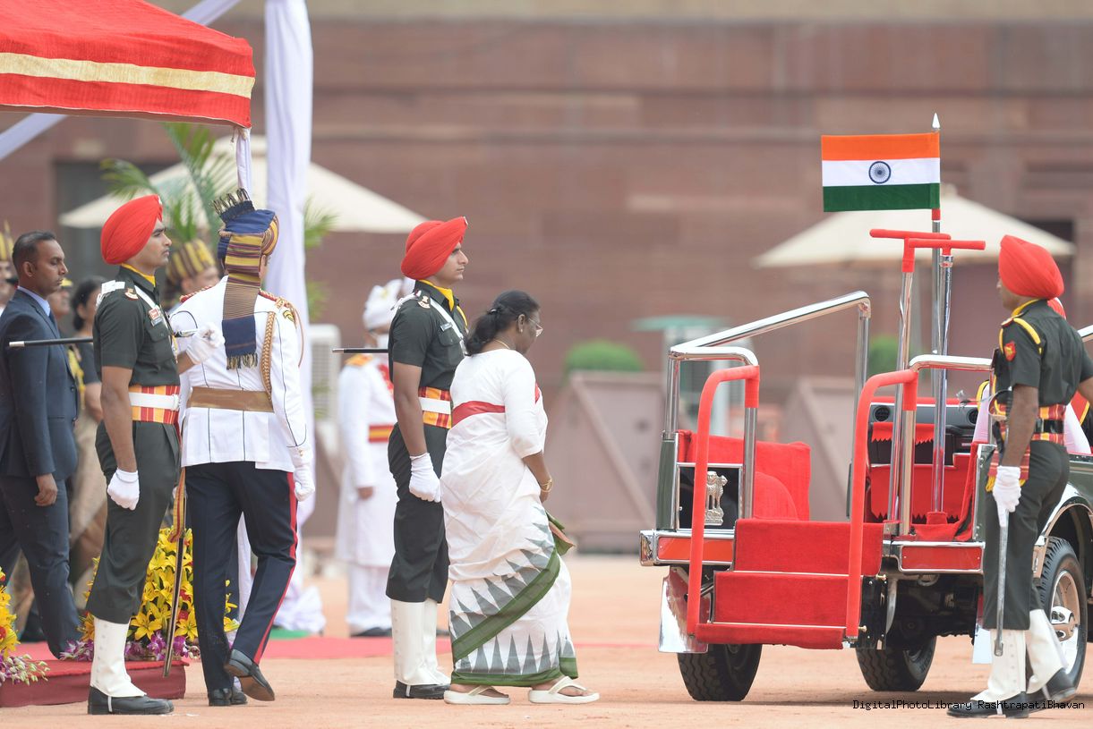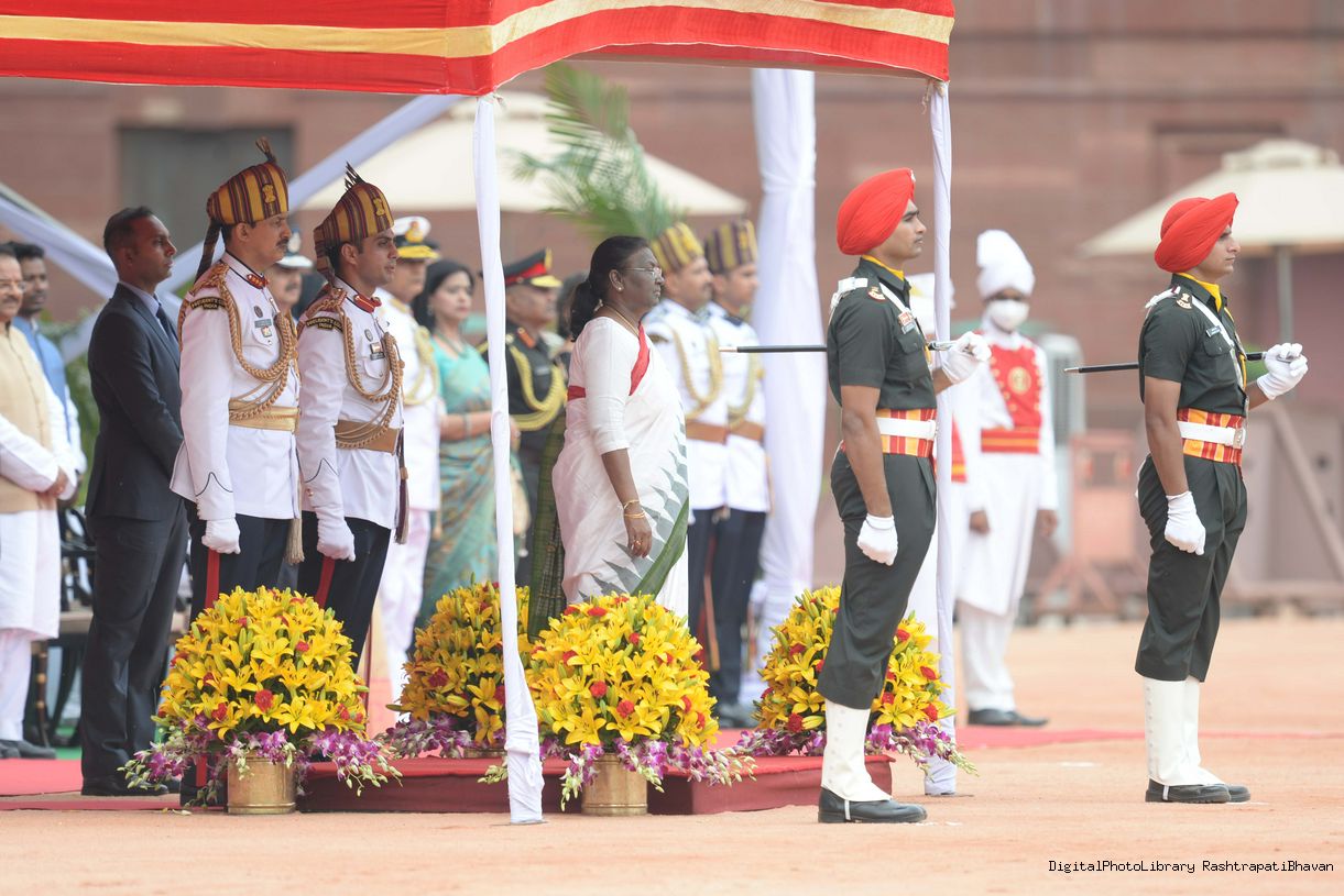 | Caption: | The President of India, Smt. Droupadi Murmu taking the National Salute and inspecting the Tri Services Guard of Honour, at Rashtrapati Bhavan on July 25, 2022. |