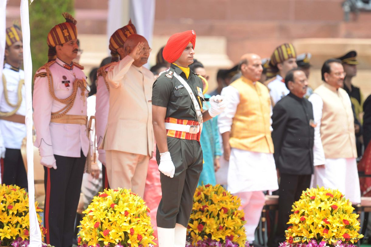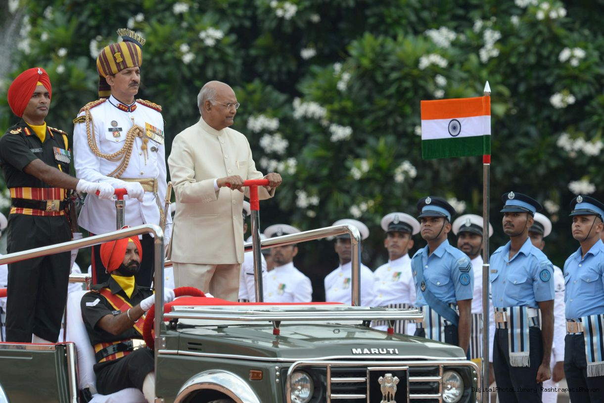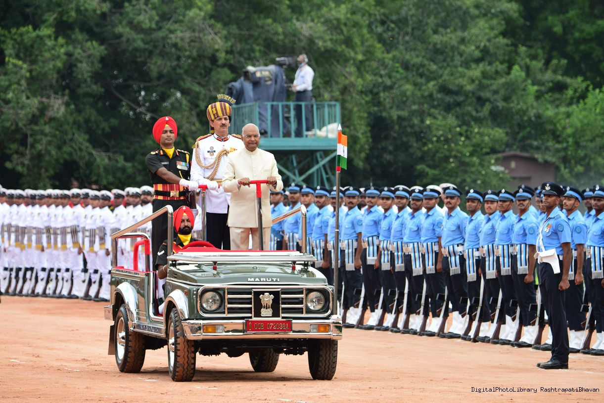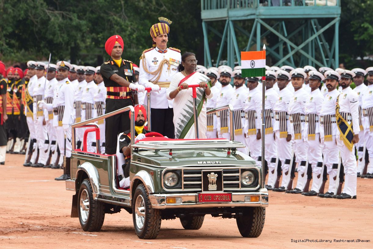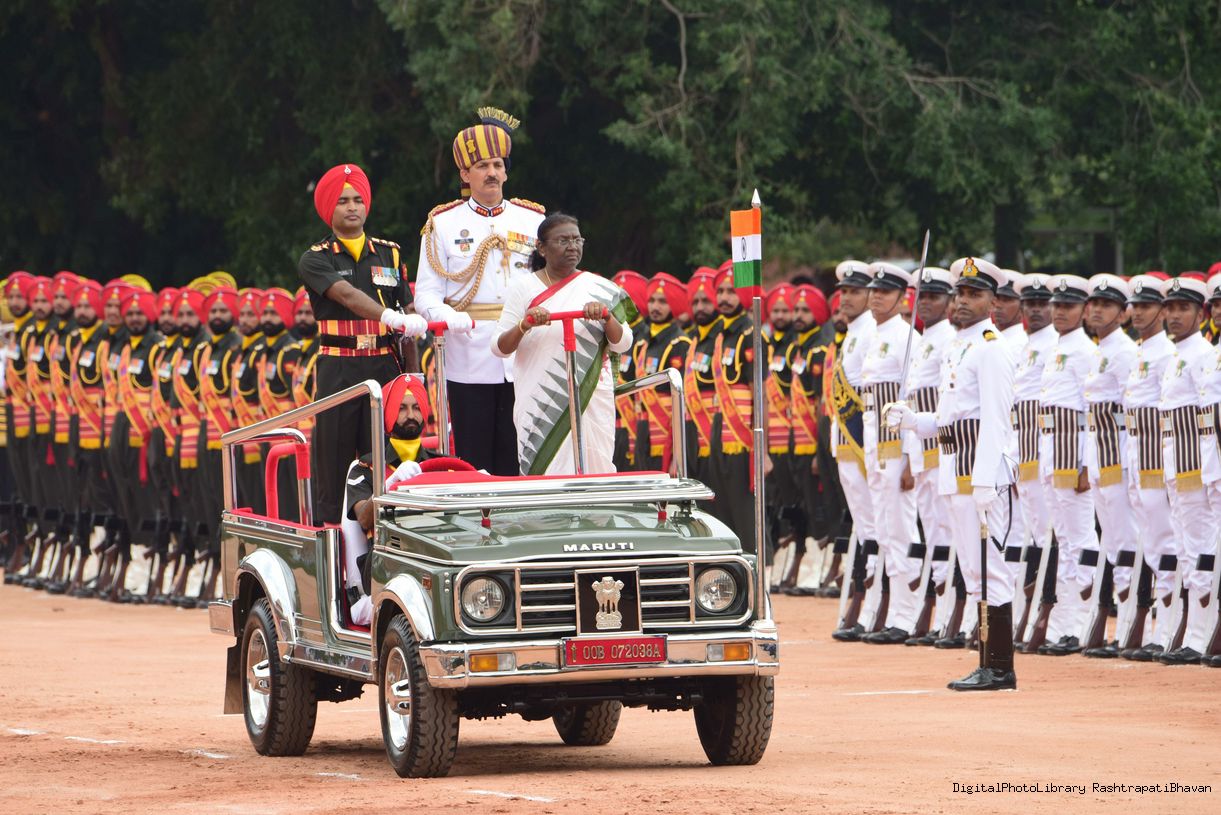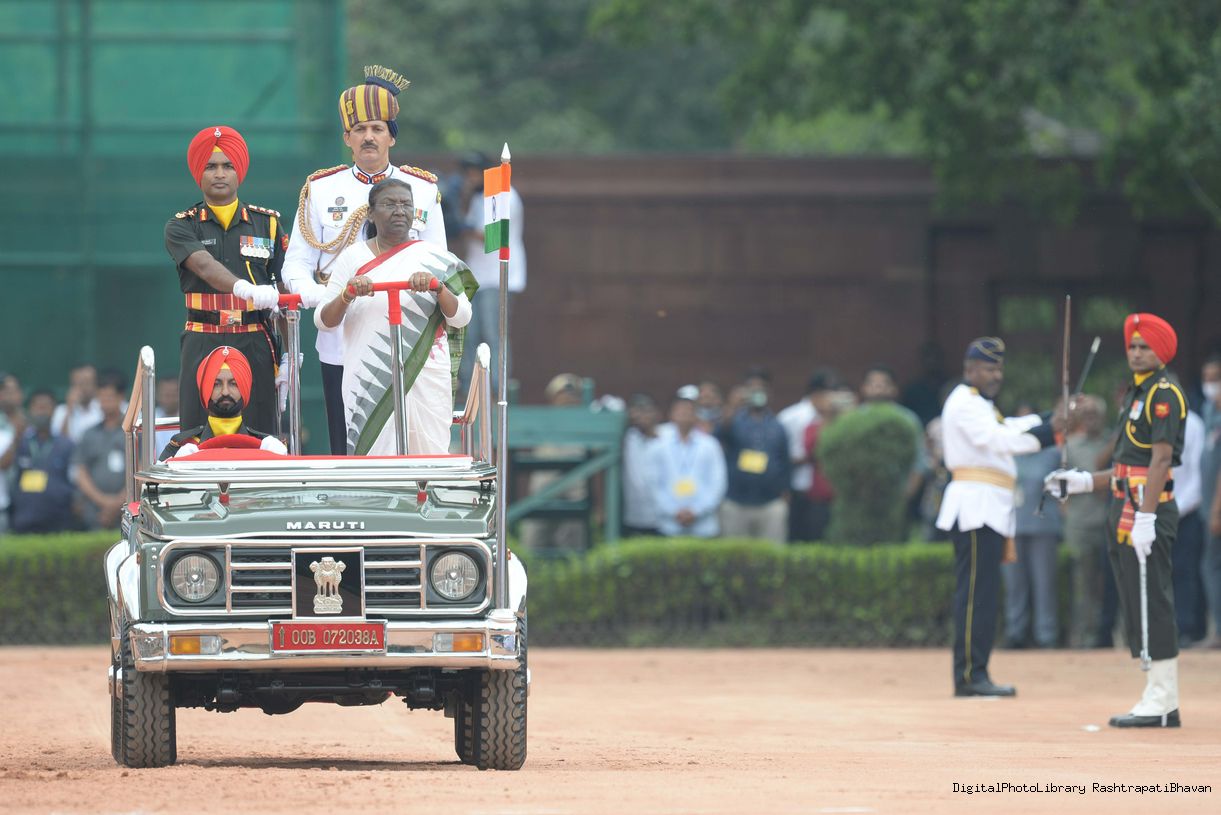 | Caption: | The President of India, Smt. Droupadi Murmu taking the National Salute and inspecting the Tri Services Guard of Honour, at Rashtrapati Bhavan on July 25, 2022. |