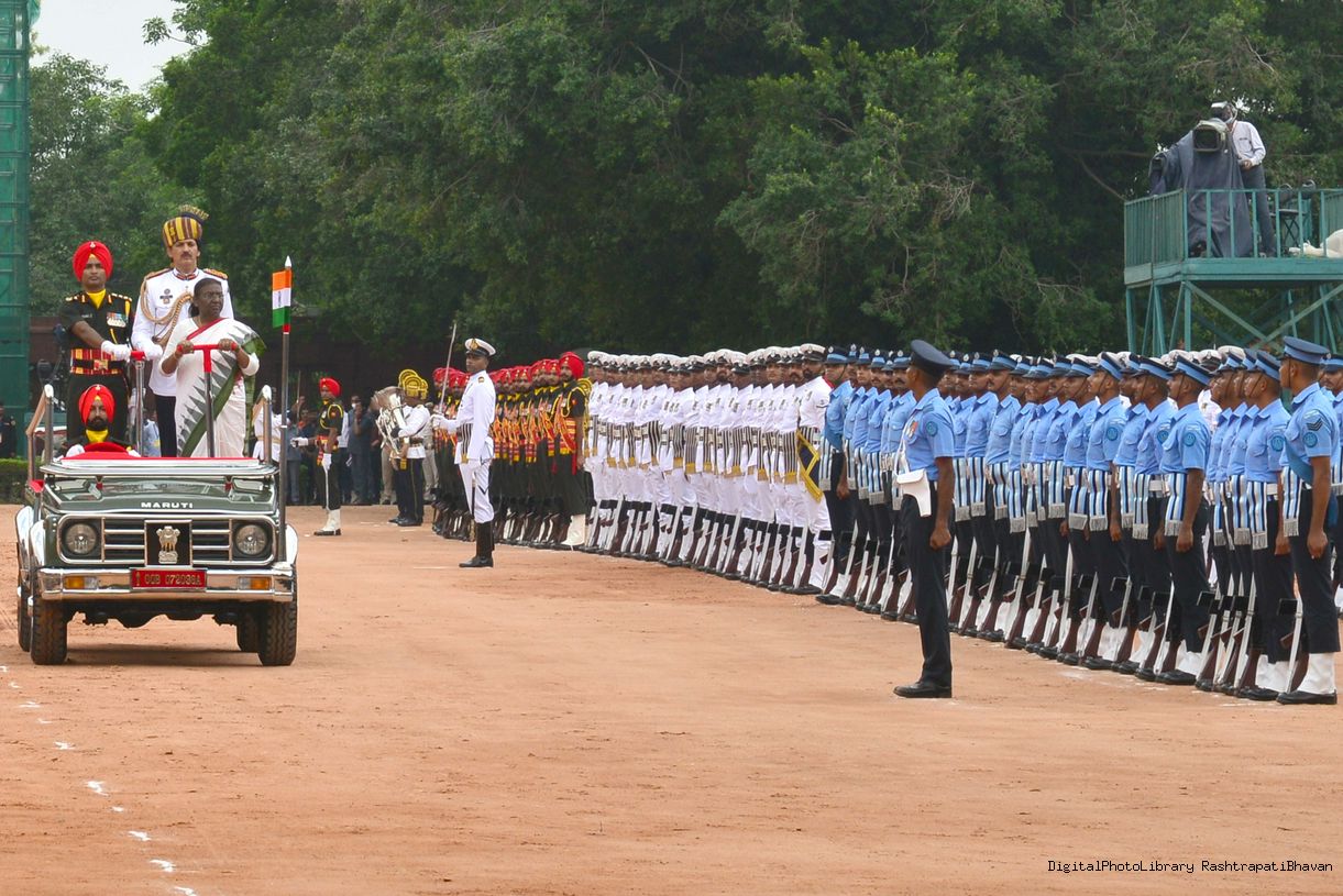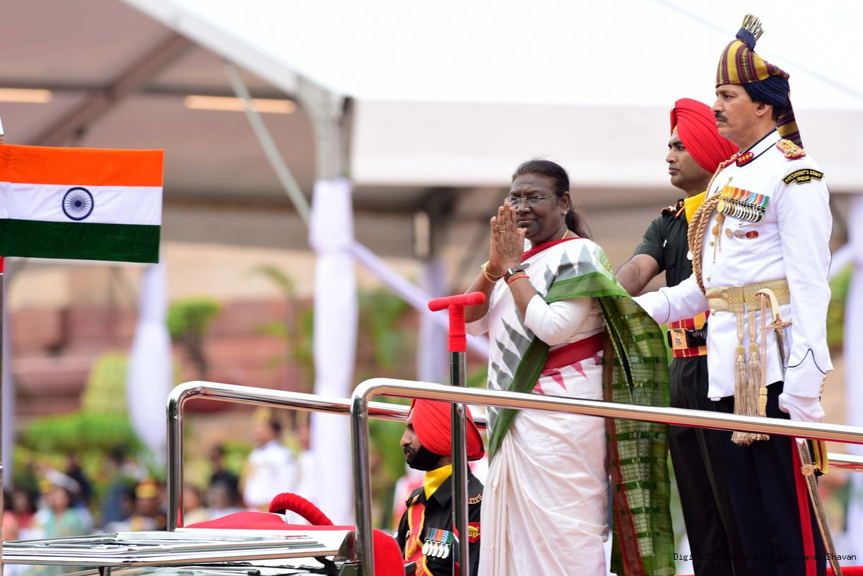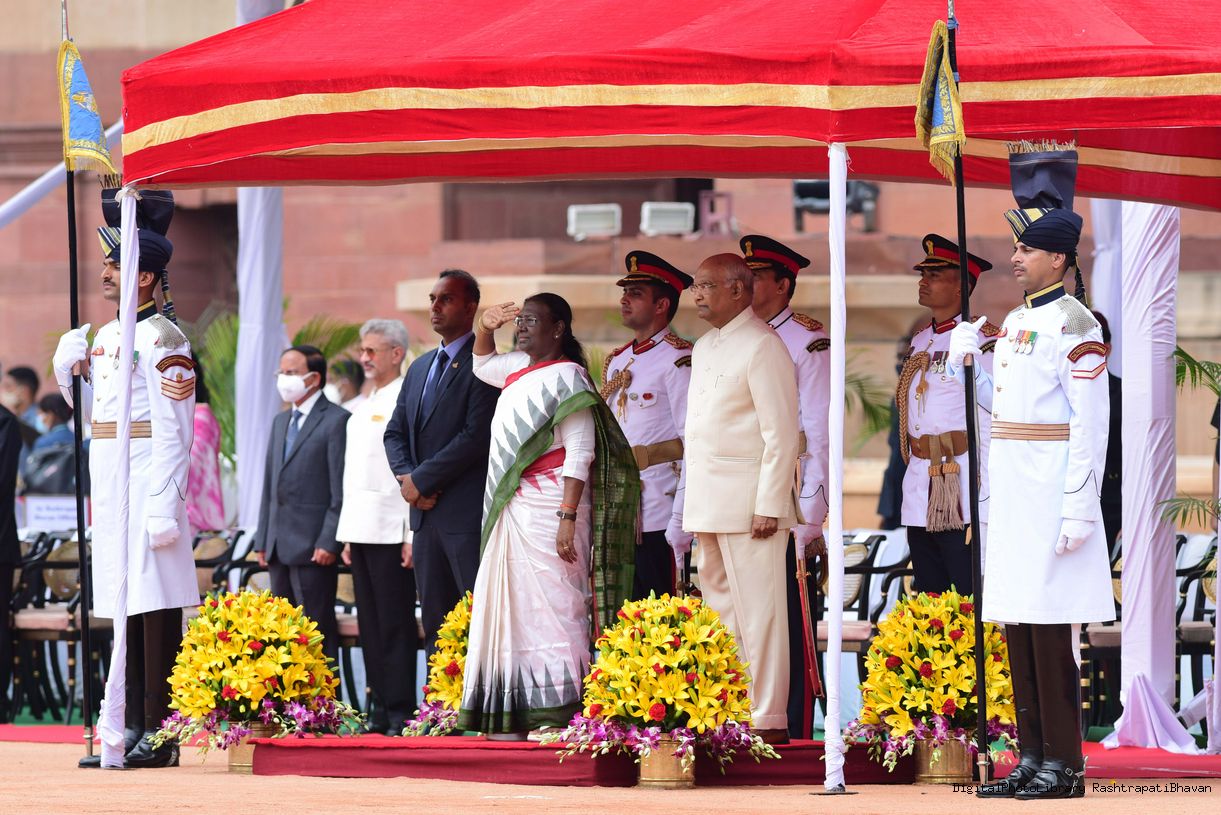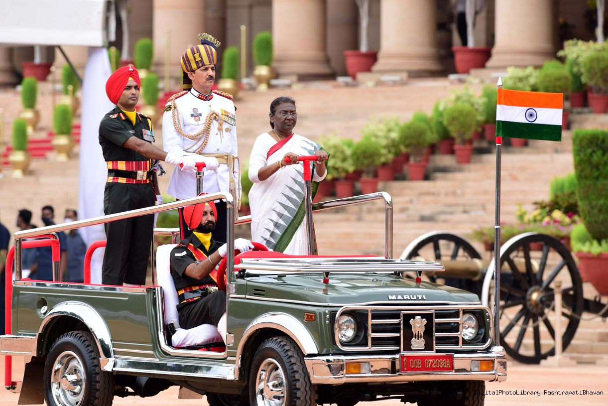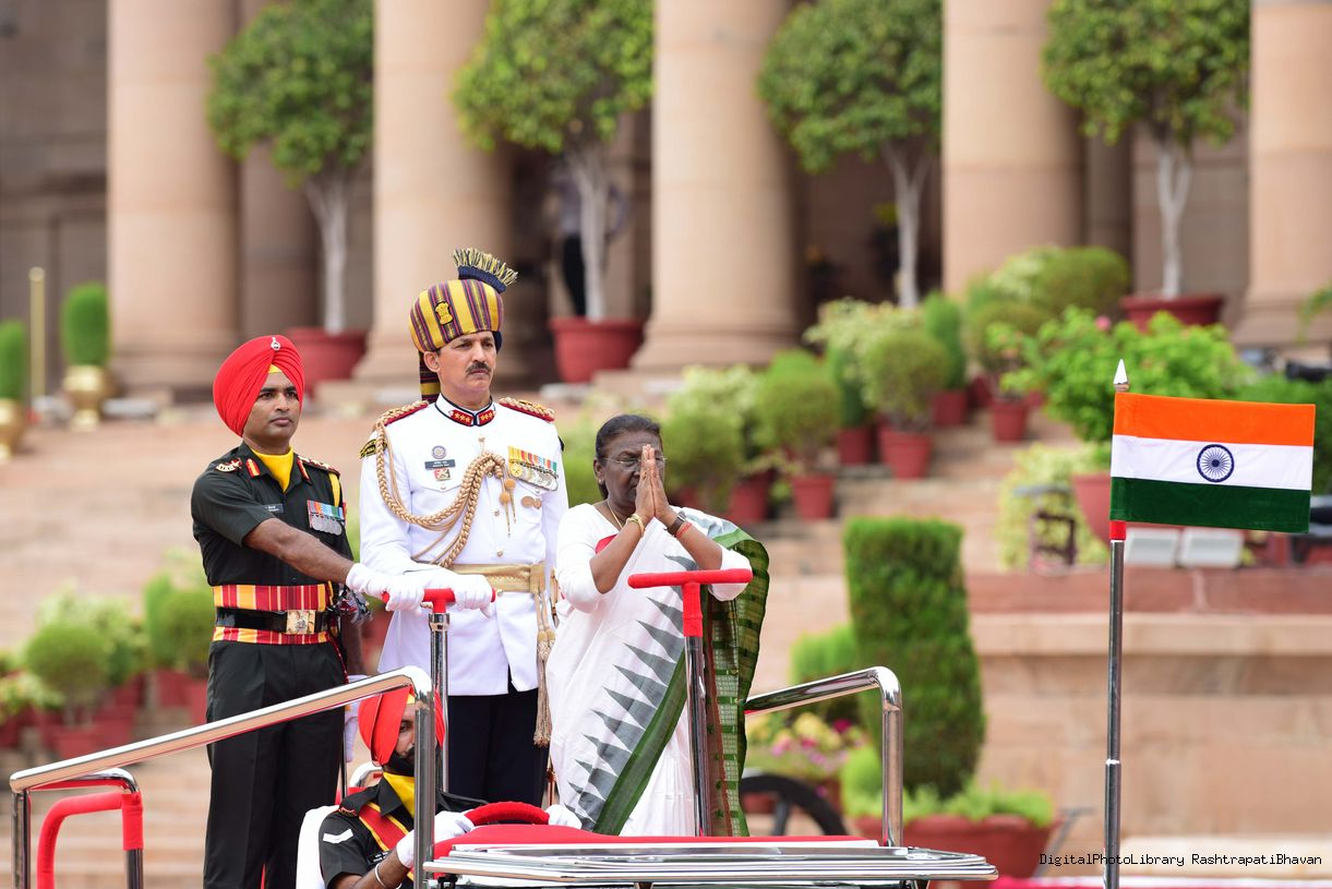 | Caption: | The President of India, Smt. Droupadi Murmu taking the National Salute and inspecting the Tri Services Guard of Honour, at Rashtrapati Bhavan on July 25, 2022. |