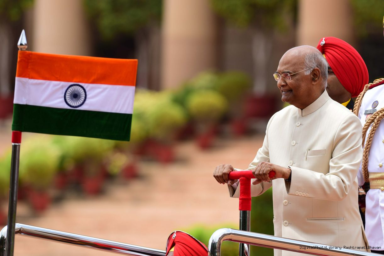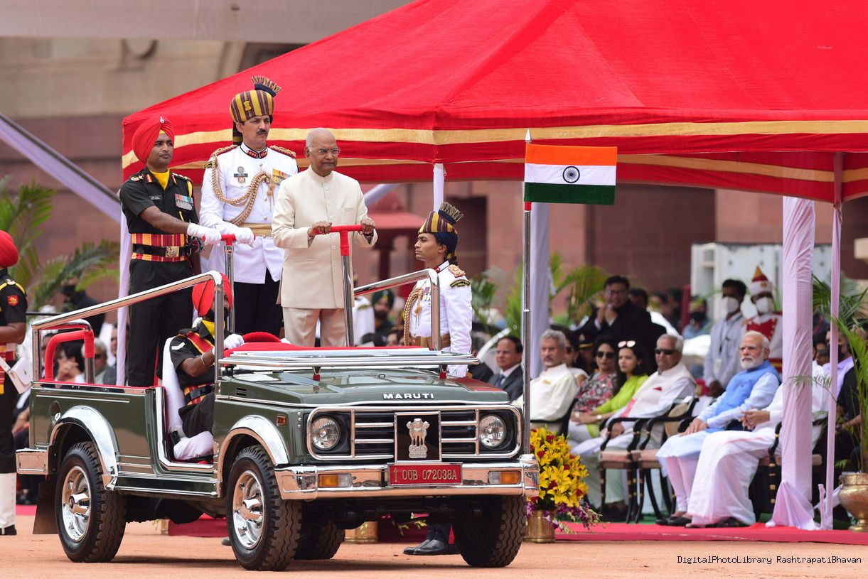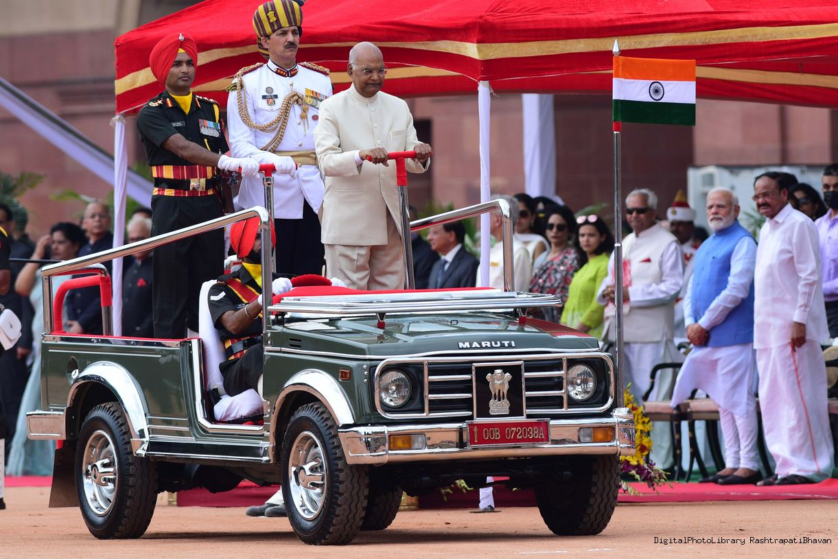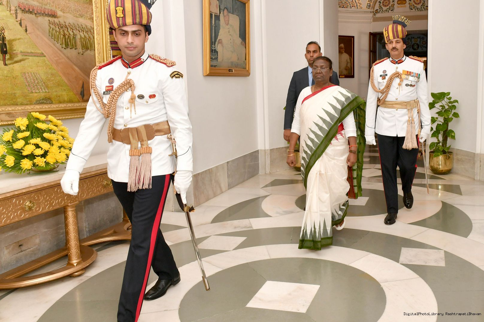 | Caption: | The President of India, Smt. Droupadi Murmu taking the National Salute and inspecting the Tri Services Guard of Honour, at Rashtrapati Bhavan on July 25, 2022. |