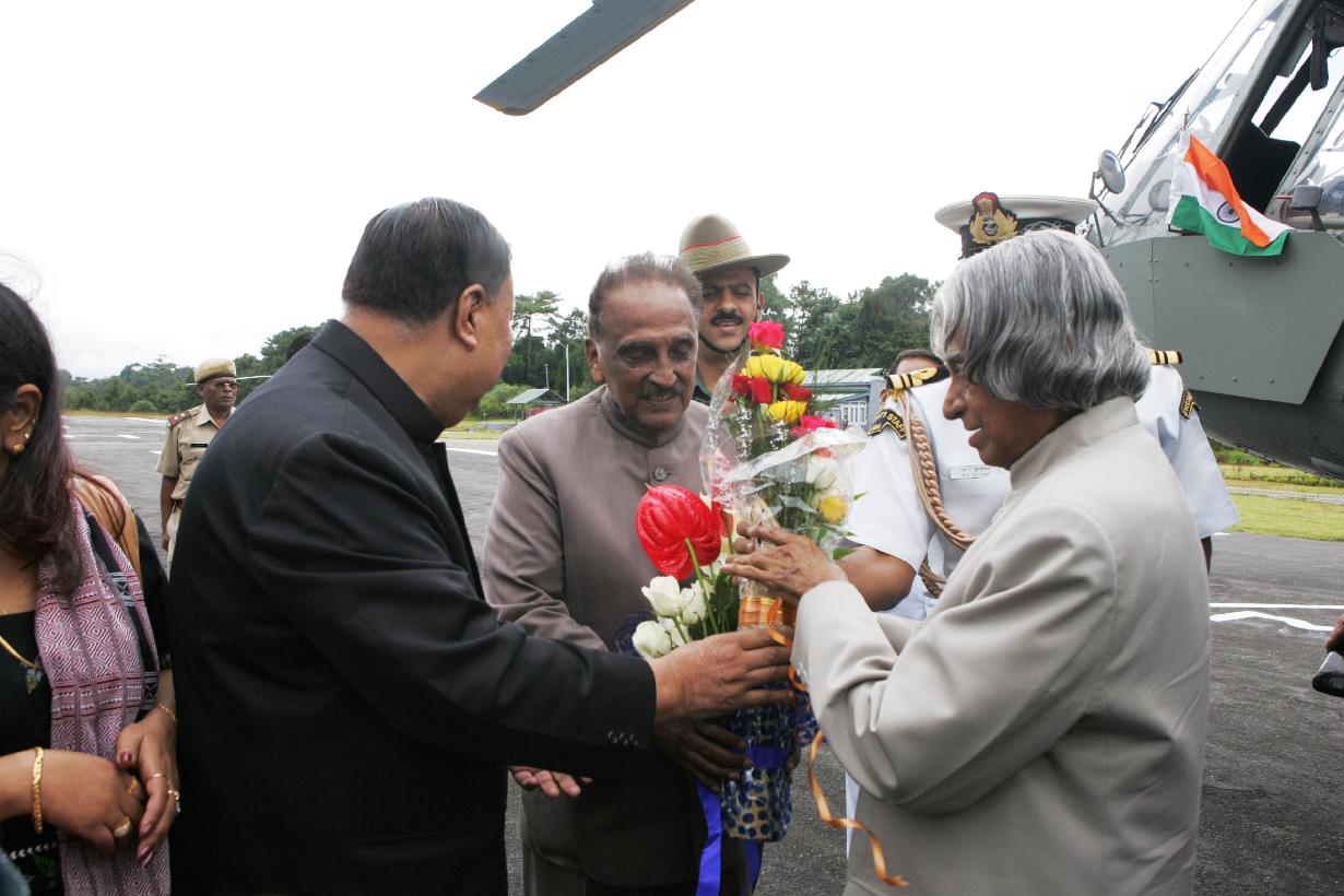 | Caption: | The President of India, Dr A P J Abdul Kalam being received by the Governor of Meghalaya, Shri M M Jacob and the Chief Minister of Meghalaya, Shri D D Lapang at Shillong Helipad in Meghalaya on Sep 23, 2005 |