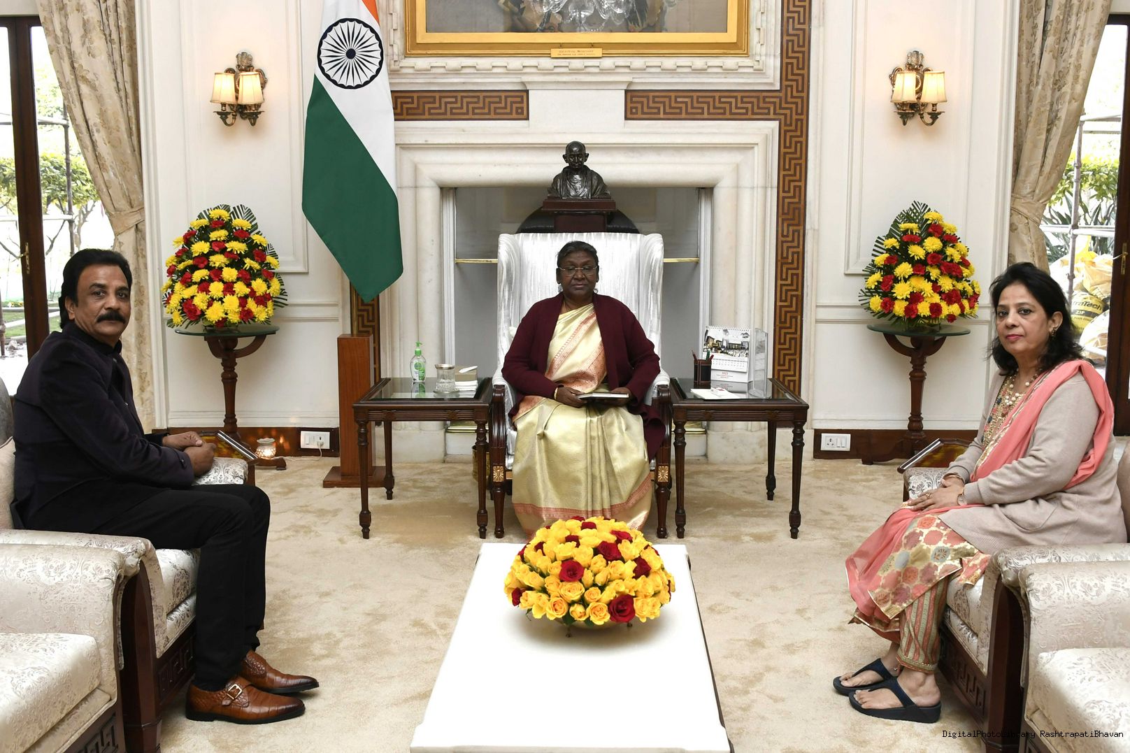 | Caption: | Shri Kishore Jain along with his wife meeting with the President of India Smt. Droupadi Murmu at Rashtrapati Bhavan on January 20, 2023. |