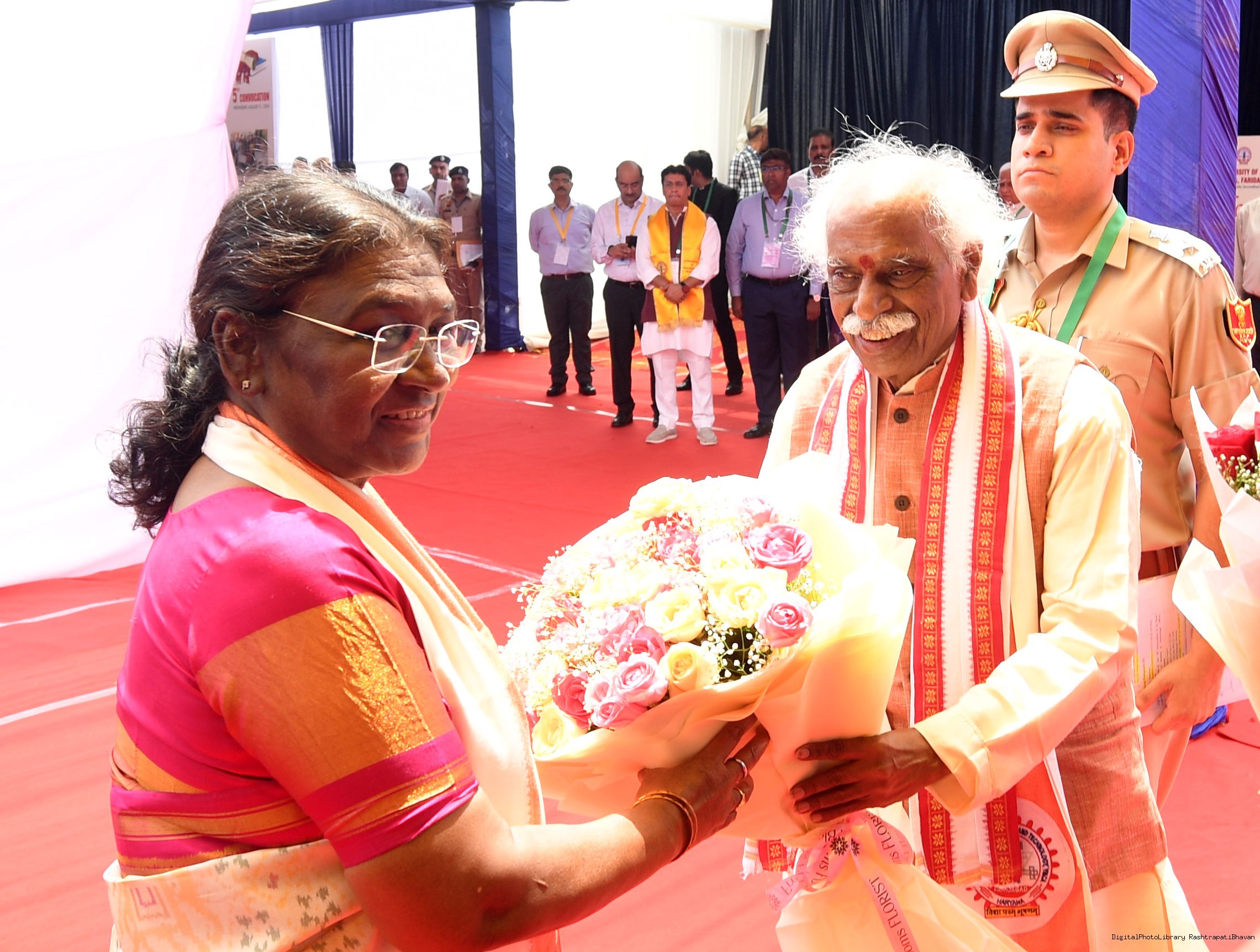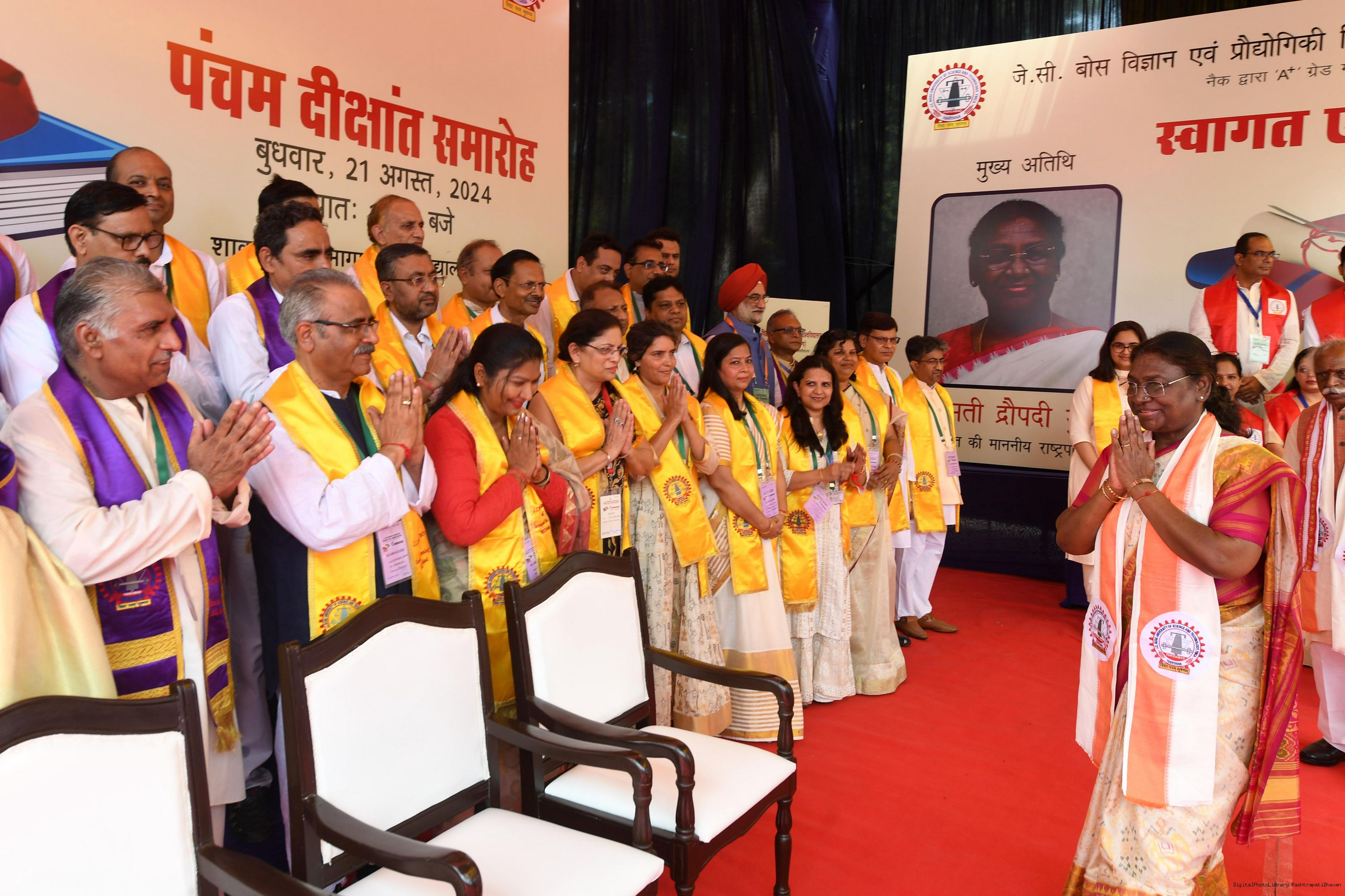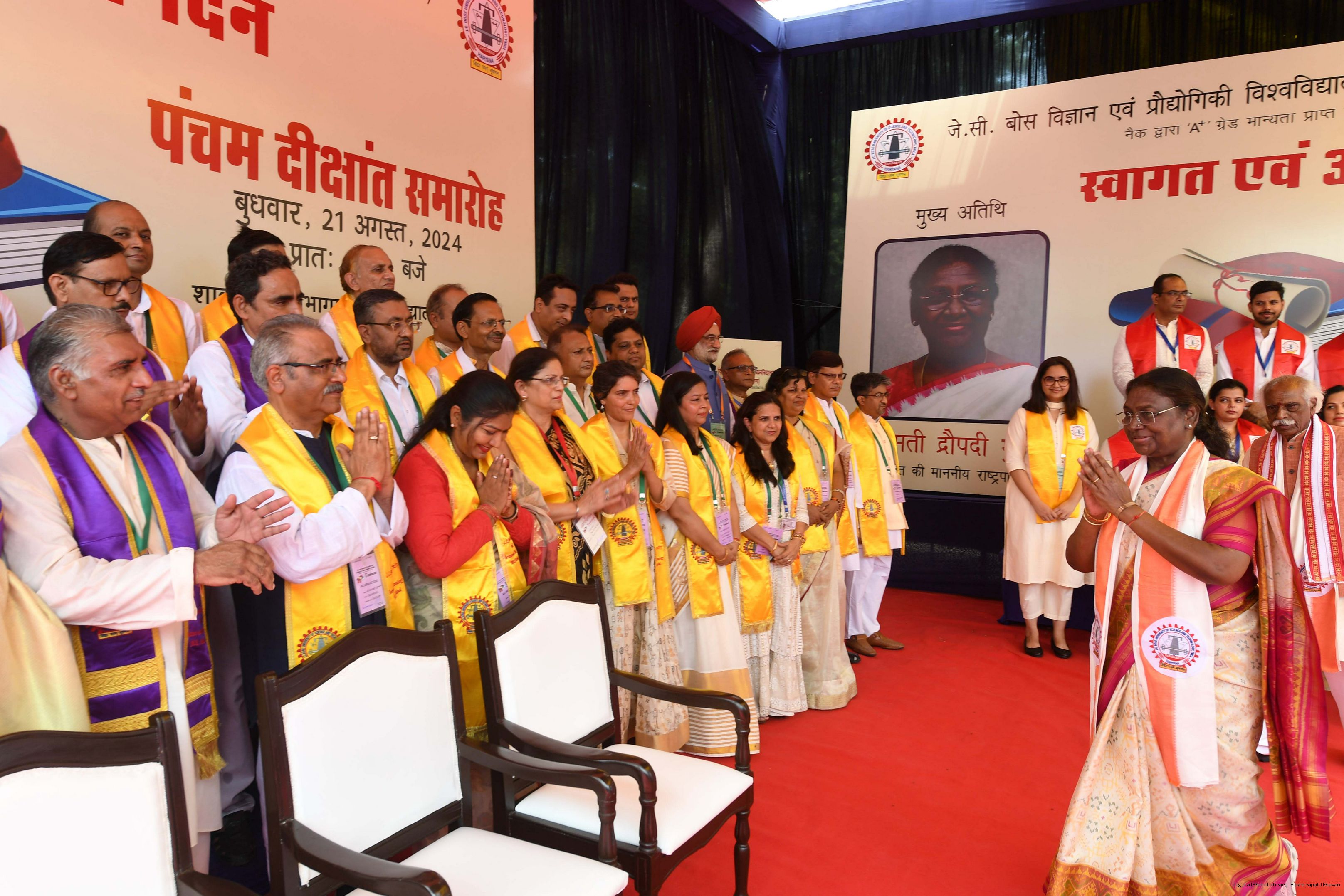 | Caption: | The President of India, Smt. Droupadi Murmu graced the 5th convocation of JC Bose University of Science and Technology at Faridabad, Haryana on August 21, 2024. |