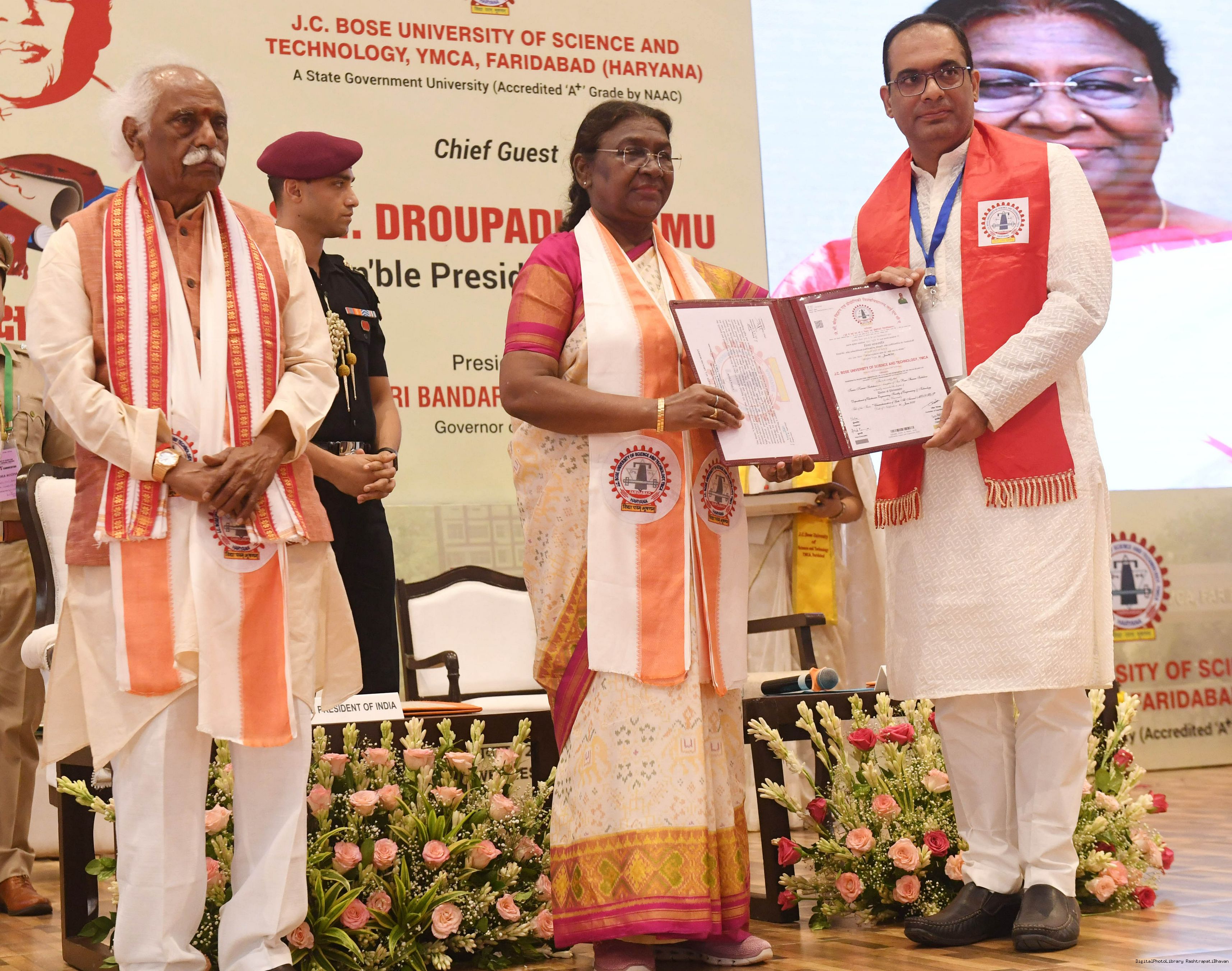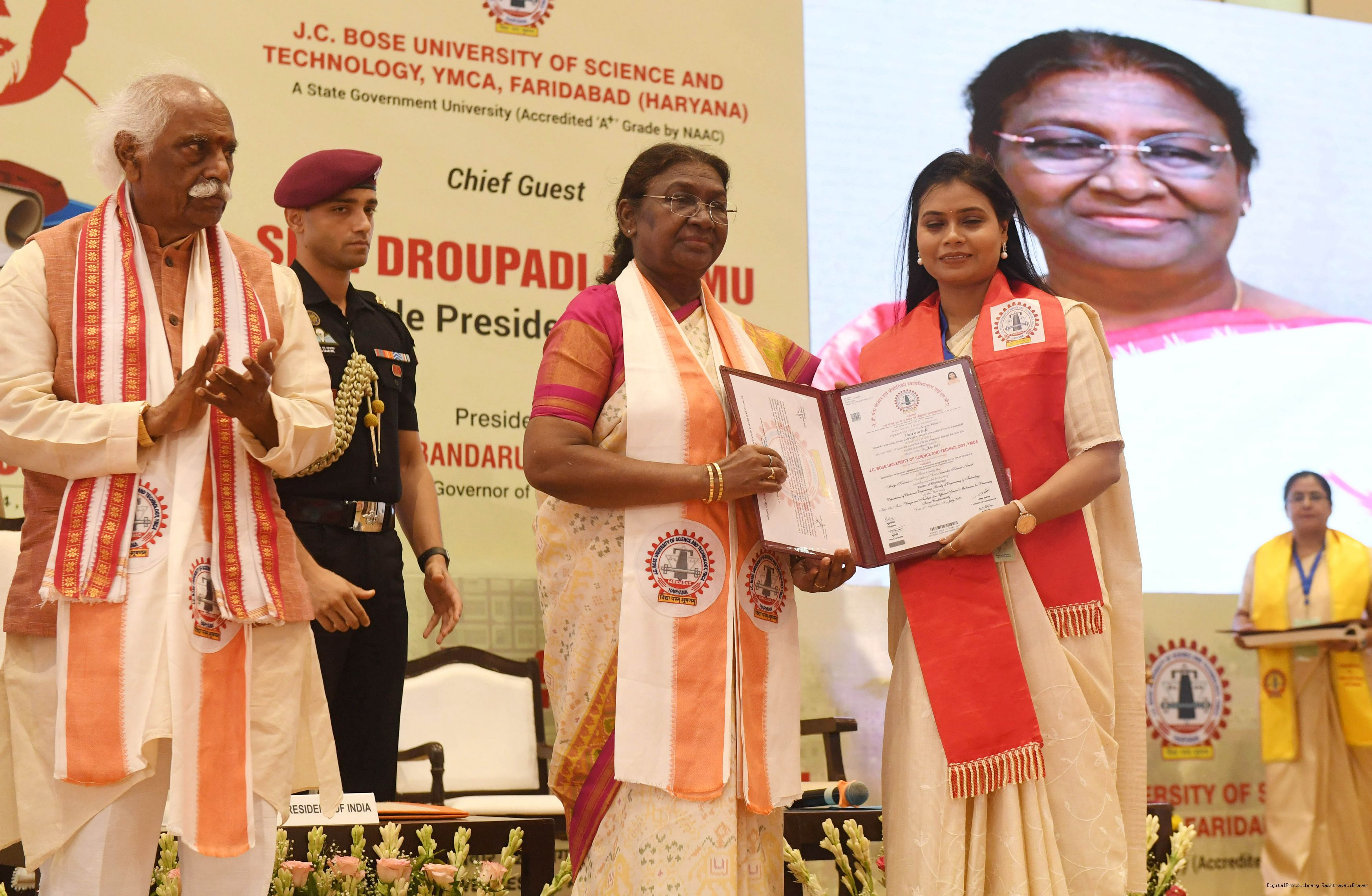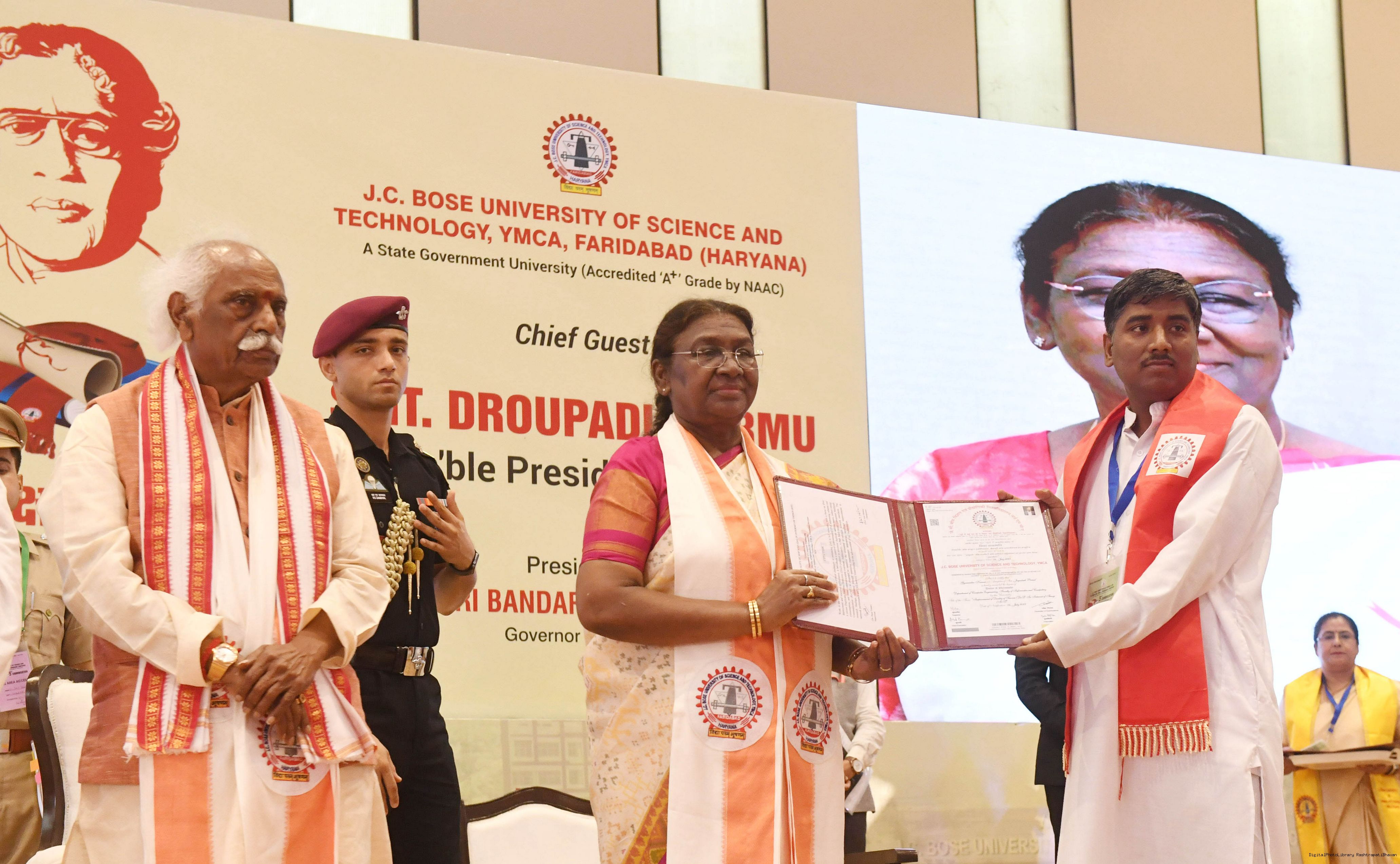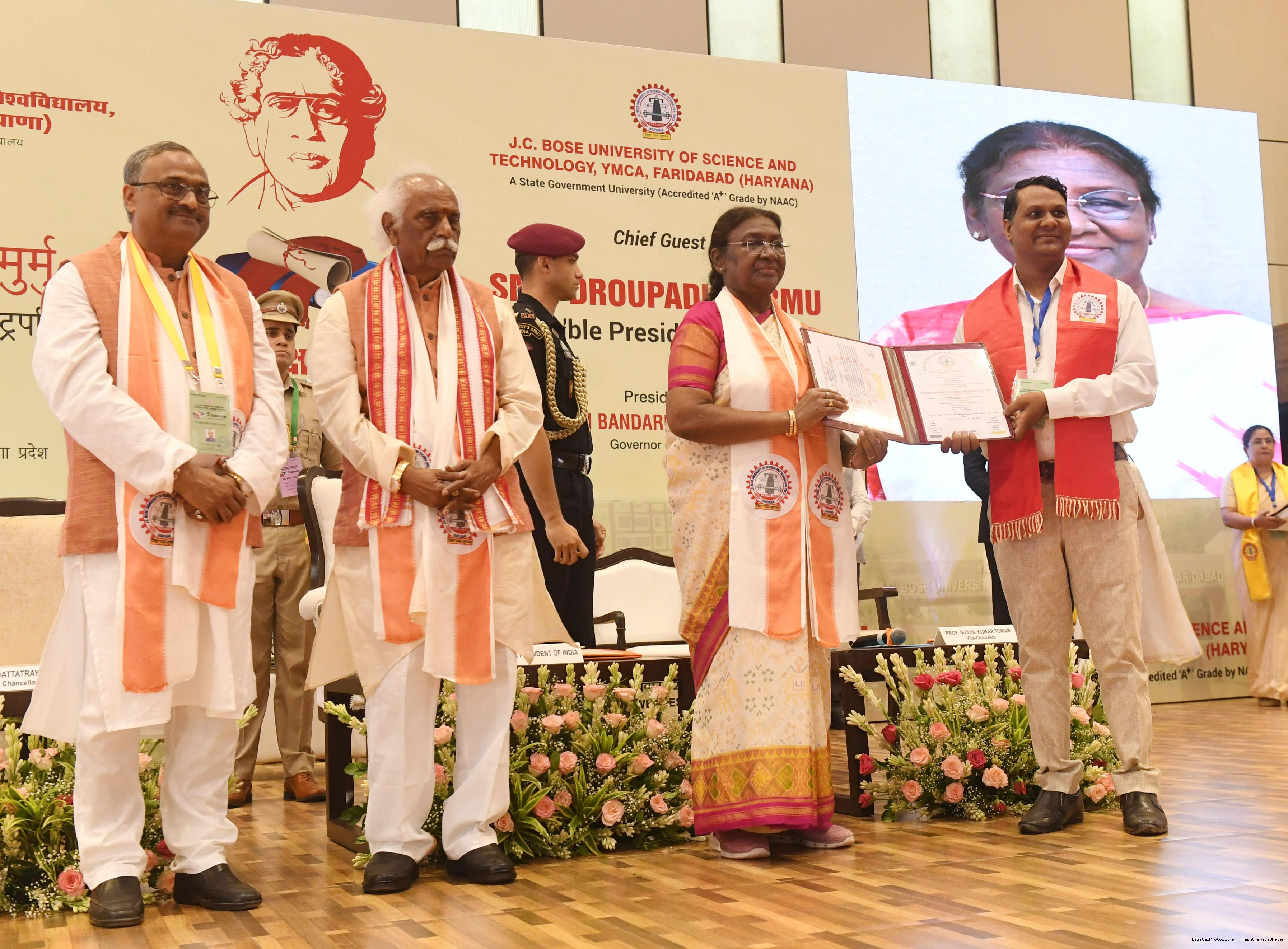 | Caption: | The President of India, Smt. Droupadi Murmu graced the 5th convocation of JC Bose University of Science and Technology at Faridabad, Haryana on August 21, 2024. |