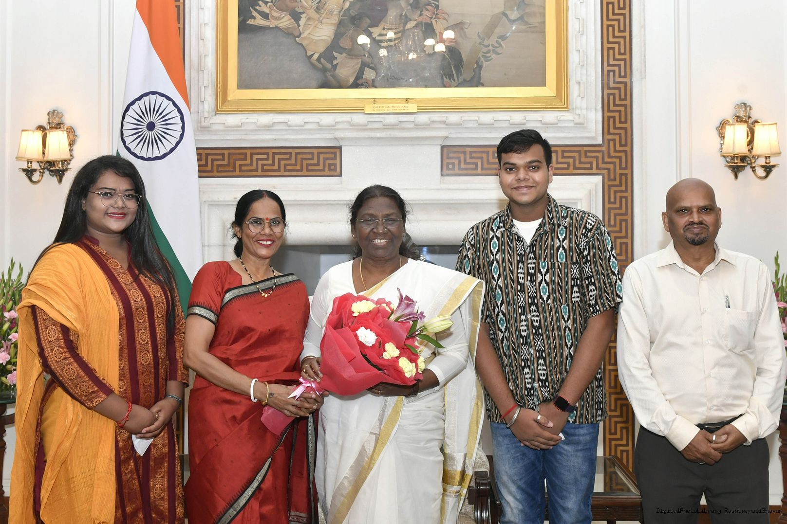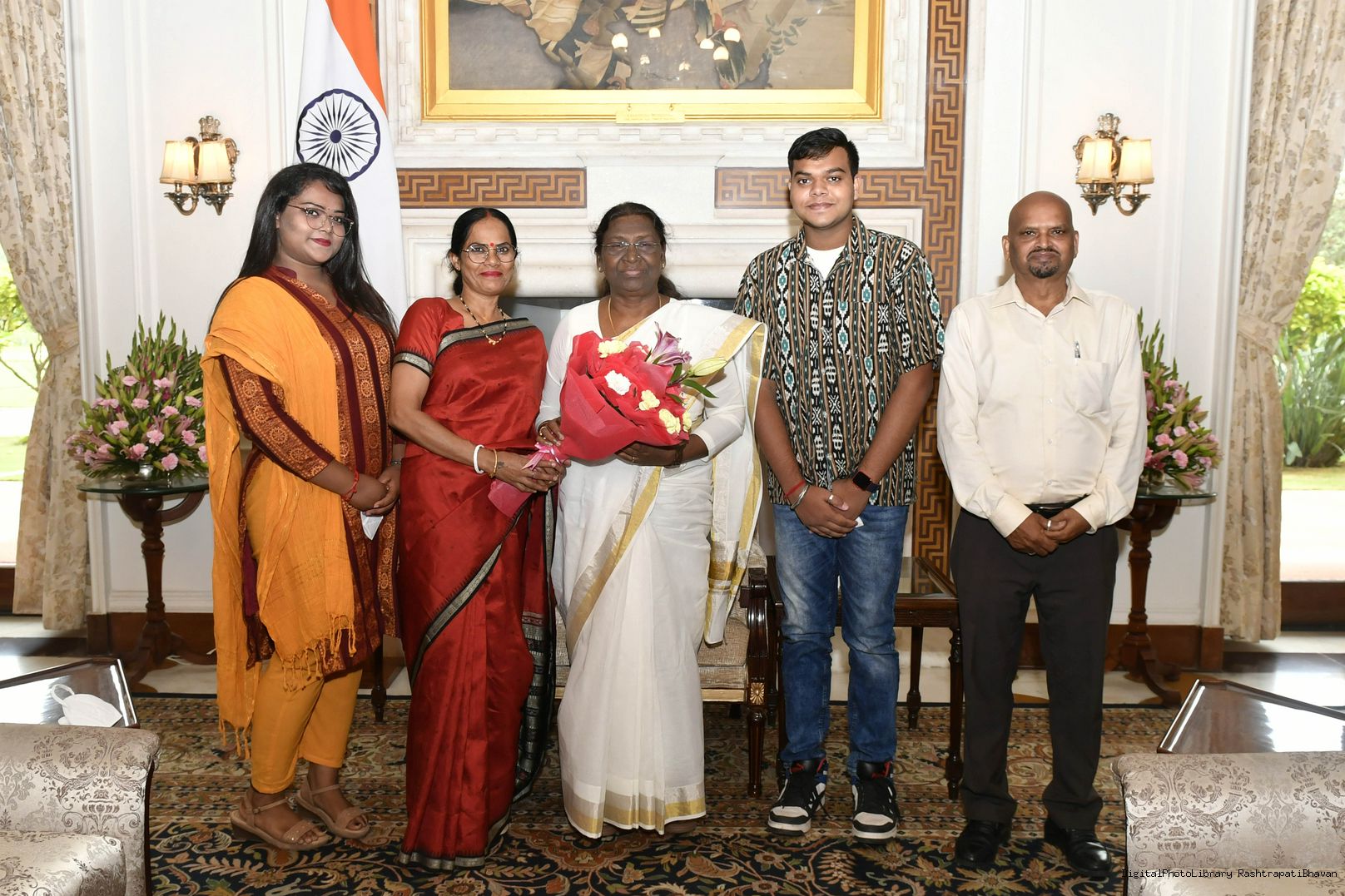 | Caption: | Shri Ram Avtar, Junior Photo Assistant, President's Secretariat along with his wife Smt. Sarojini, daughter Ms. Chandani and son Shri Karan meeting with the President of India, Smt. Droupadi Murmu, at Rashtrapati Bhavan on July 30, 2022. |