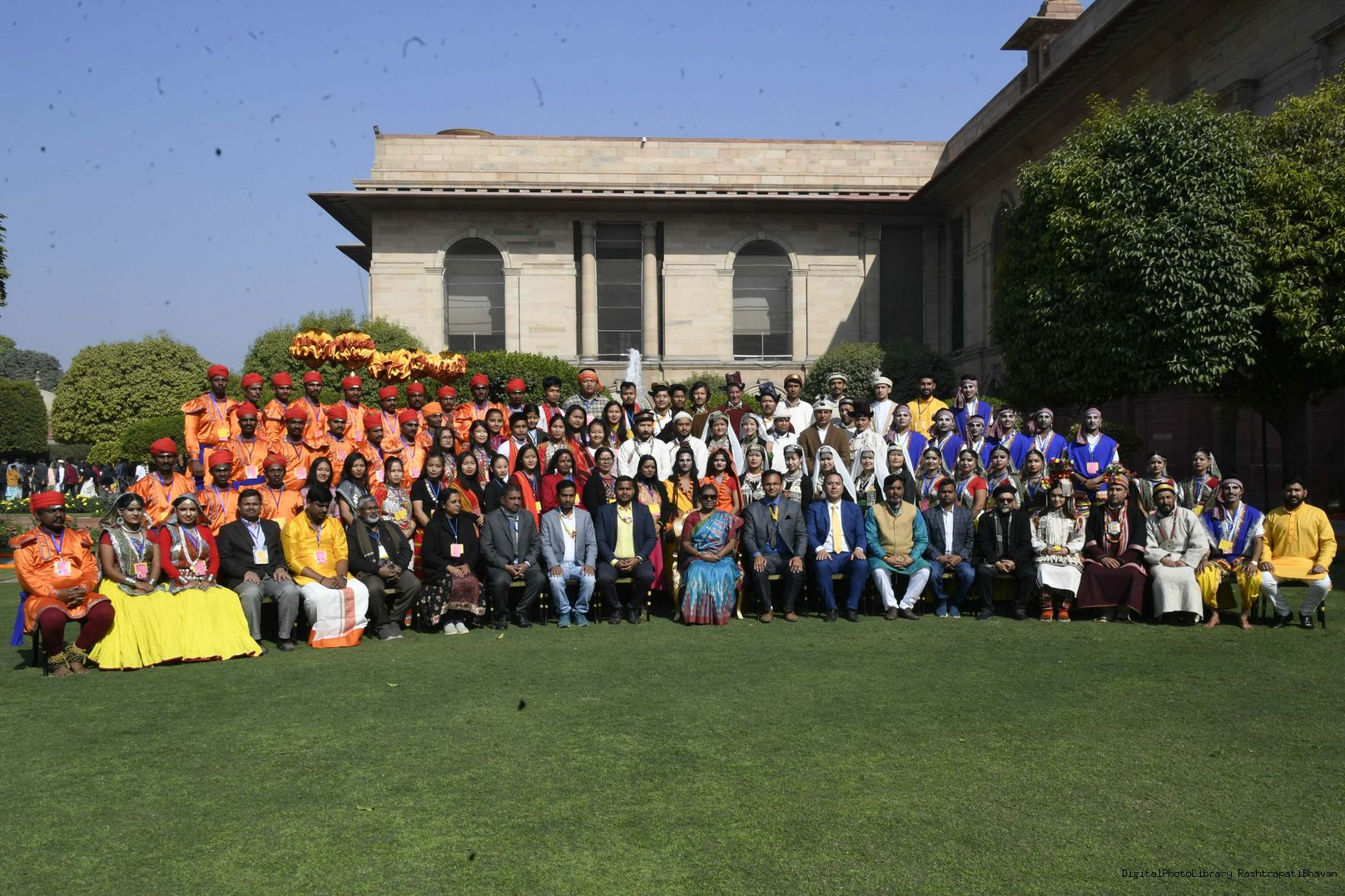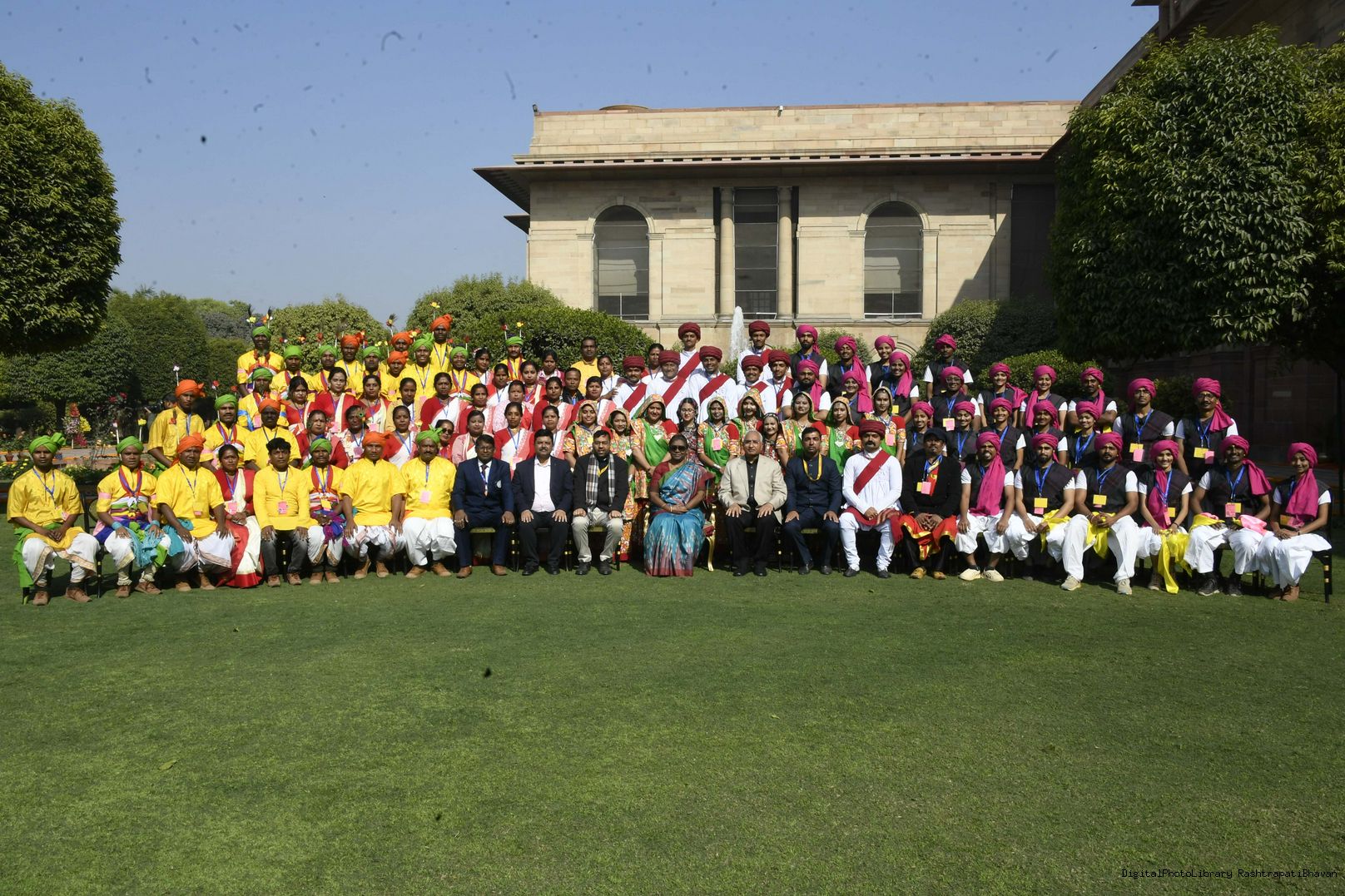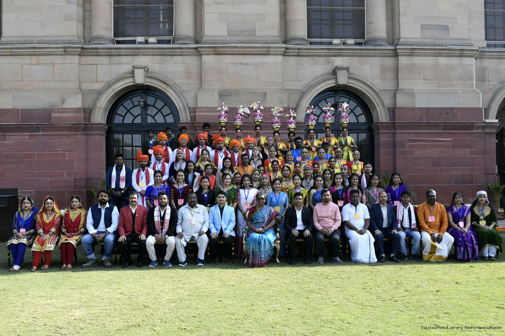 | Caption: | The President of India, Smt. Droupadi Murmu met tribal guests, tableaux artistes and tractor drivers, NSS volunteers and NCC cadets, officials and other participants of the Republic Day Parade 2023, at Rashtrapati Bhavan on January 27, 2023. |