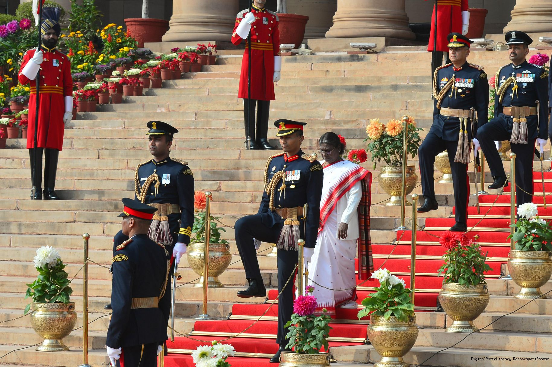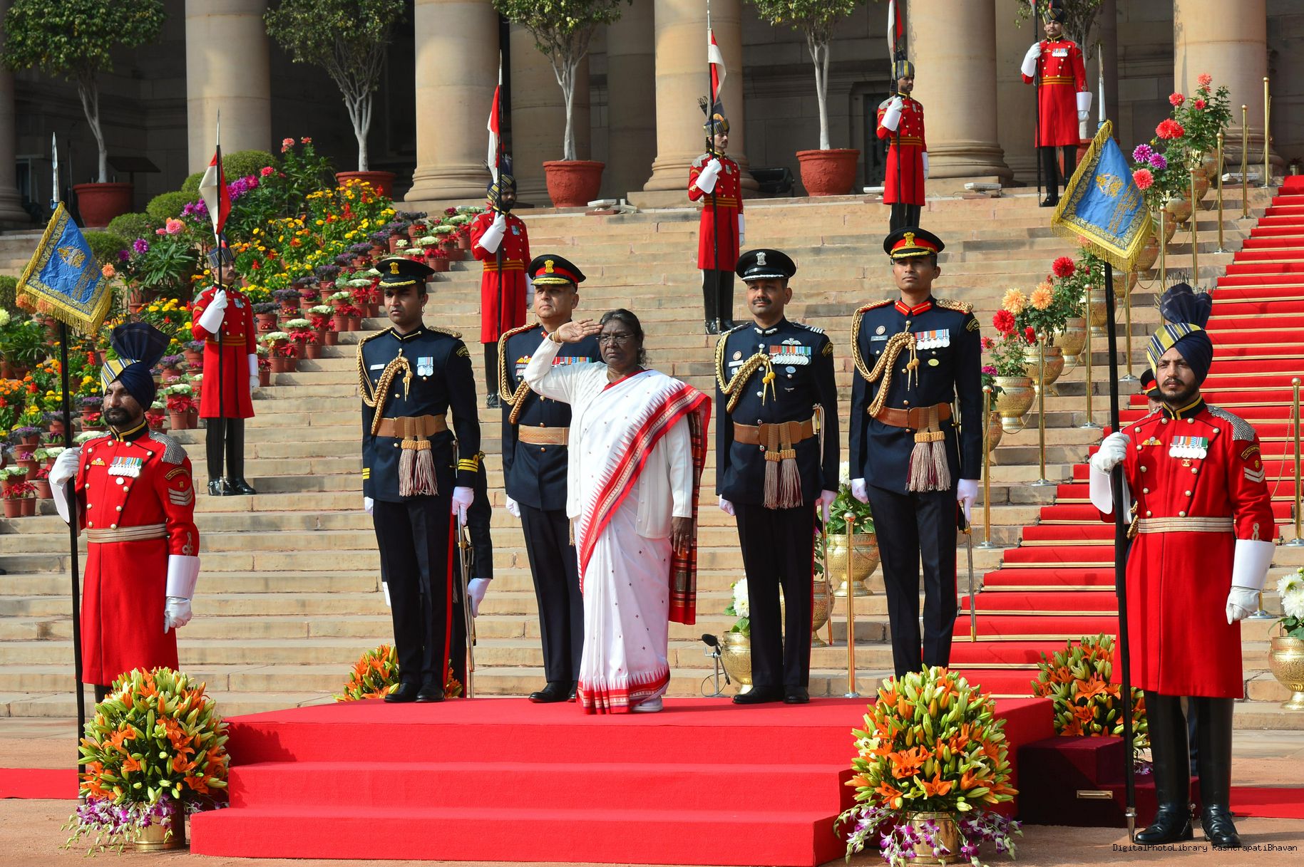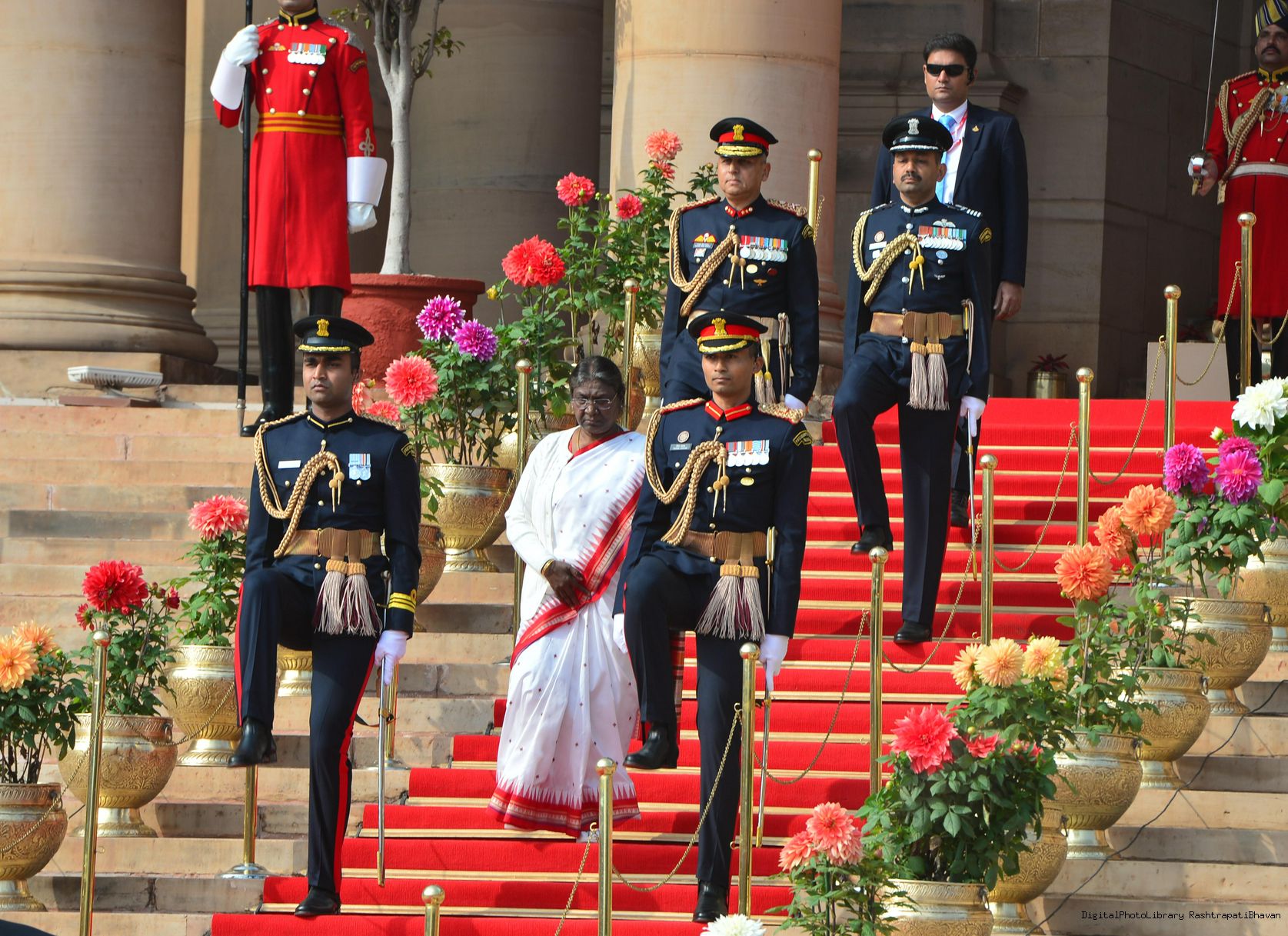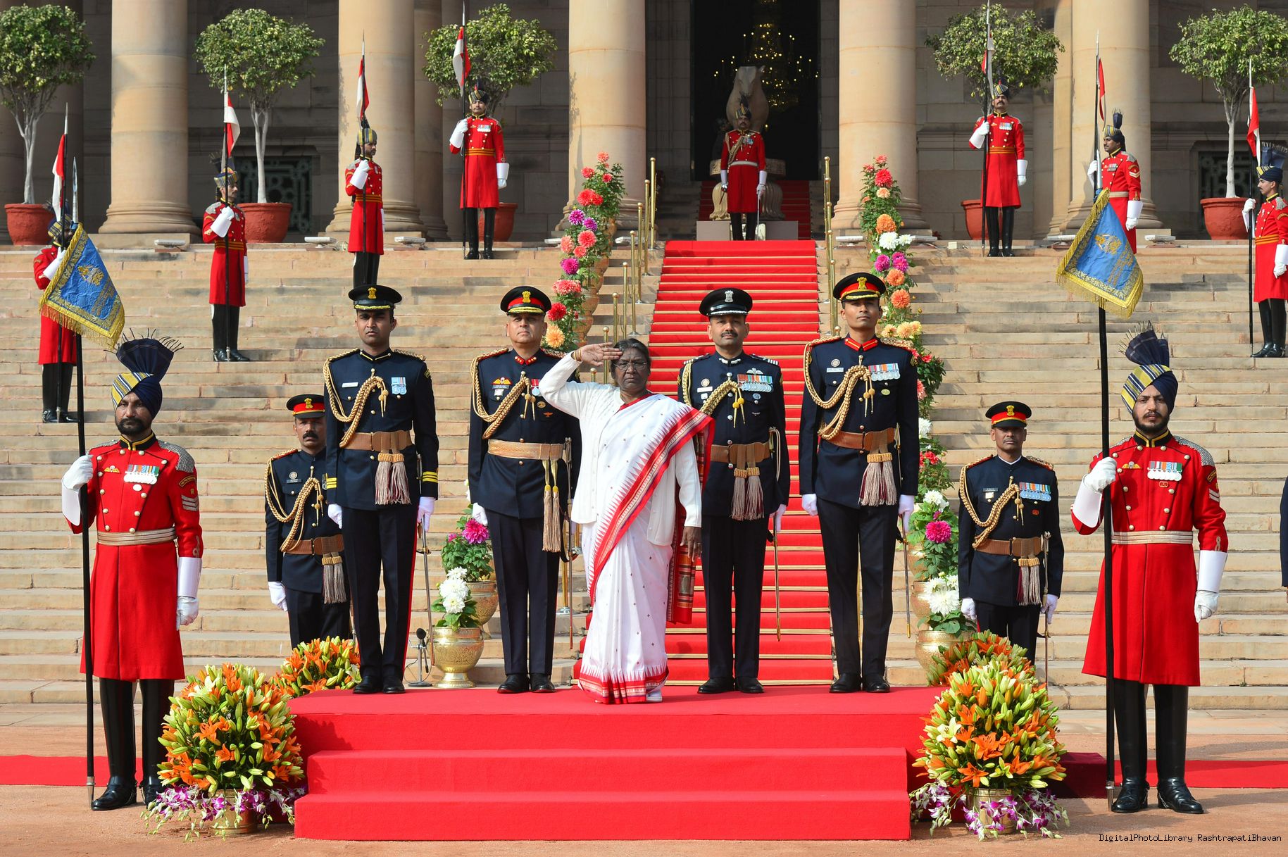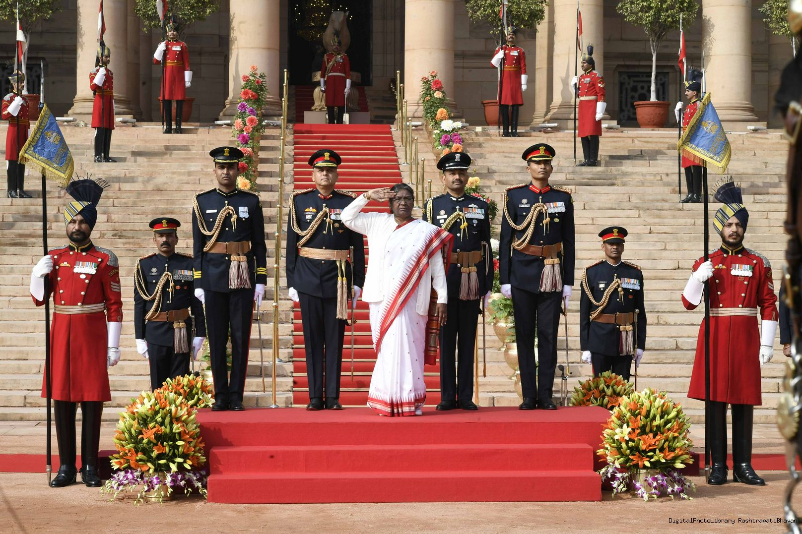 | Caption: | The President of India, Smt. Droupadi Murmu the PBG presents National Salute to the President at Rashtrapati Bhavan on January 31, 2023. |