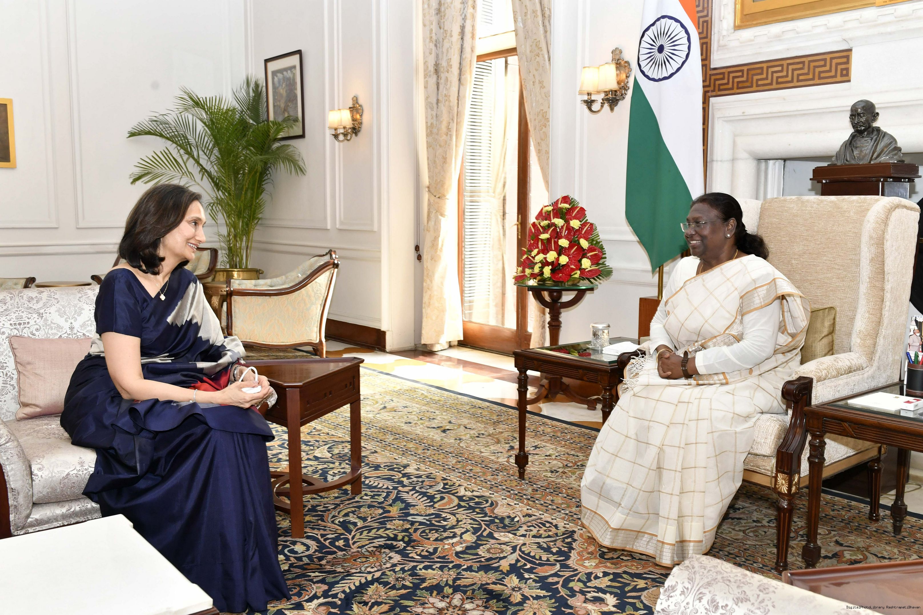 | Caption: | Ms. Shobhana Bhartia, ex. MP(RS) and Chairperson Editorial Director, HT Media Ltd. meeting with the President of India, Smt. Droupadi Murmu, at Rashtrapati Bhavan on Aug 05, 2022. |