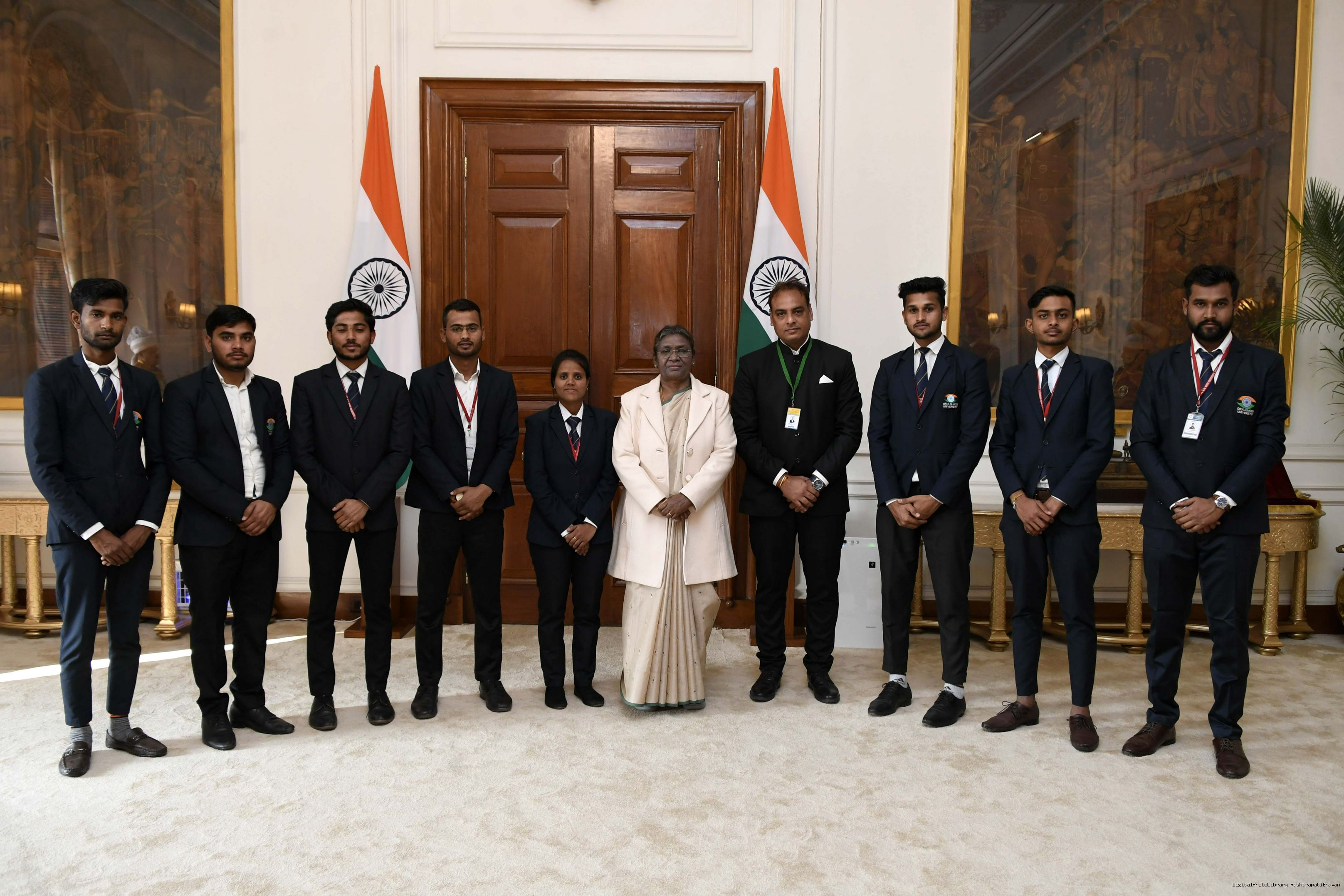 | Caption: | Dr. Shailesh Sharma along with others from Dr. K.N. Modi University, Newai, District Tonk, Rajasthan meeting with the President of India Smt. Droupadi Murmu at Rashtrapati Bhavan on February 01, 2023. |