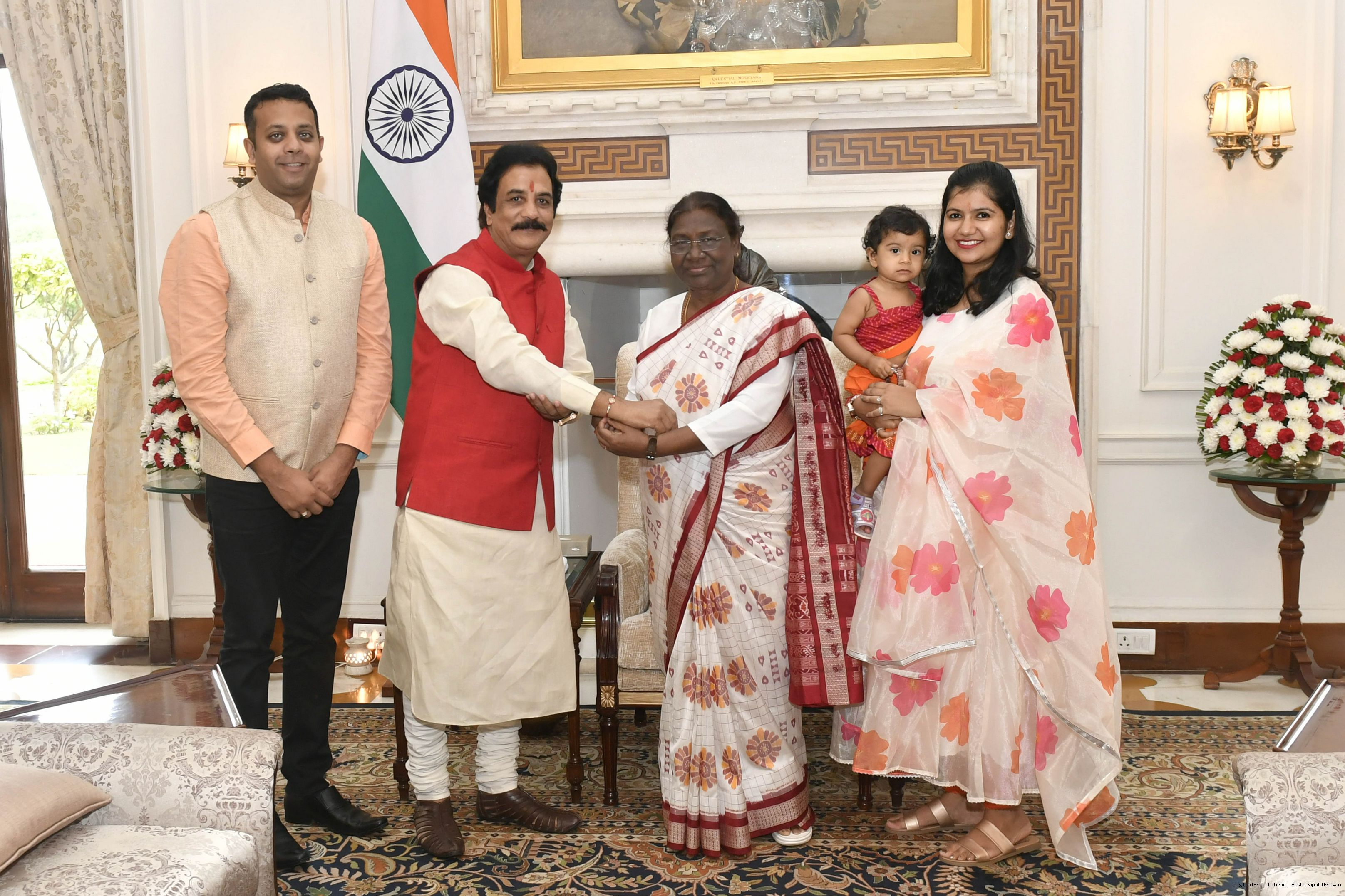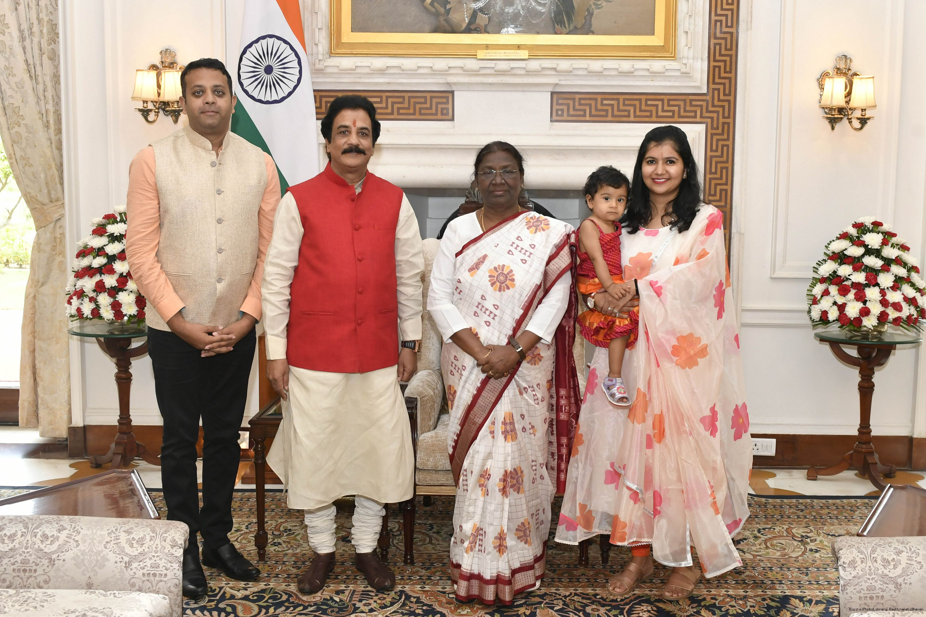 | Caption: | Shri Kishore Jain along with his son Shri Mayank Jain, daughter-in-law Smt. Ayushi Jain and granddaughter Ms. Anayasha Jain meeting with the President of India, Smt. Droupadi Murmu, at Rashtrapati Bhavan on Aug 11, 2022. |