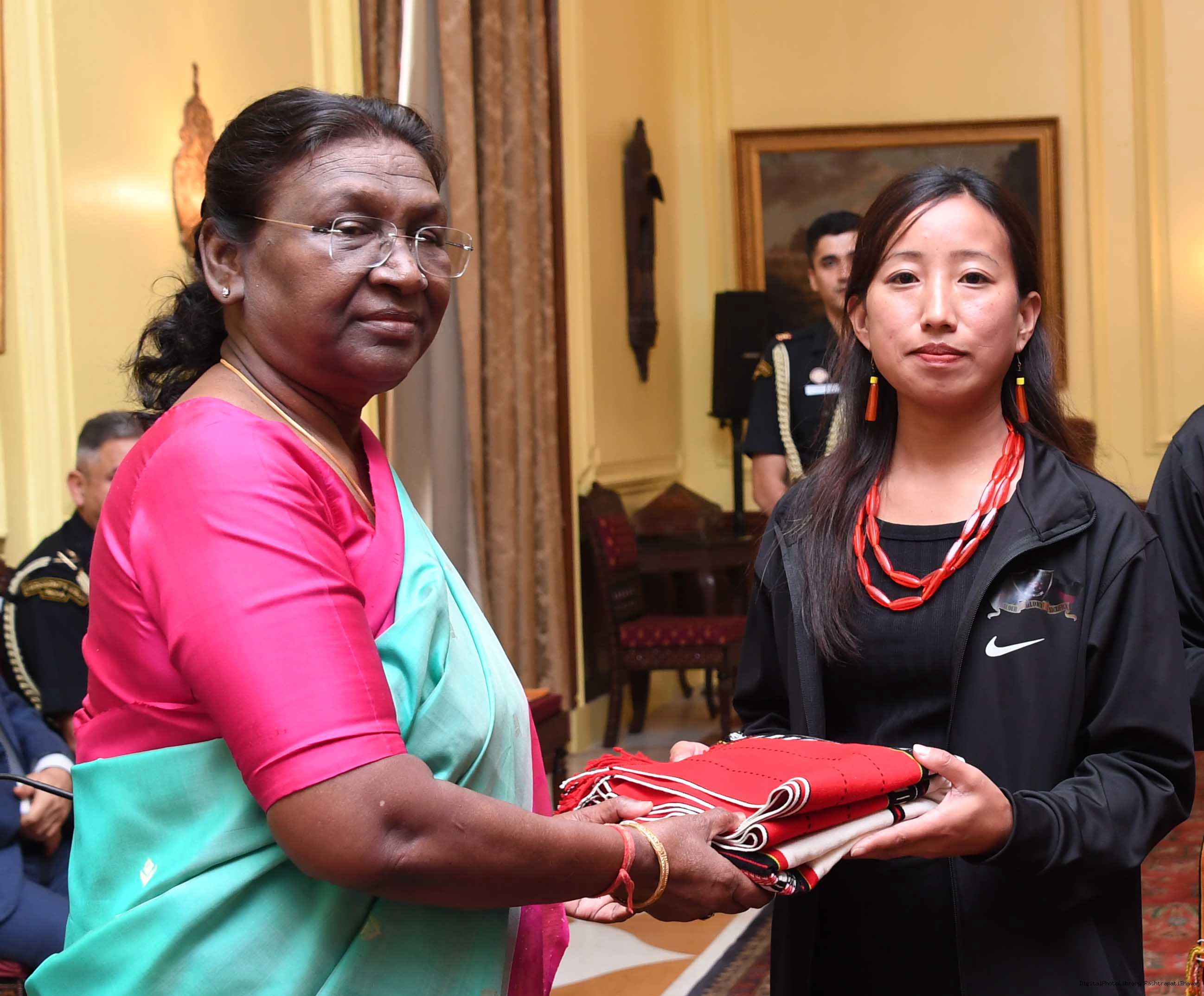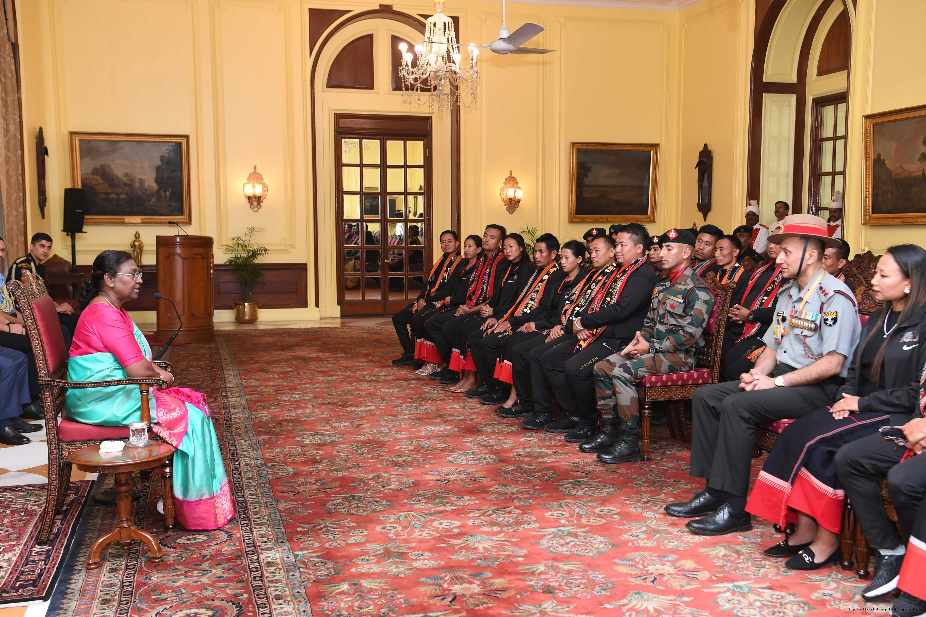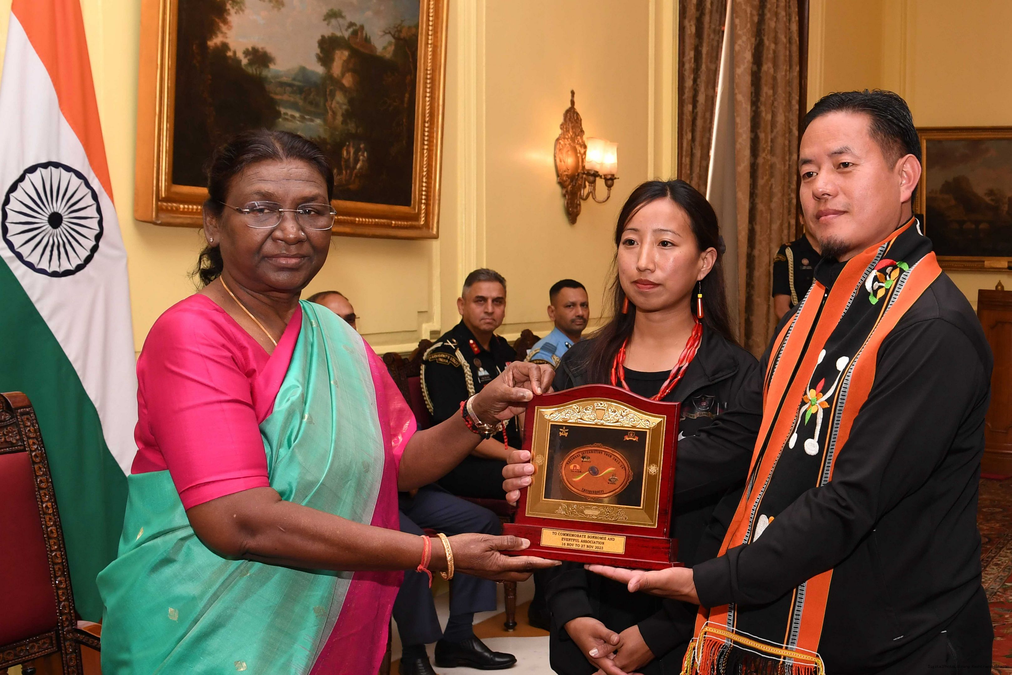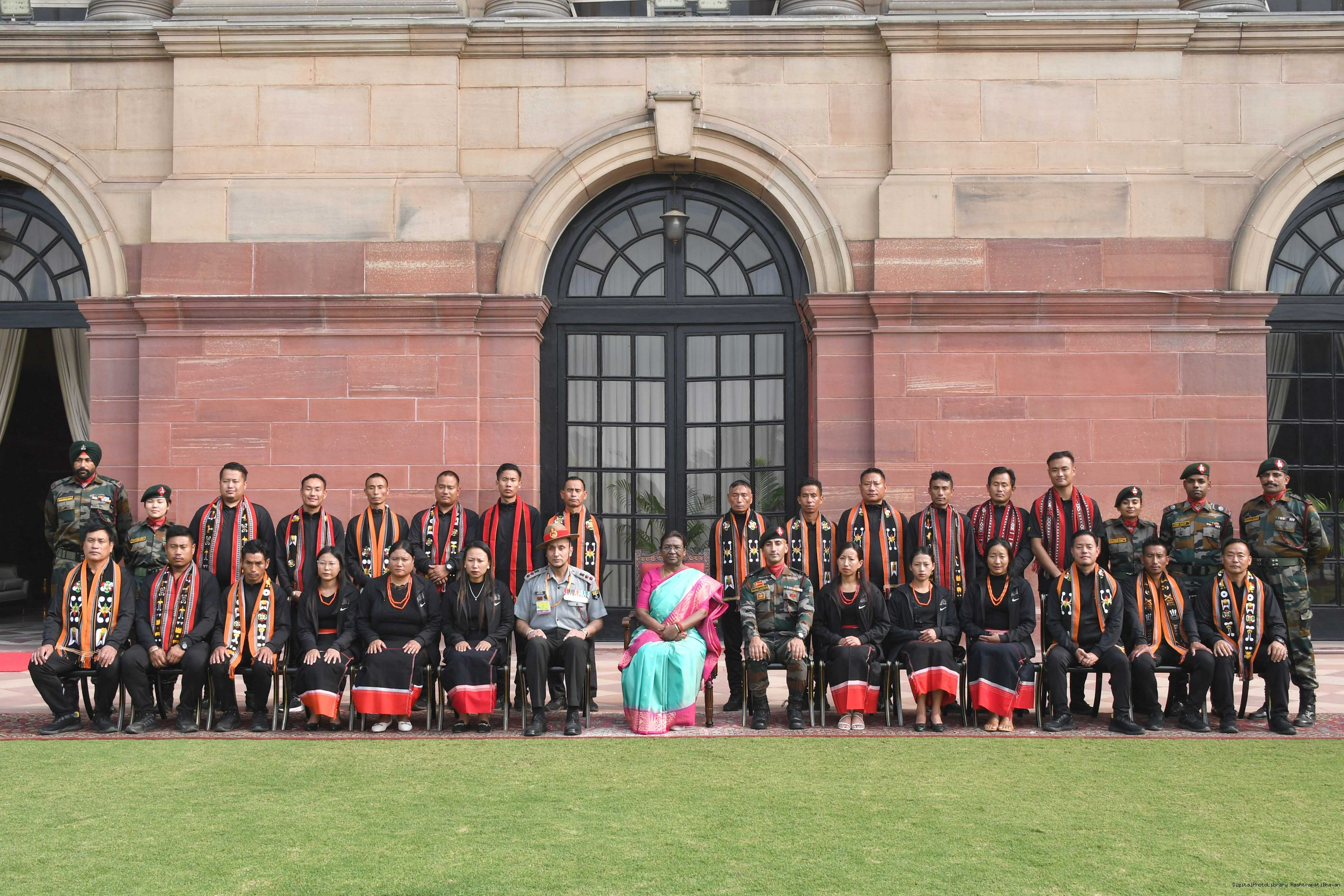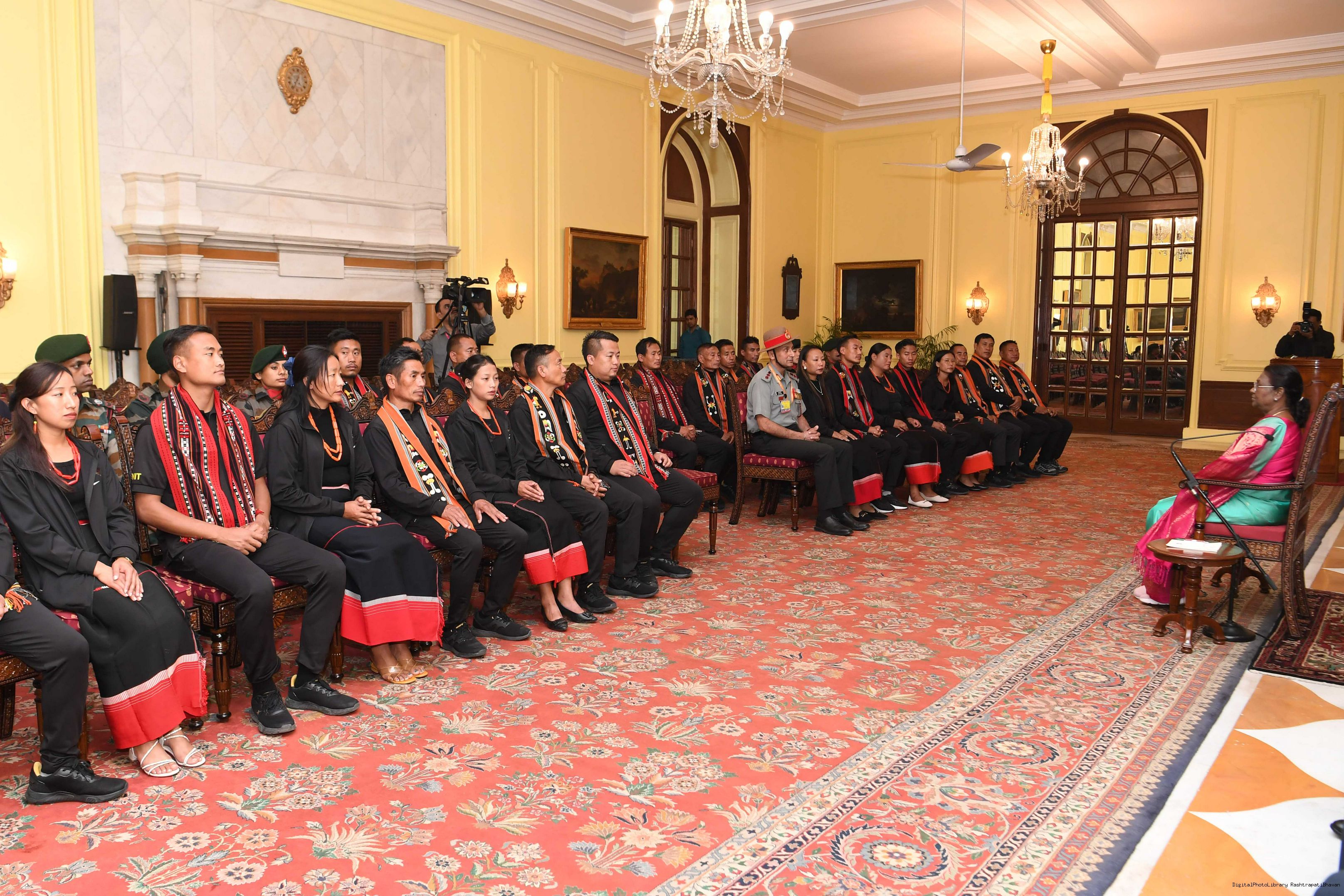 | Caption: | The President of india smt. Droupadi Murmu Meeting with the 24 civilians from Kohima (Nagaland) as a part of National Integration Tour (NIT) being organized by Assam Rifle 24, 2023. |