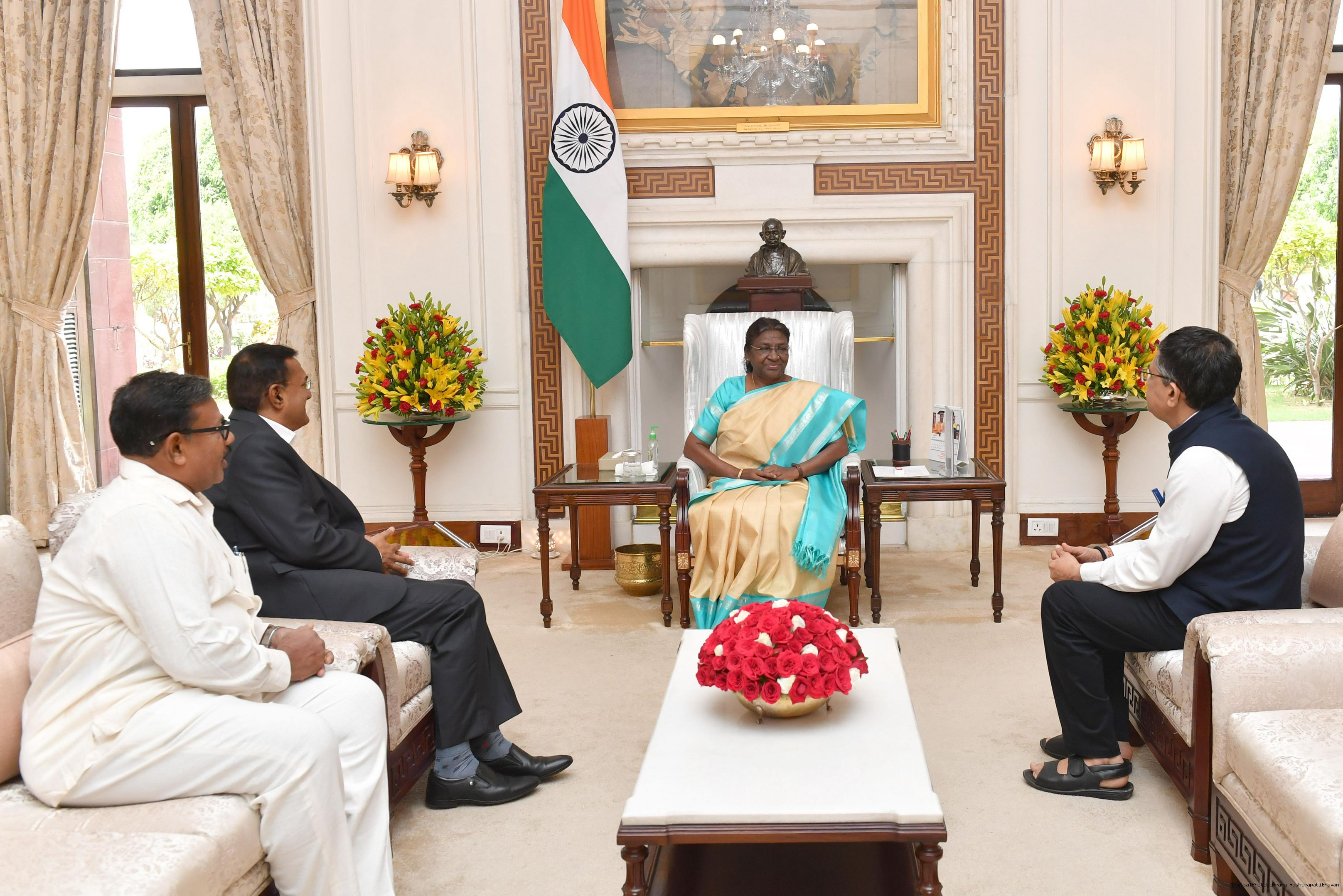 | Caption: | Shri Sanjeeb Mohanty from Bishoi, Dist. Mayurbhanj along with Others meeting with the President of India, Smt. Droupadi Murmu at Rashtrapati Bhavan on June 12, 2023. |