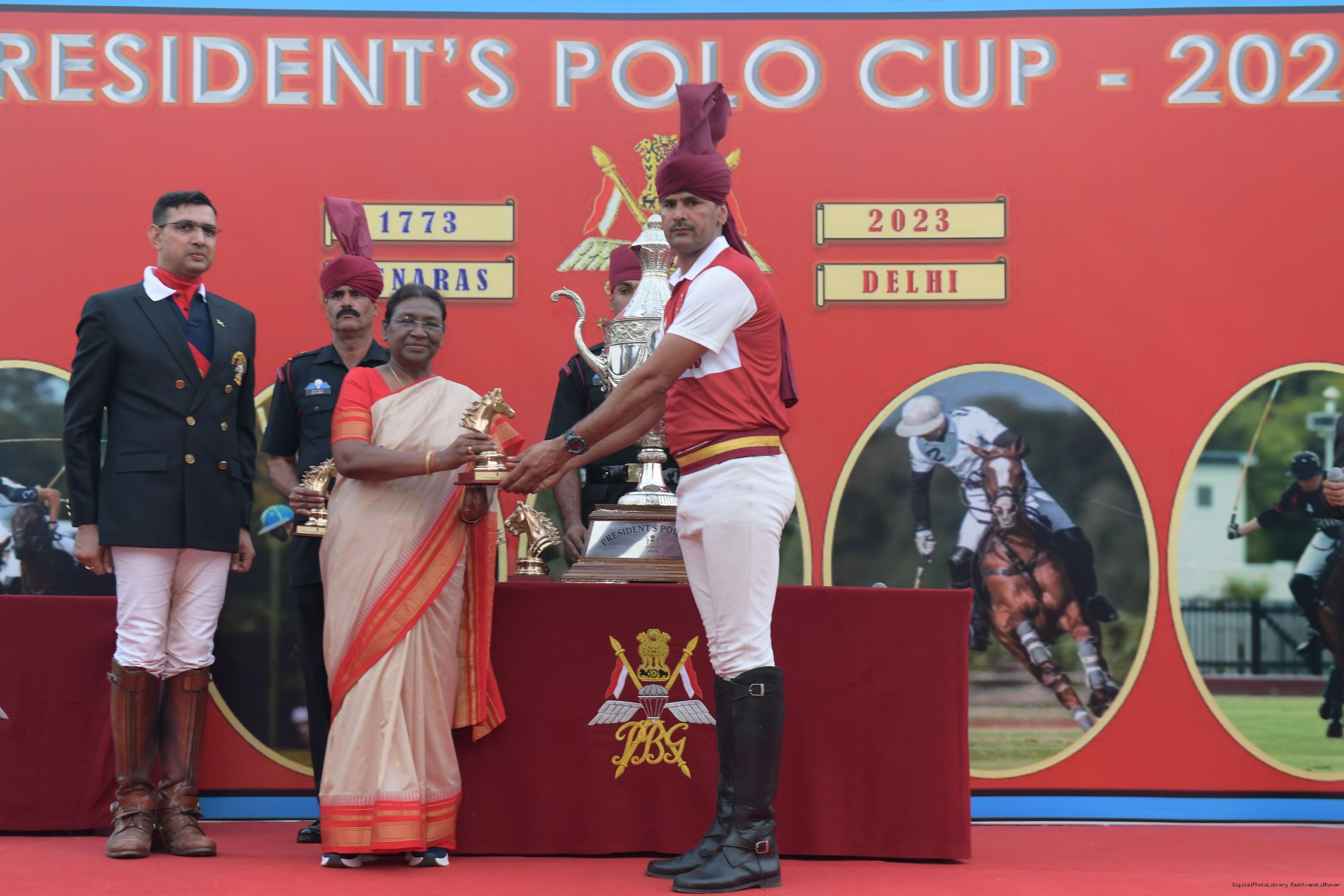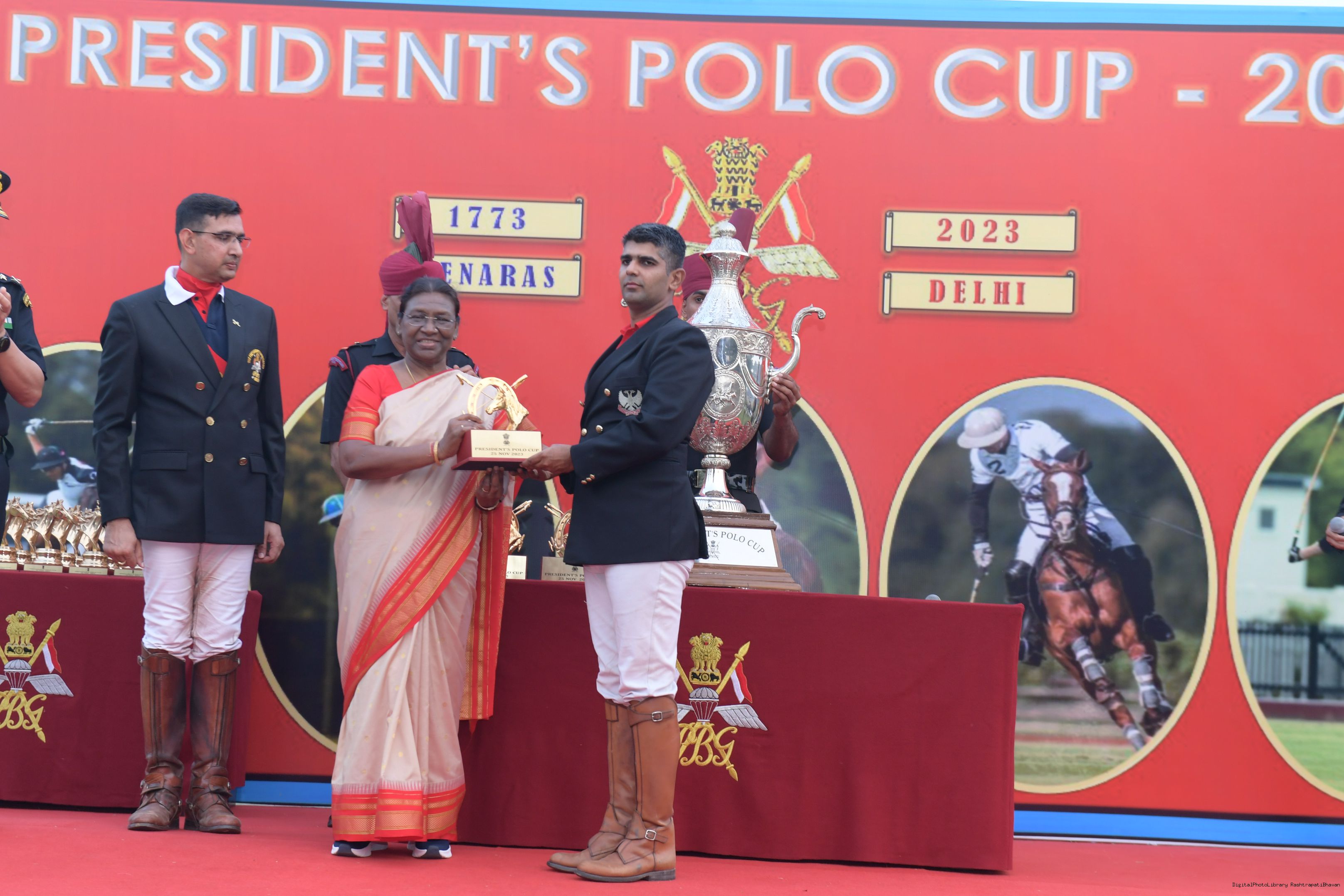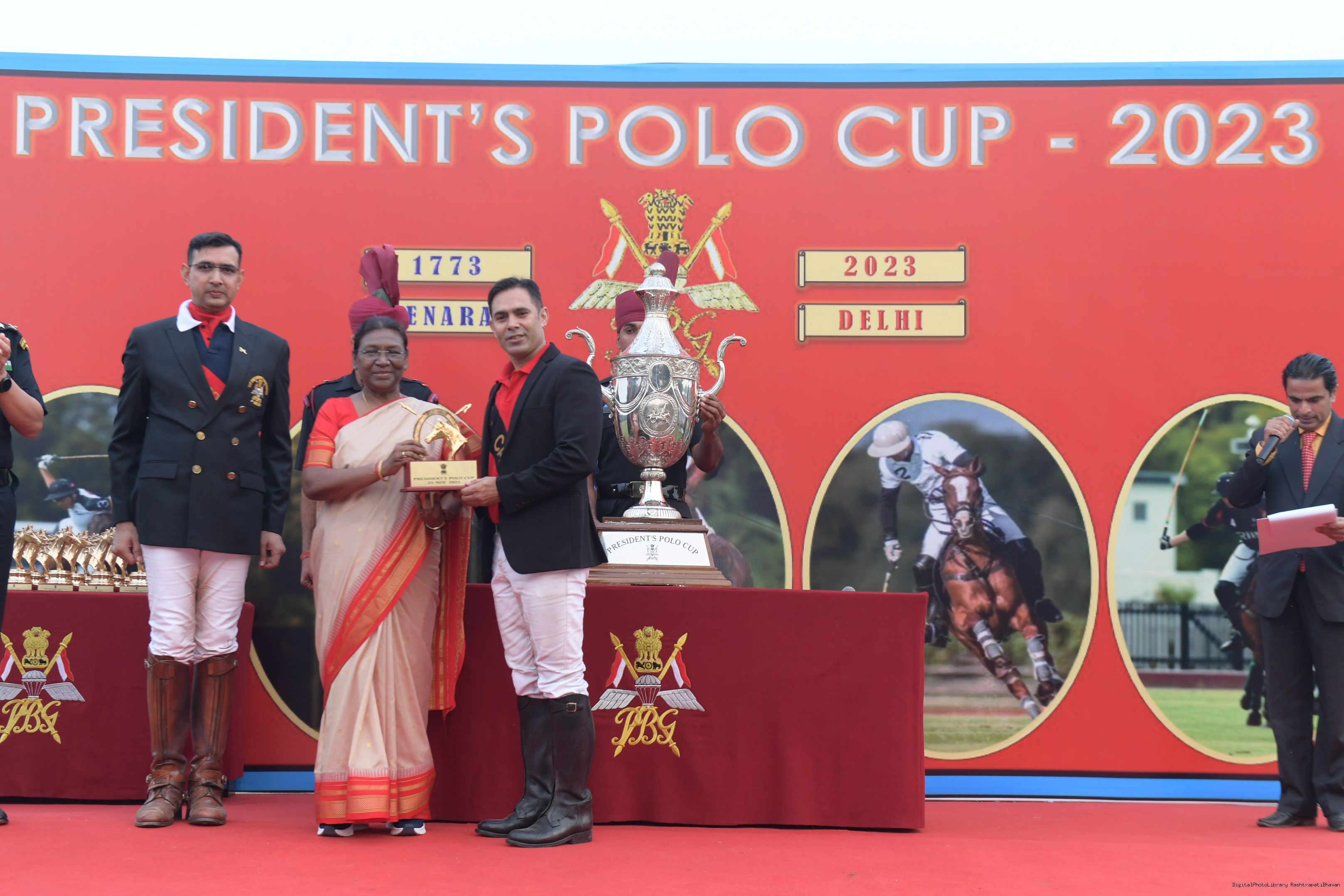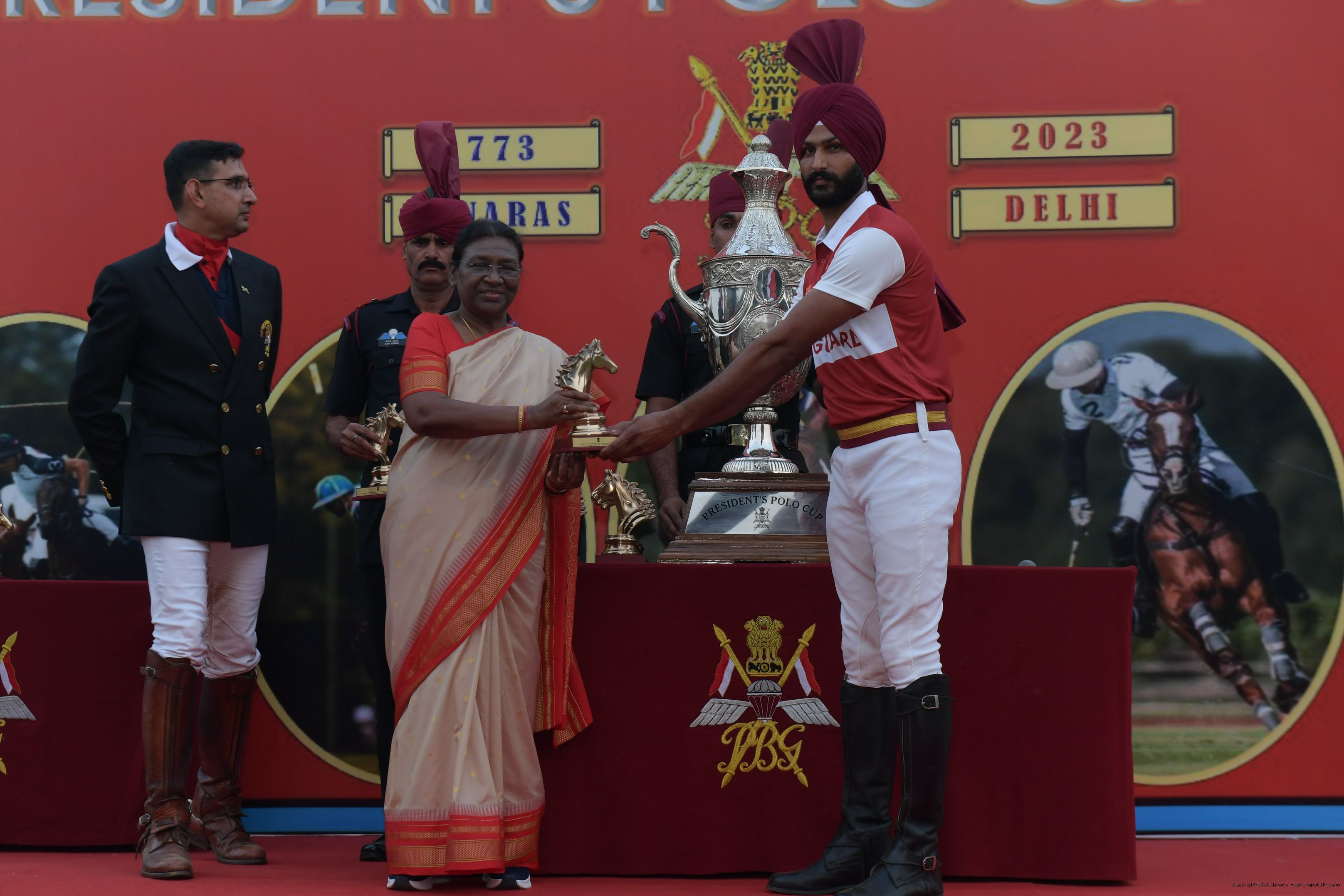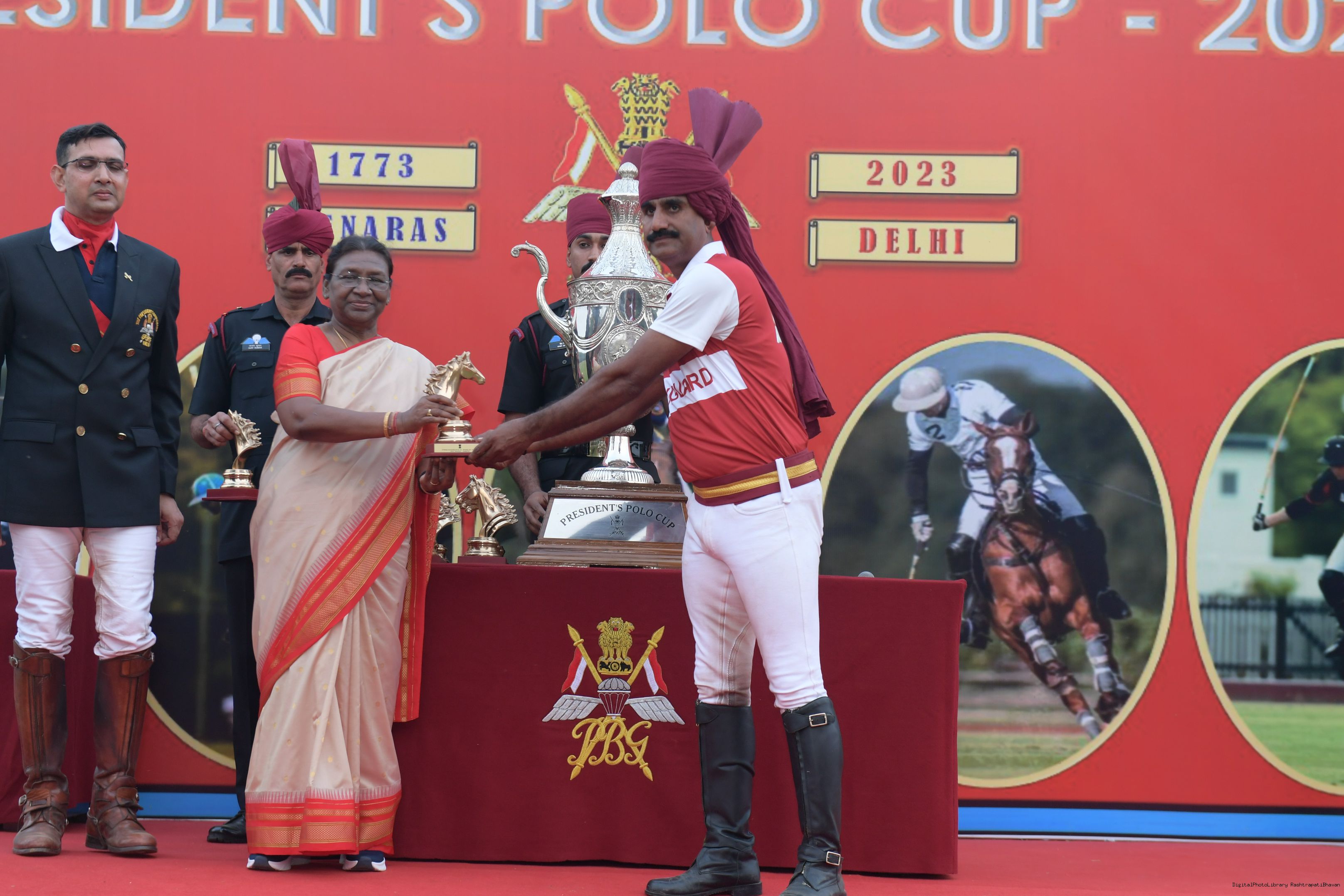 | Caption: | The President of India, Smt. Droupadi Murmu witnessed the President's Polo Cup Exhibition Match at PBG Parade Ground (Polo Field), in New Delhi on November 25, 2023. |