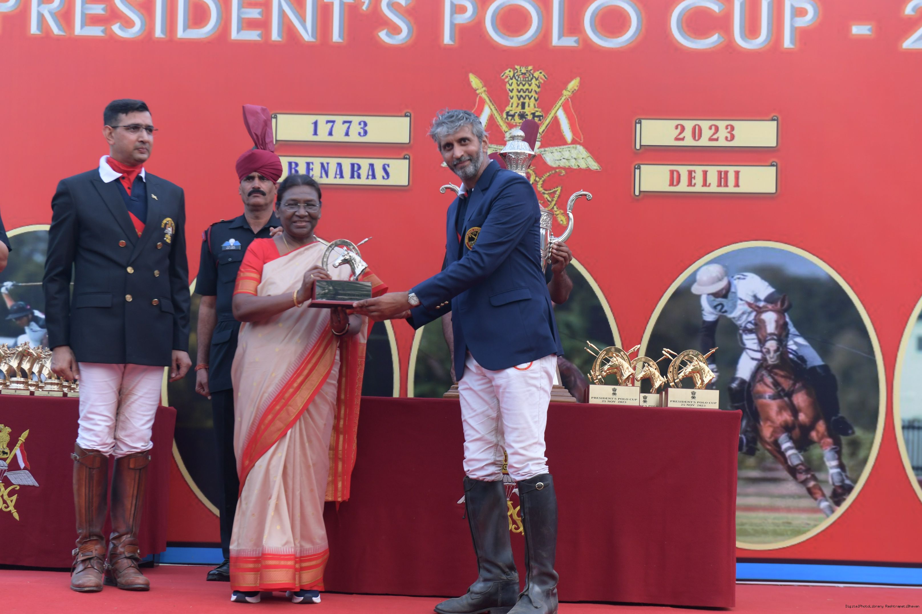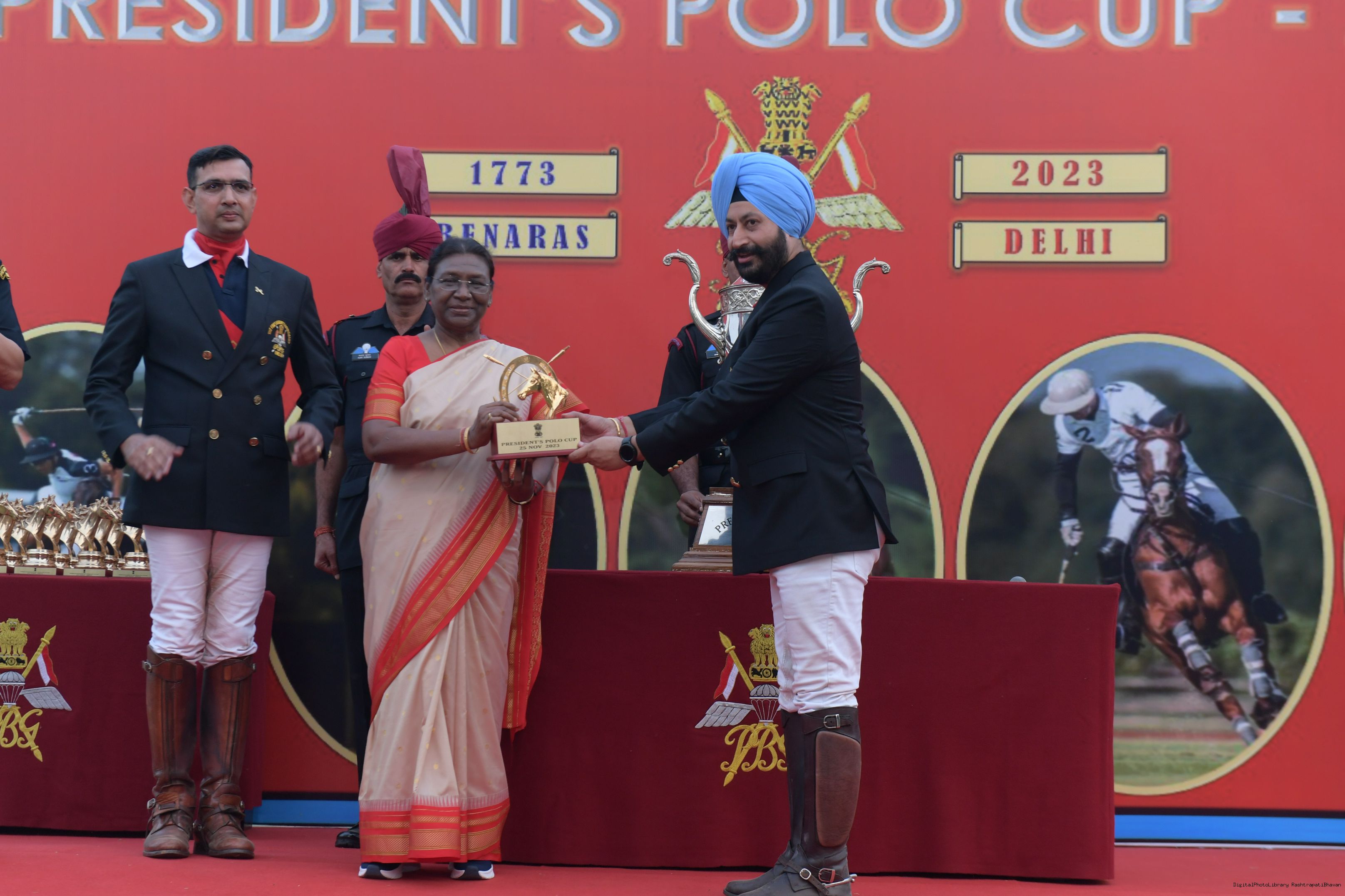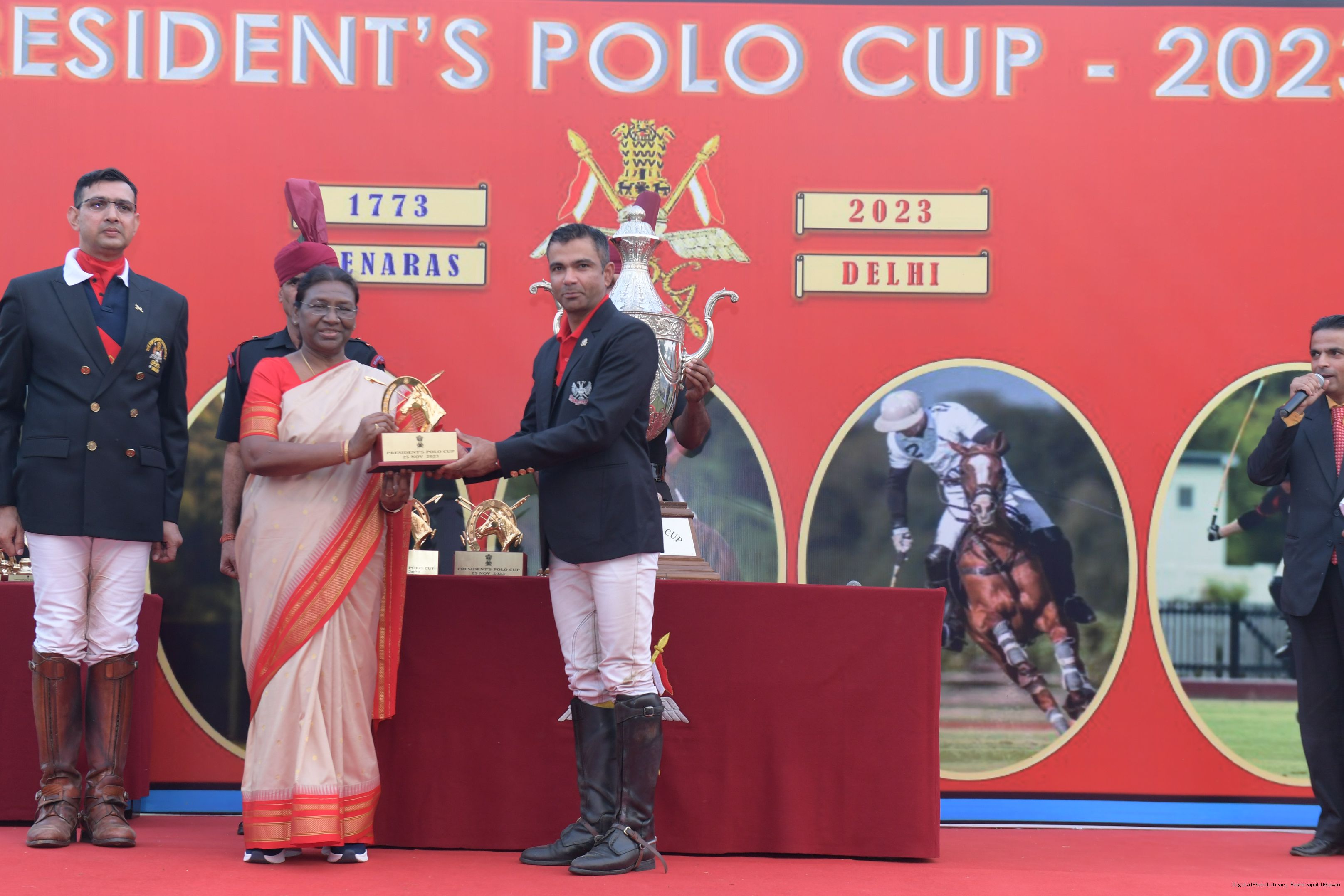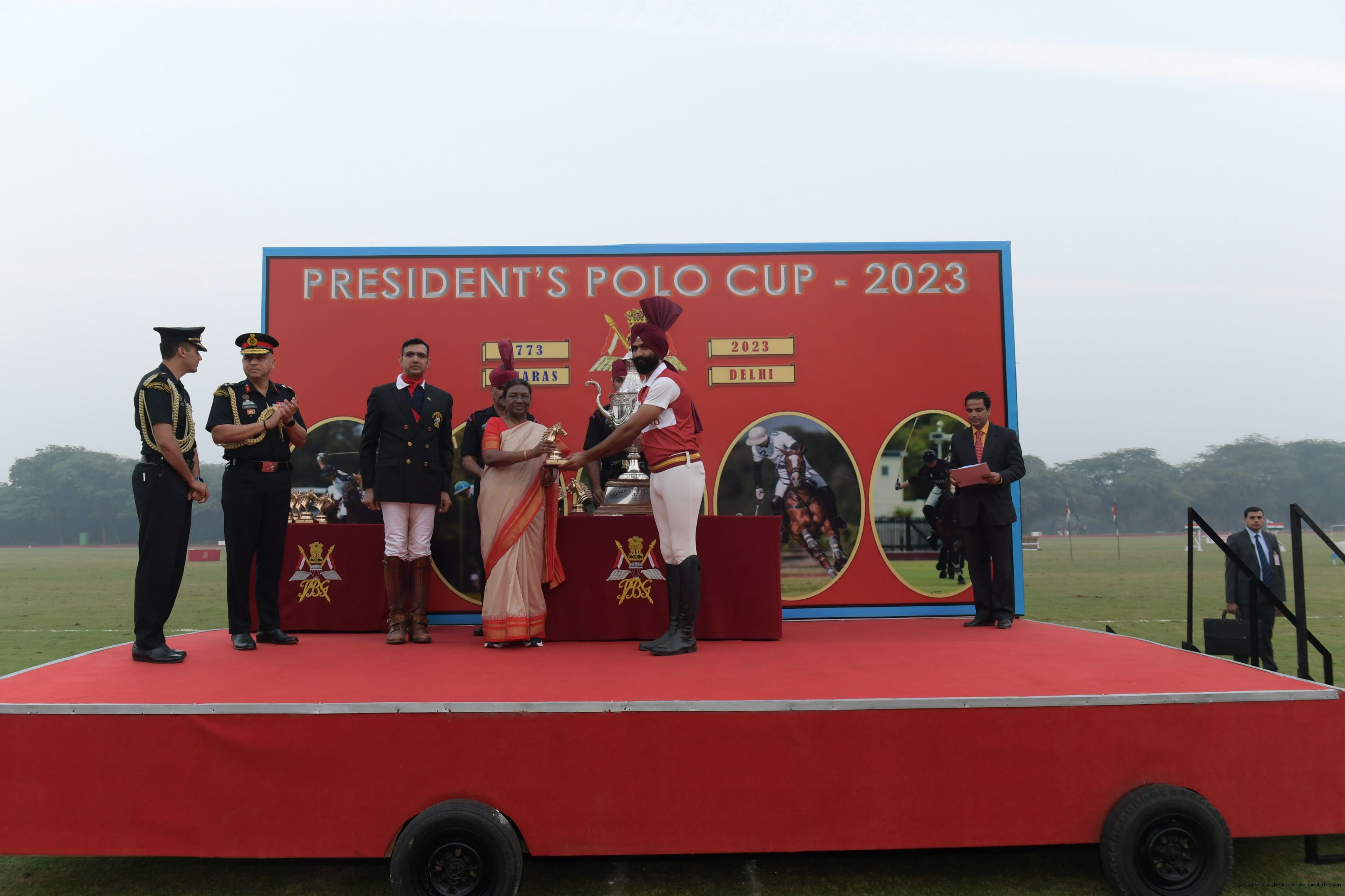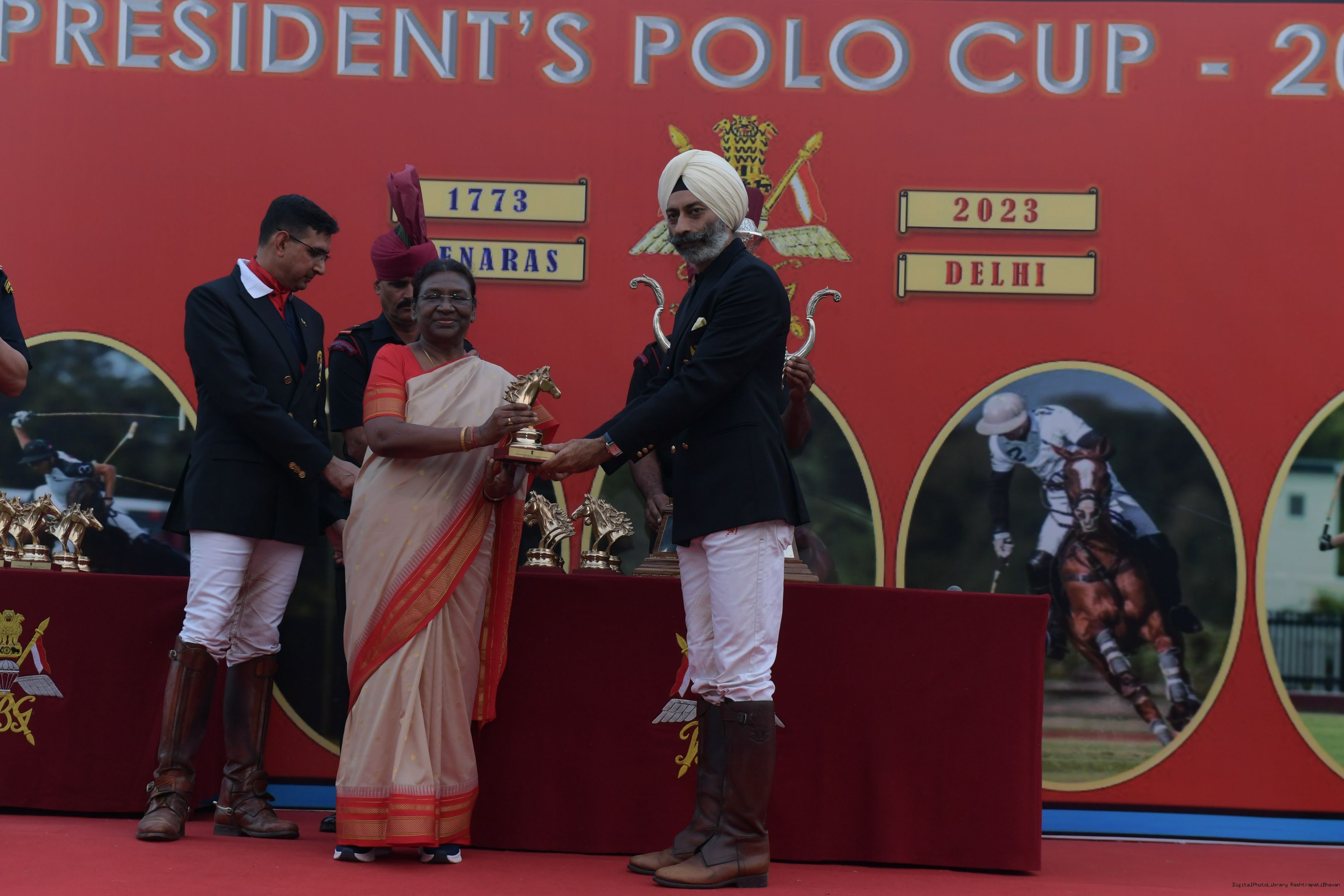 | Caption: | The President of India, Smt. Droupadi Murmu witnessed the President's Polo Cup Exhibition Match at PBG Parade Ground (Polo Field), in New Delhi on November 25, 2023. |