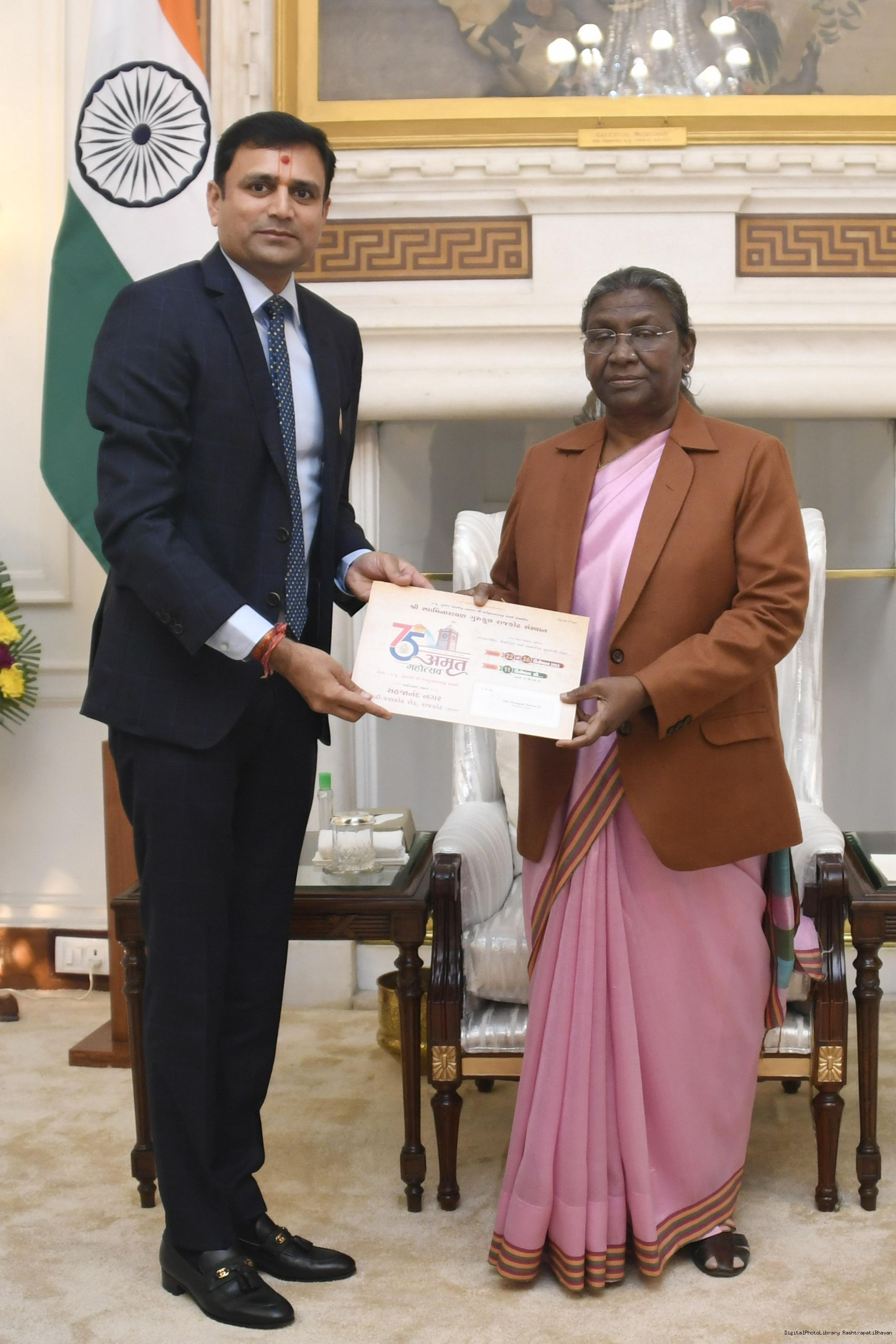 | Caption: | Shri Rakesh H. Dudhat,Trustee, Shree Swaminarayan Gurukul Rajkot Sansthan, Gujarat meeting with the President of India, Smt. Droupadi Murmu, at Rashtrapati Bhavan on Dec 15, 2022. |