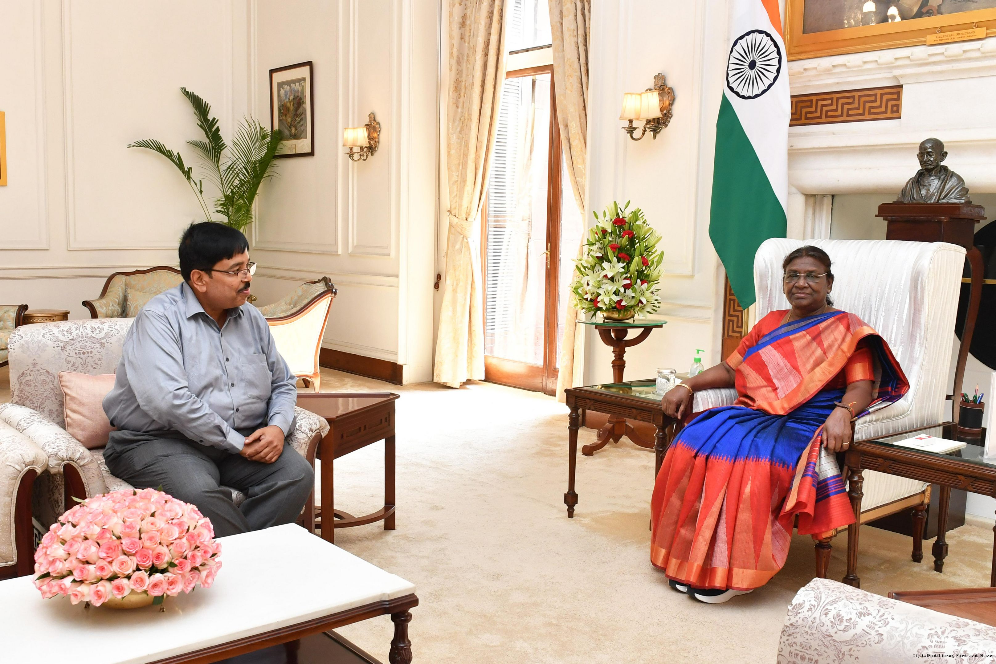 | Caption: | Shri Manoj Kumar Dhandhania from Rairangpur meeting with the President of India, Smt. Droupadi Murmu at Rashtrapati Bhavan on June 20, 2023. |
