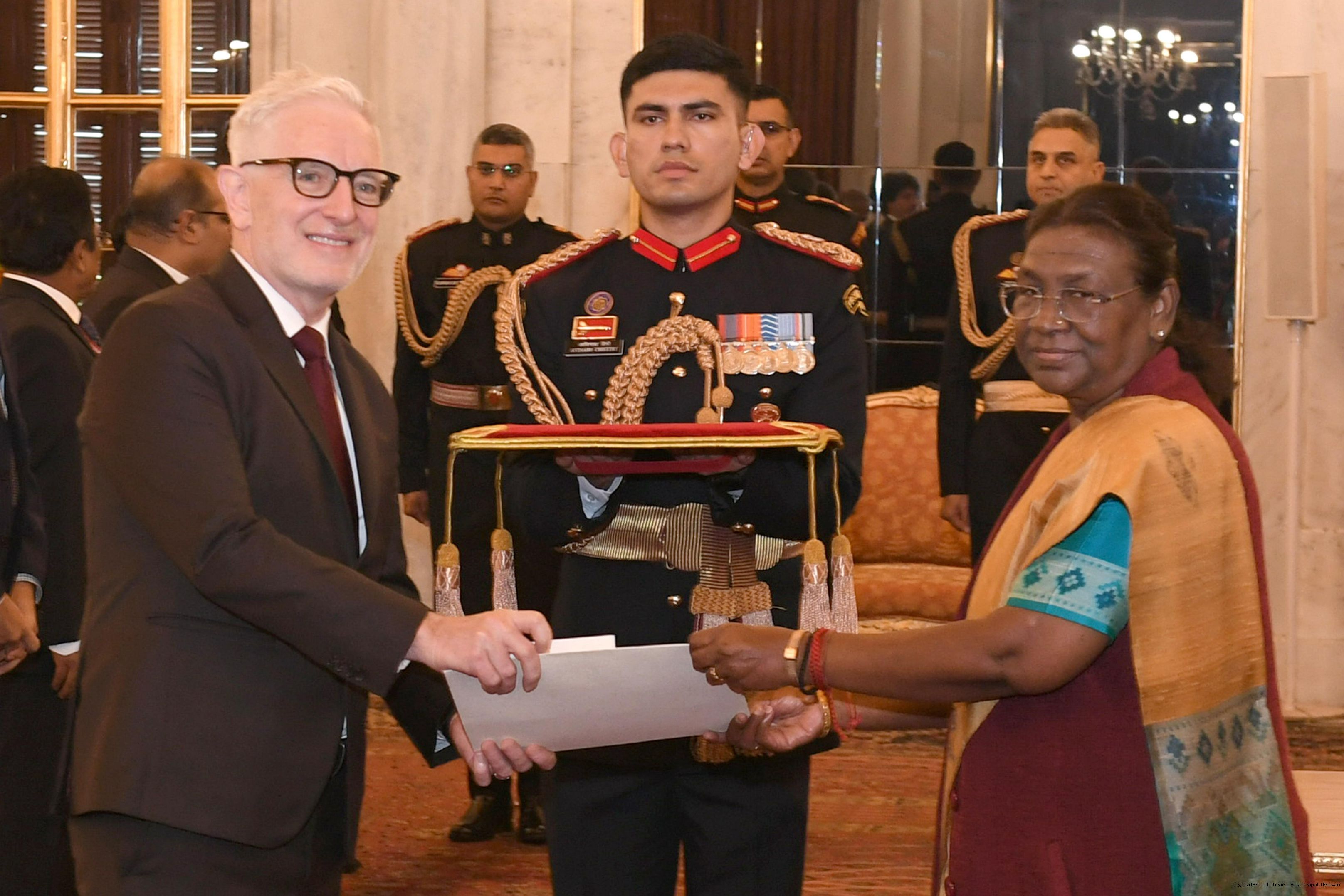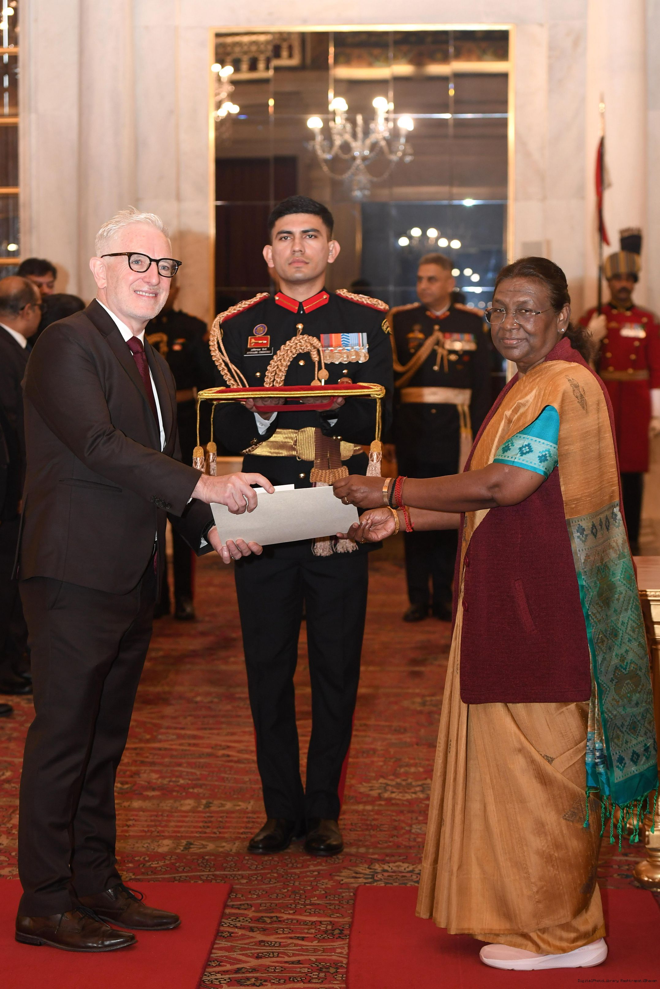 | Caption: | The Ambassador-designate of Ireland, H.E. Mr Kevin Kelly presenting his credentials to the President of India, Smt Droupadi Murmu at Rashtrapati Bhavan on November 28, 2023. |