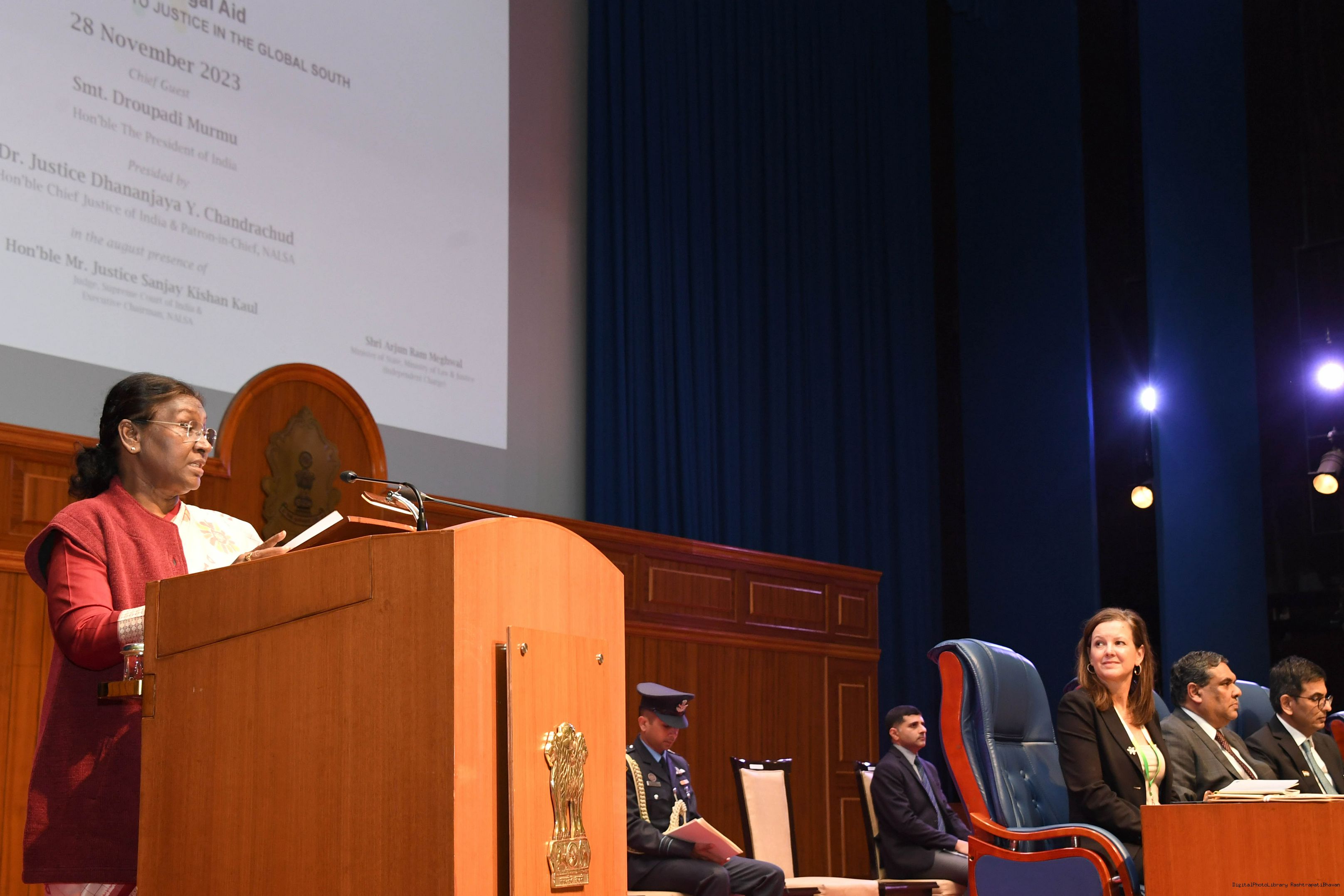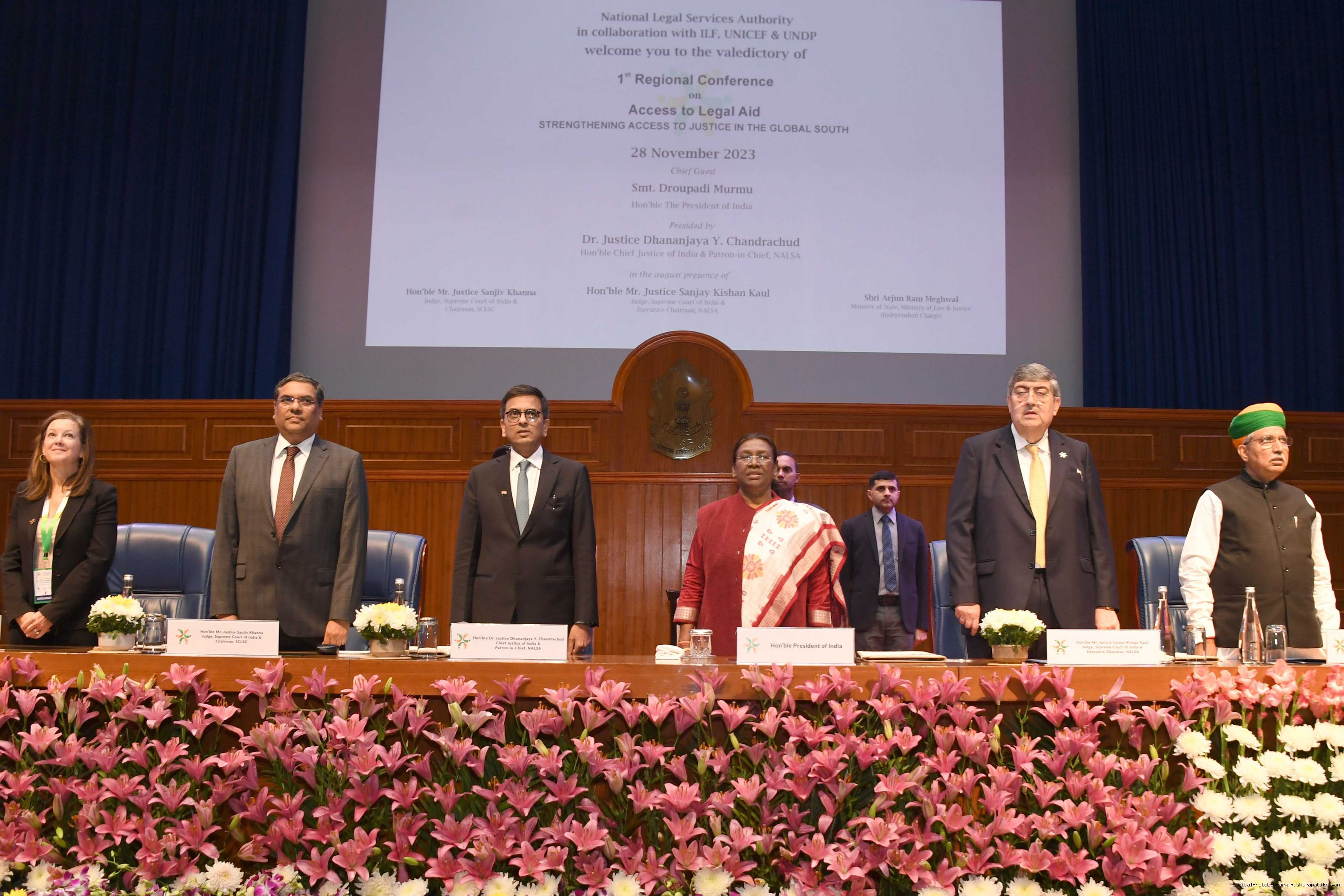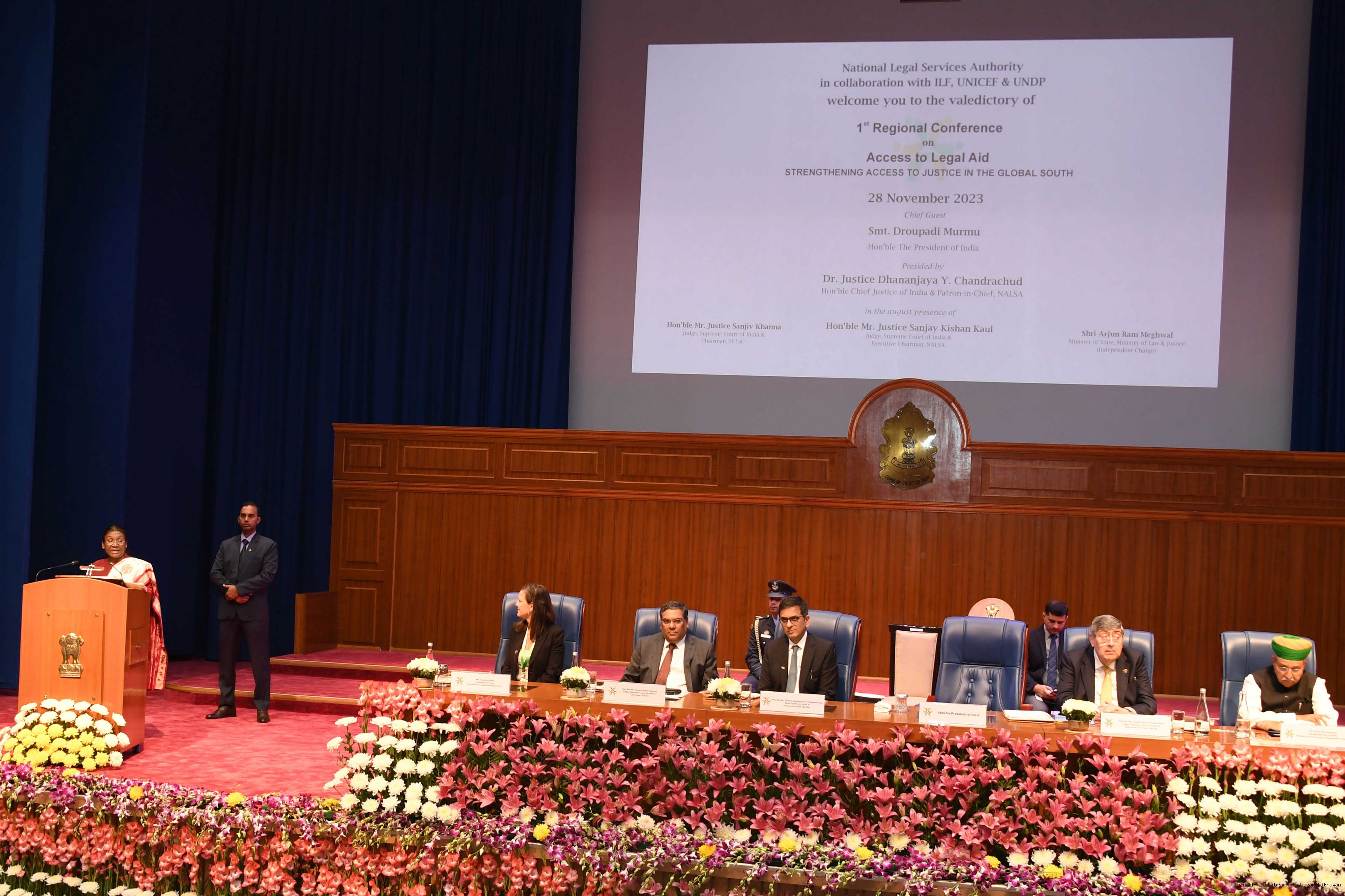 | Caption: | The President of India, Smt Droupadi Murmu graced the valedictory session of the 1st Regional Conference on ‘Access to Legal Aid: Strengthening Access to Justice in the Global South’ in New Delhi on November 28, 2023. |