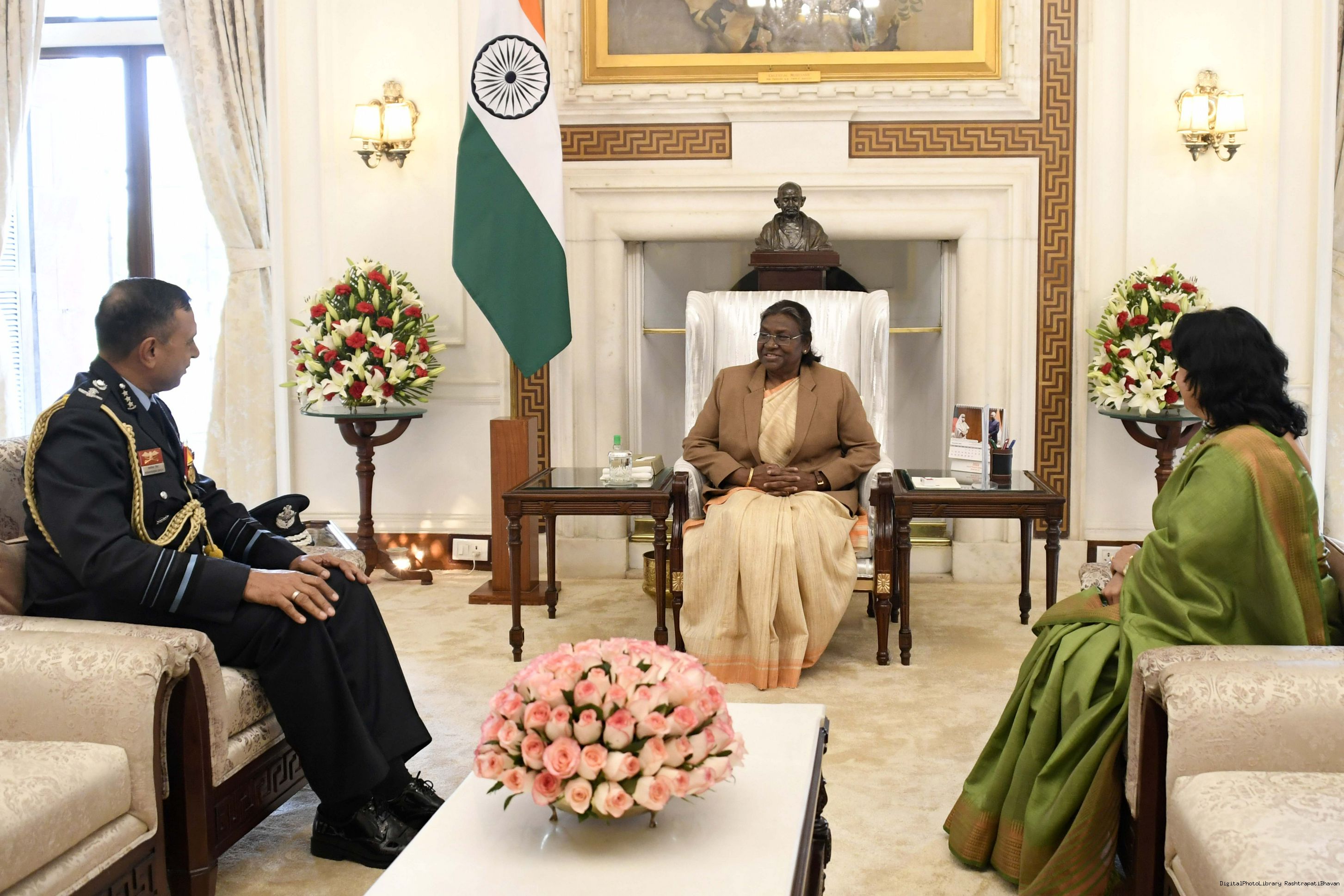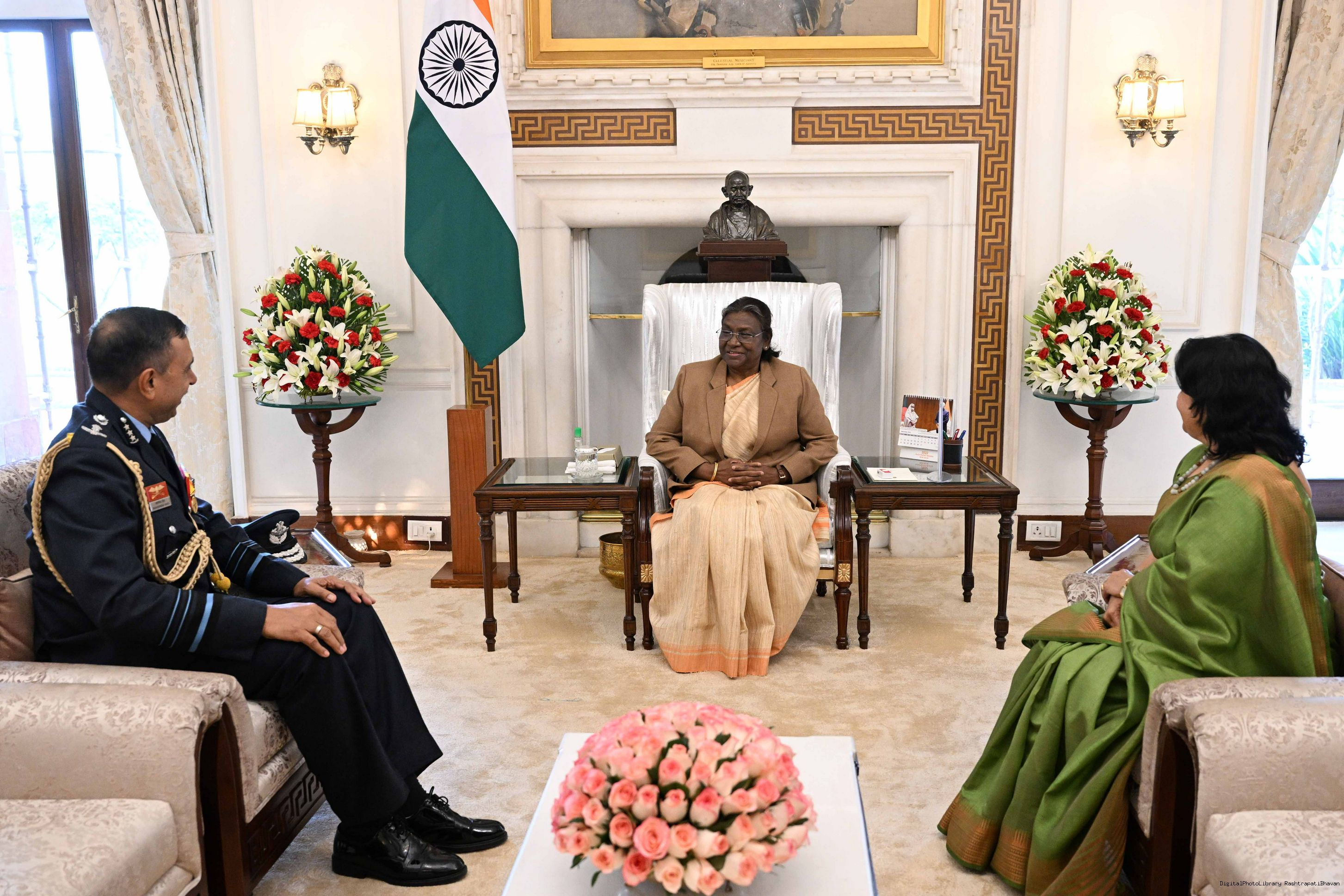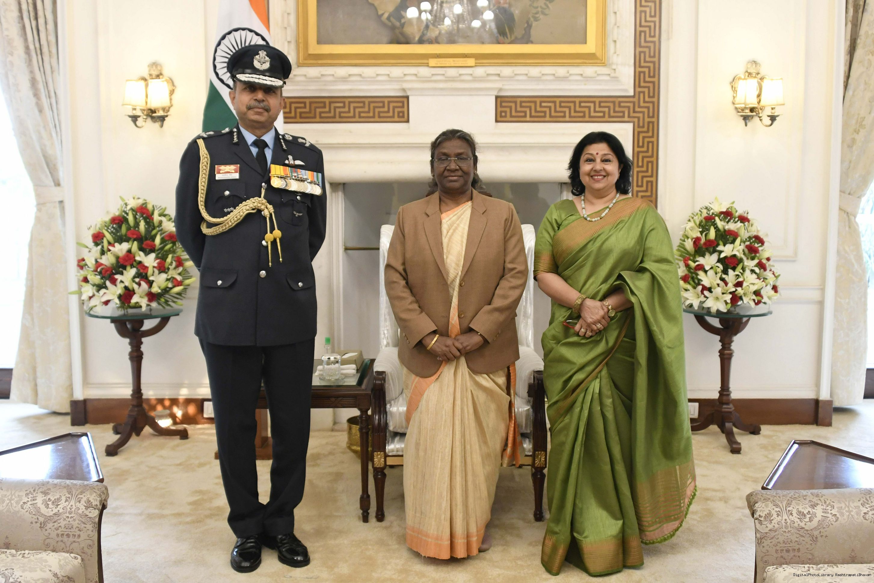 | Caption: | Air Marshal Manavendra Singh, PVSM, AVSM, VrC, VSM, ADC, Air Officer Commanding-in-Chief, HQ Training Command along with his wife Smt. Ambika Singh meeting with the President of India, Smt. Droupadi Murmu, at Rashtrapati Bhavan on Dec 22, 2022. |