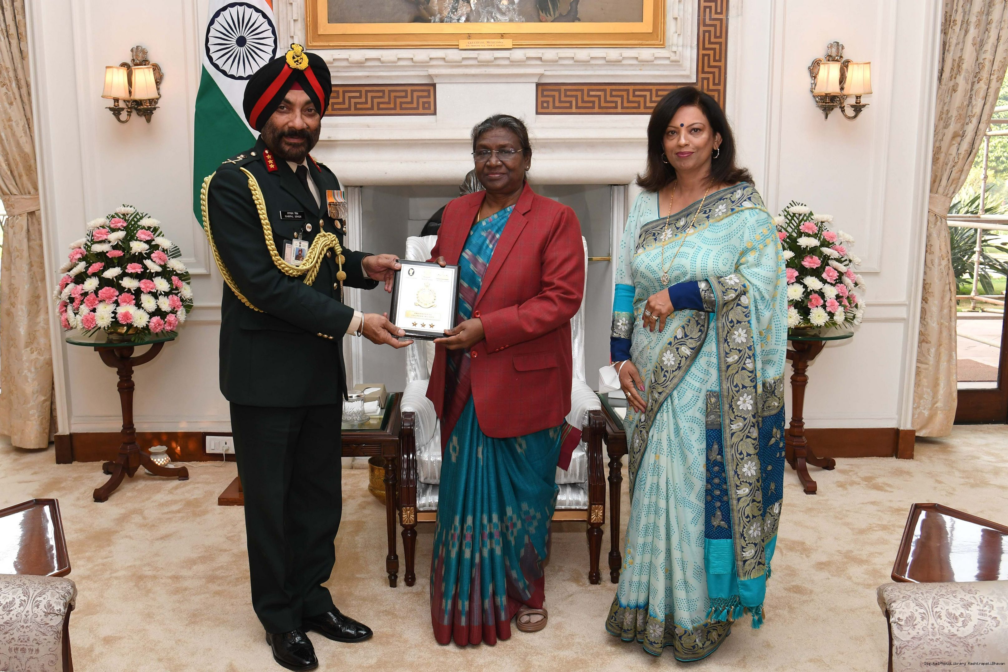 | Caption: | Lt. Gen. Harpal Singh, PVSM, AVSM, VSM, ADC, E-in-C along with his wife Smt. Kamaljeet Kaur meeting with the President of India, Smt. Droupadi Murmu, at Rashtrapati Bhavan on Dec 23, 2022. |