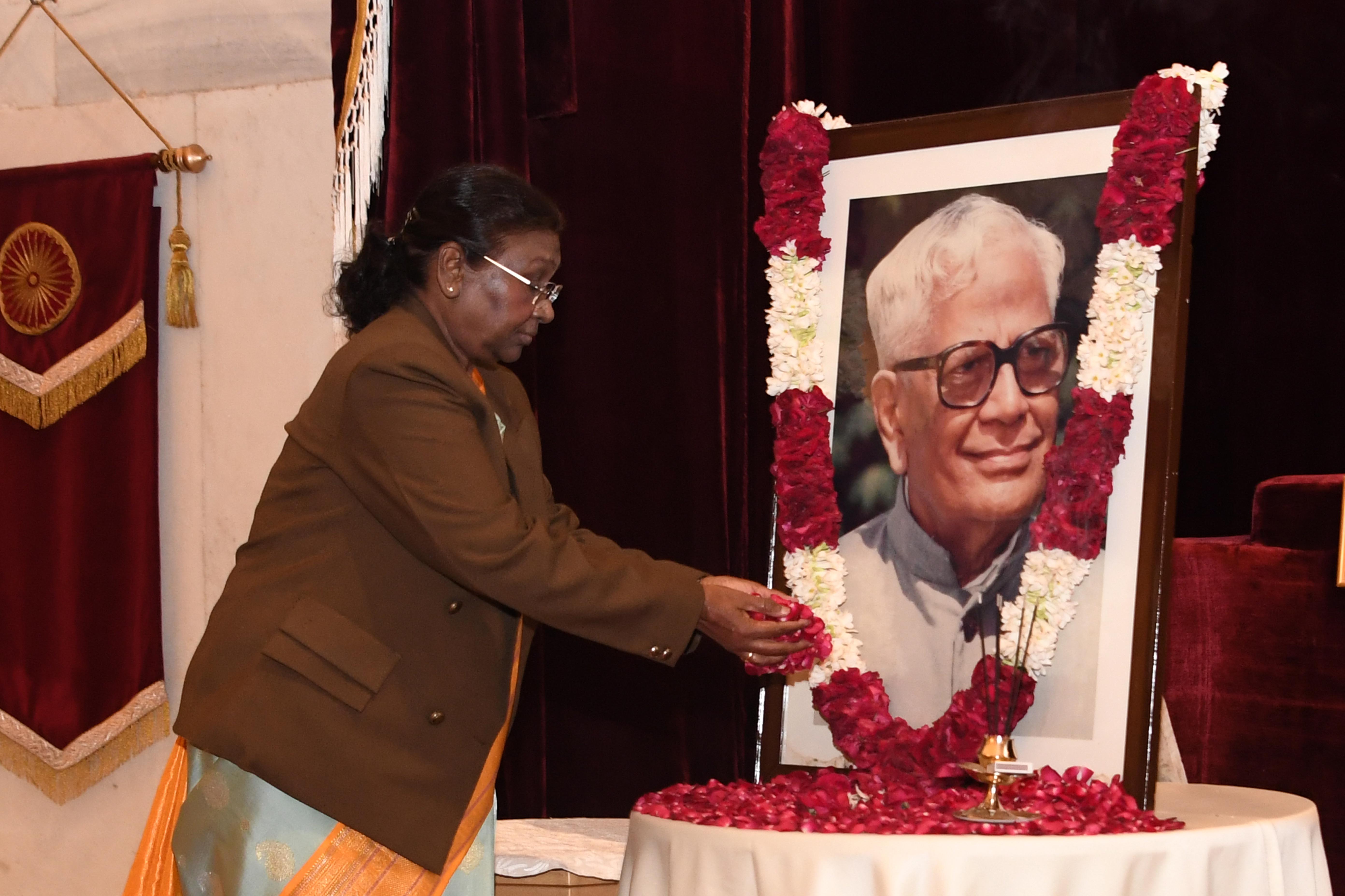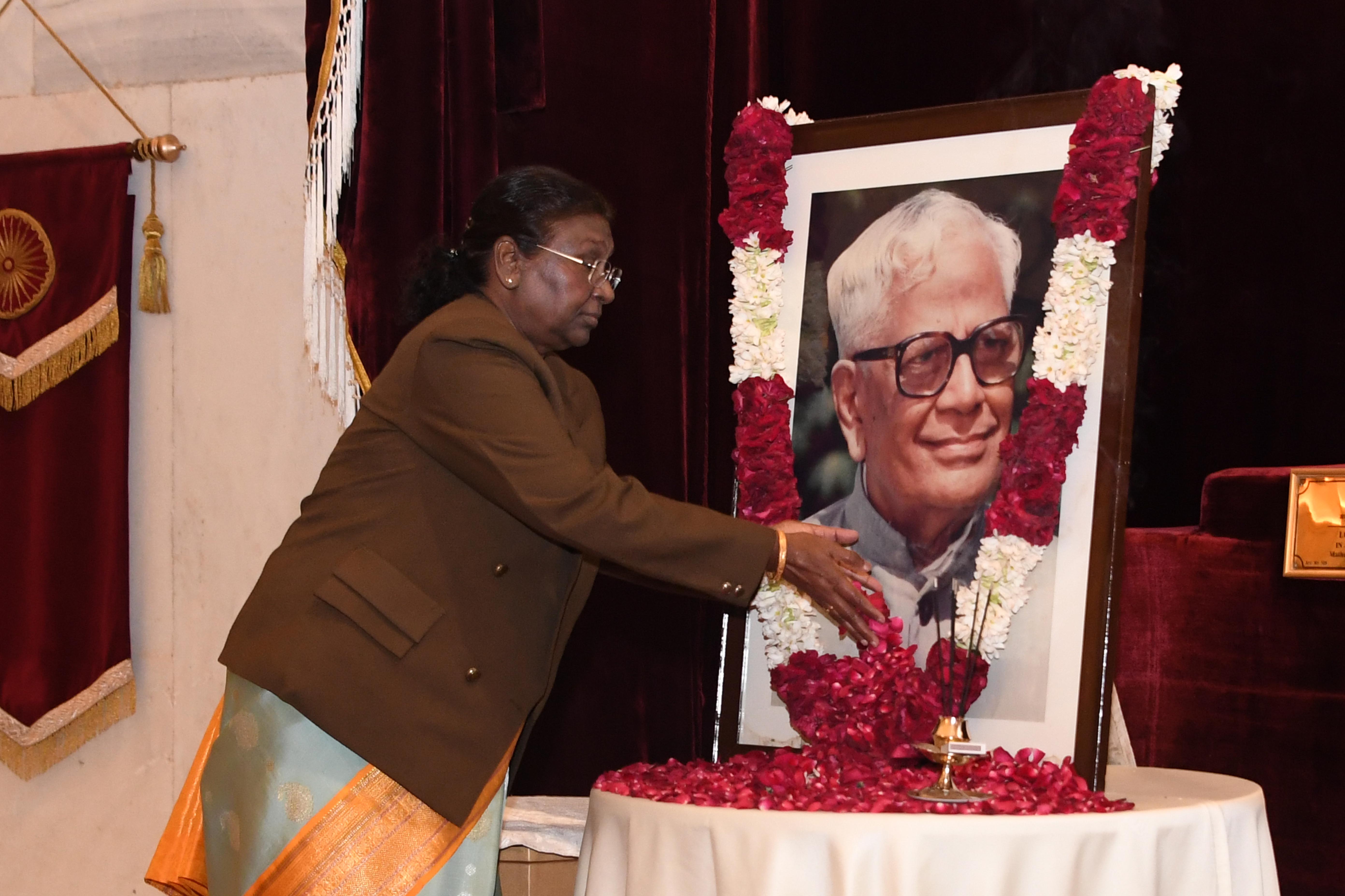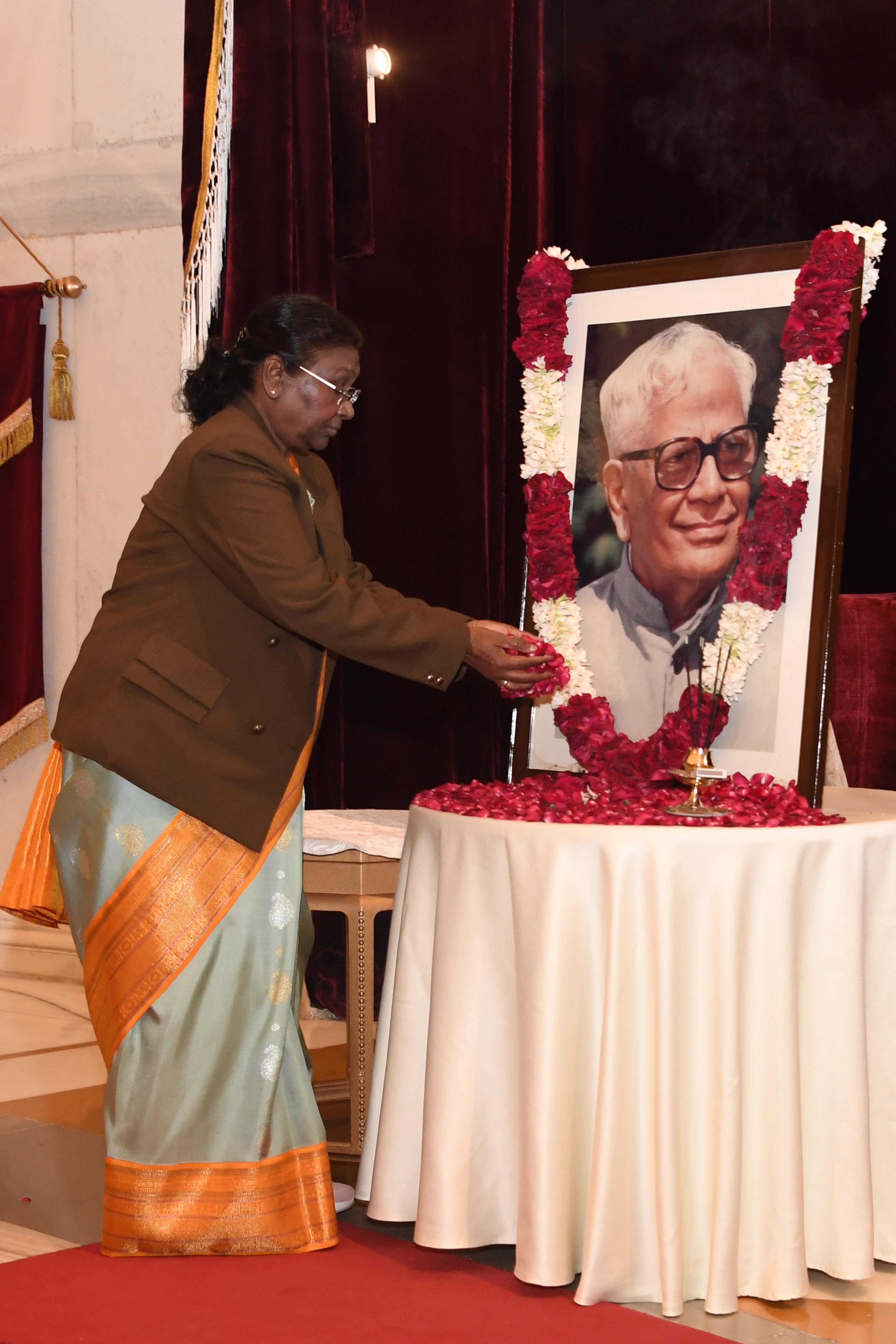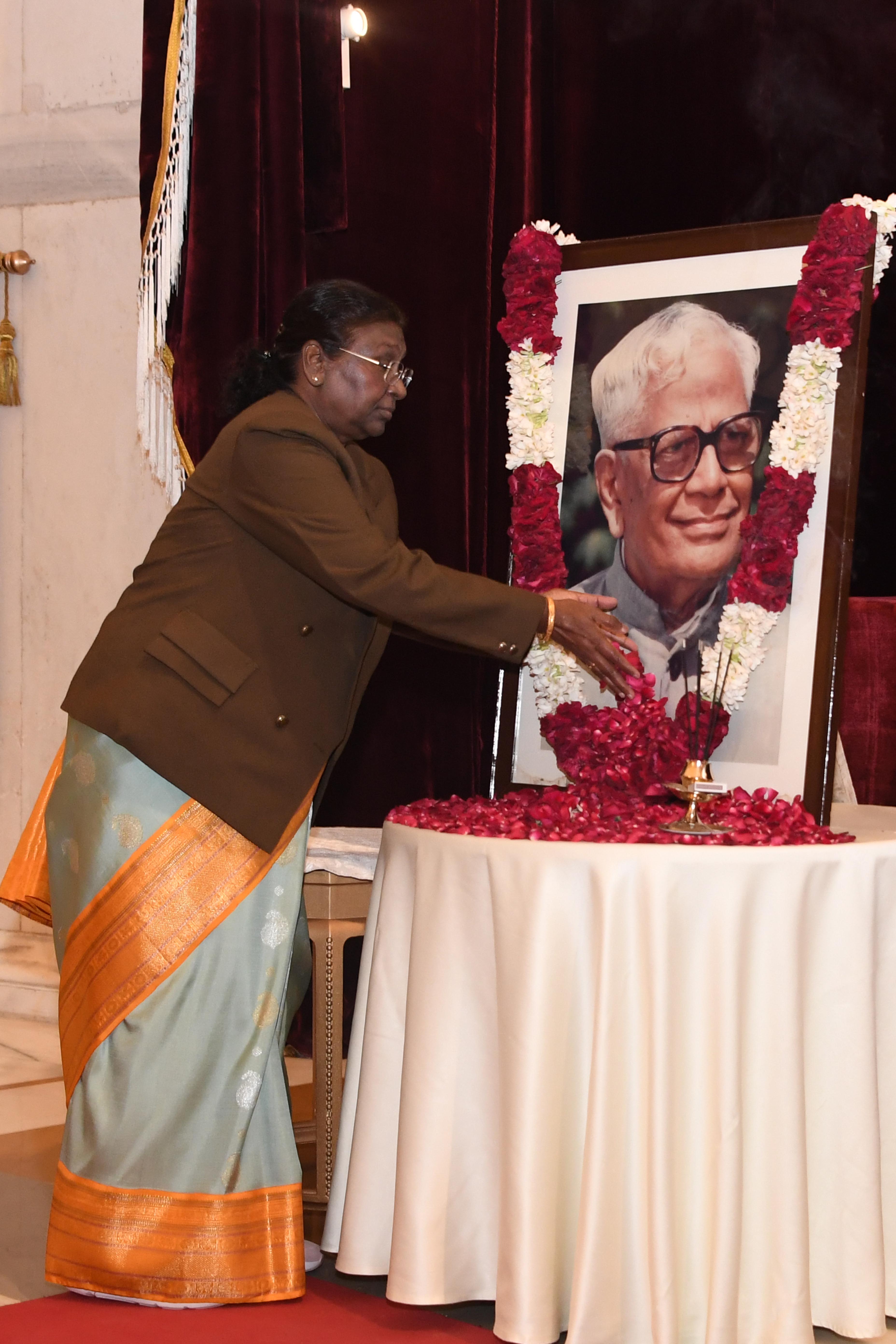 | Caption: | The President of India, Smt Droupadi Murmu paid floral tributes to Shri R. Venkataraman, former President of India, on his birth anniversary at Rashtrapati Bhavan on December 4, 2023. |