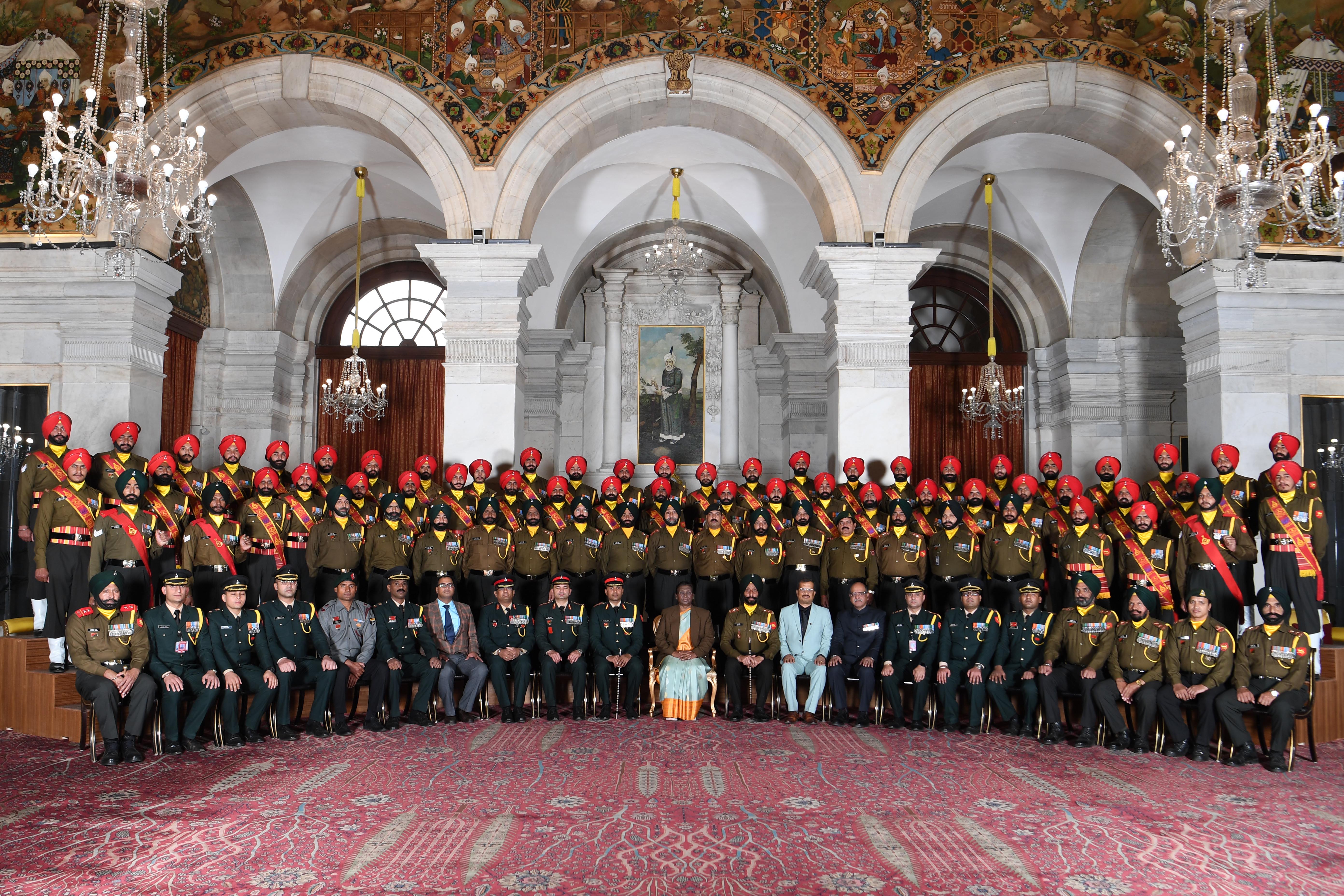 | Caption: | The President of India Smt. Droupadi Murmu posing a group Photograph with Serving personnel of the 6th SIKH Ceremonial Battalion at Rashtrapati Bhavan on December 4, 2023 |