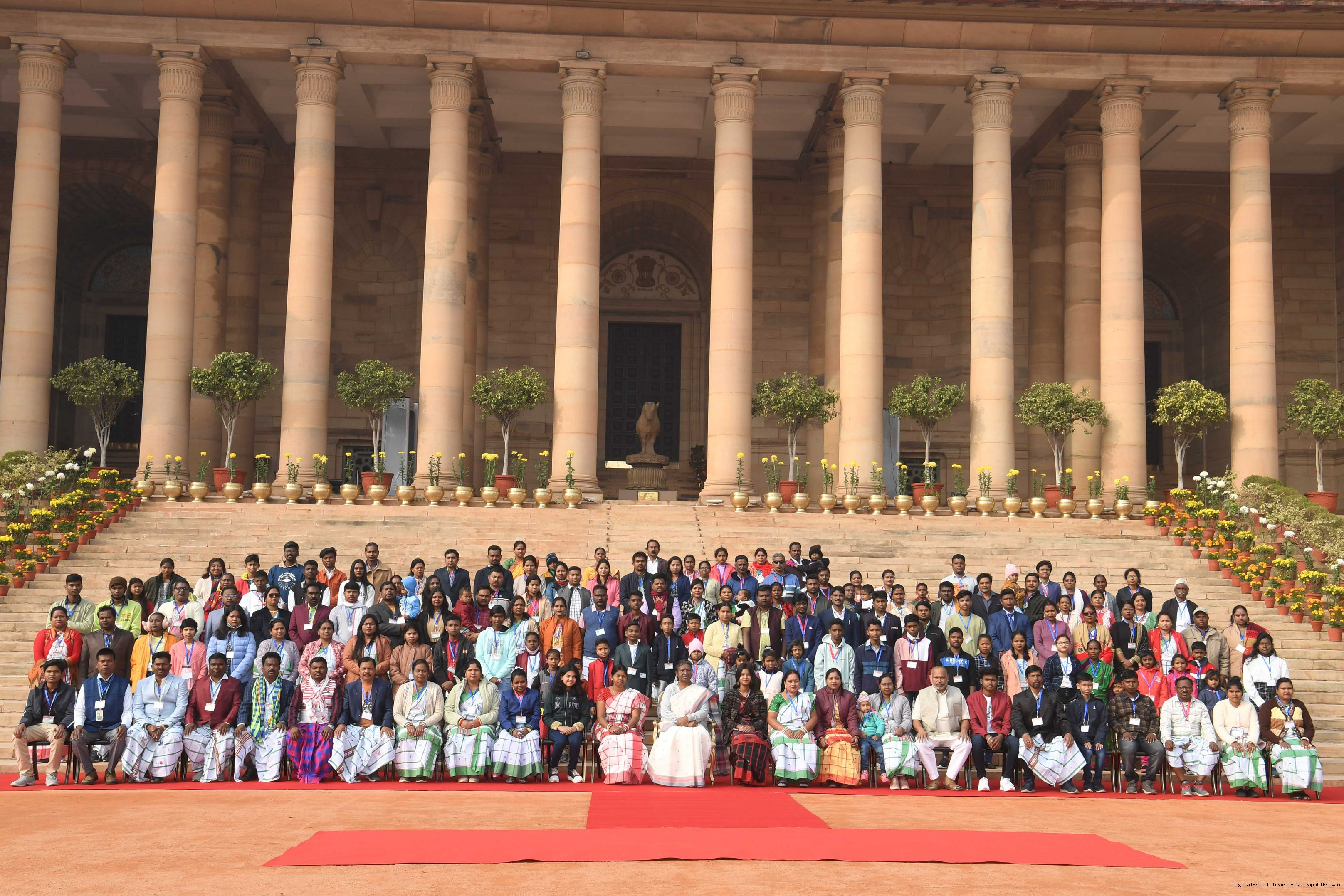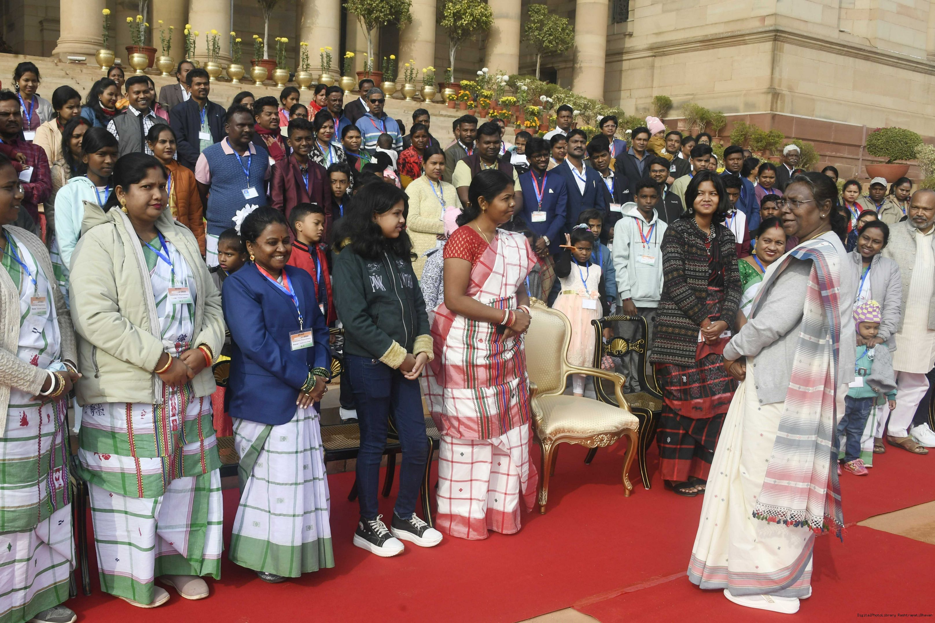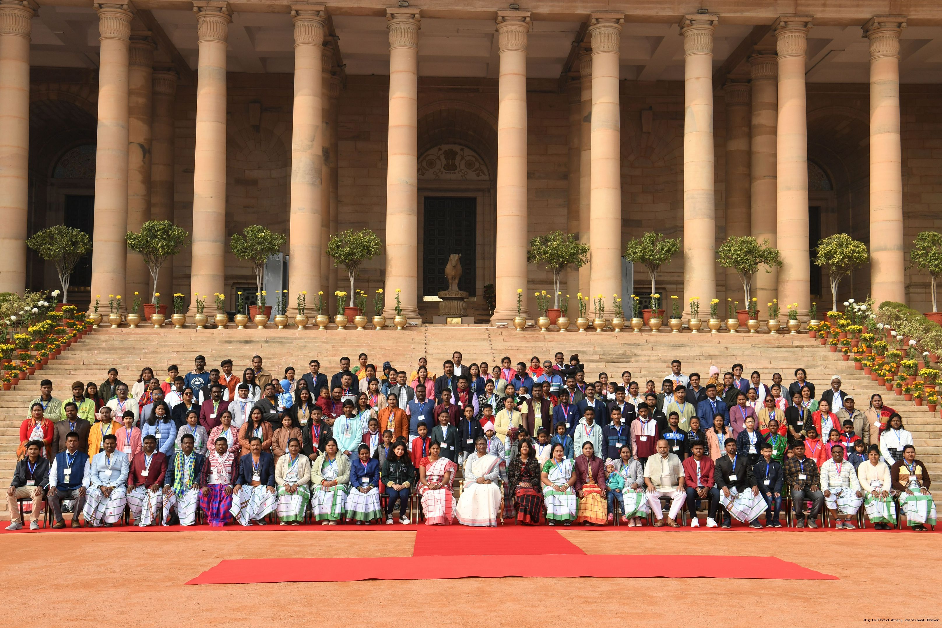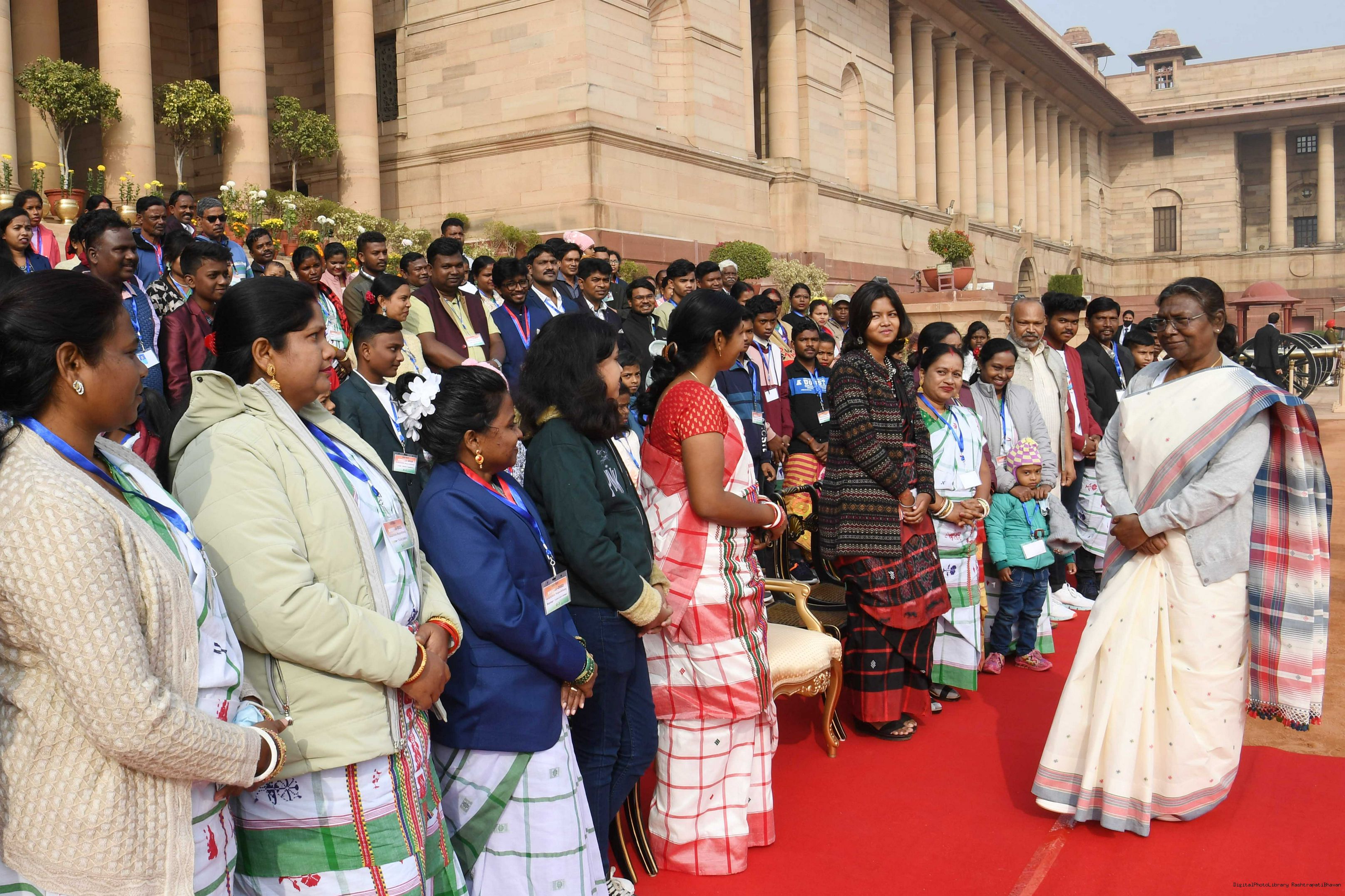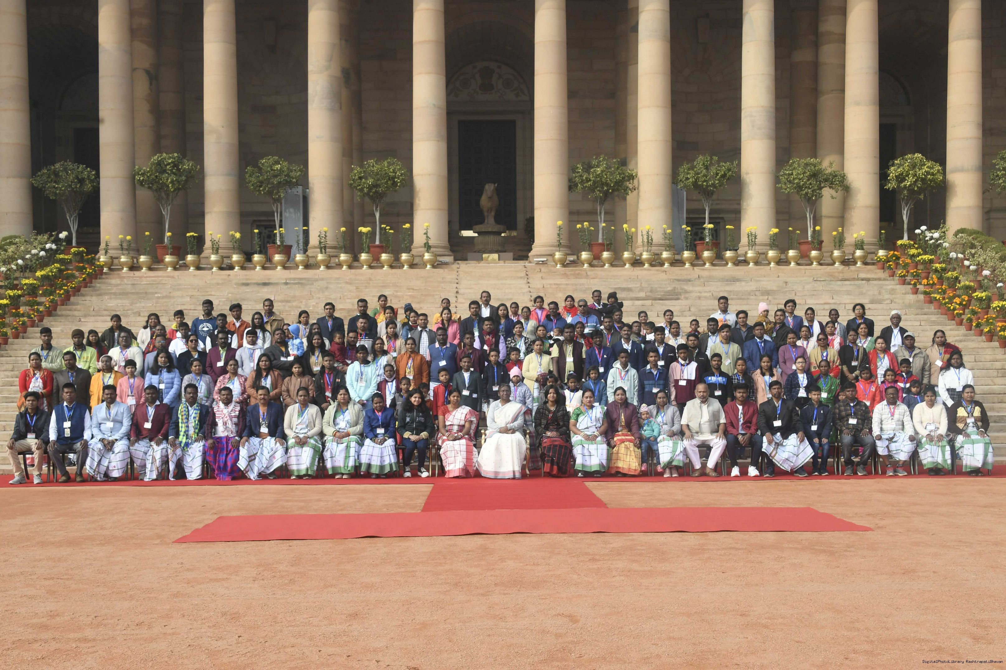| Caption: | The President of India, Smt. Droupadi Murmu posing a Group Photograph with the members of All India Santal Diploma Engineers' Welfare Association (AISDEWA), Baripada, Mayurbhanj District, Odisha Dec 25, 2022. |