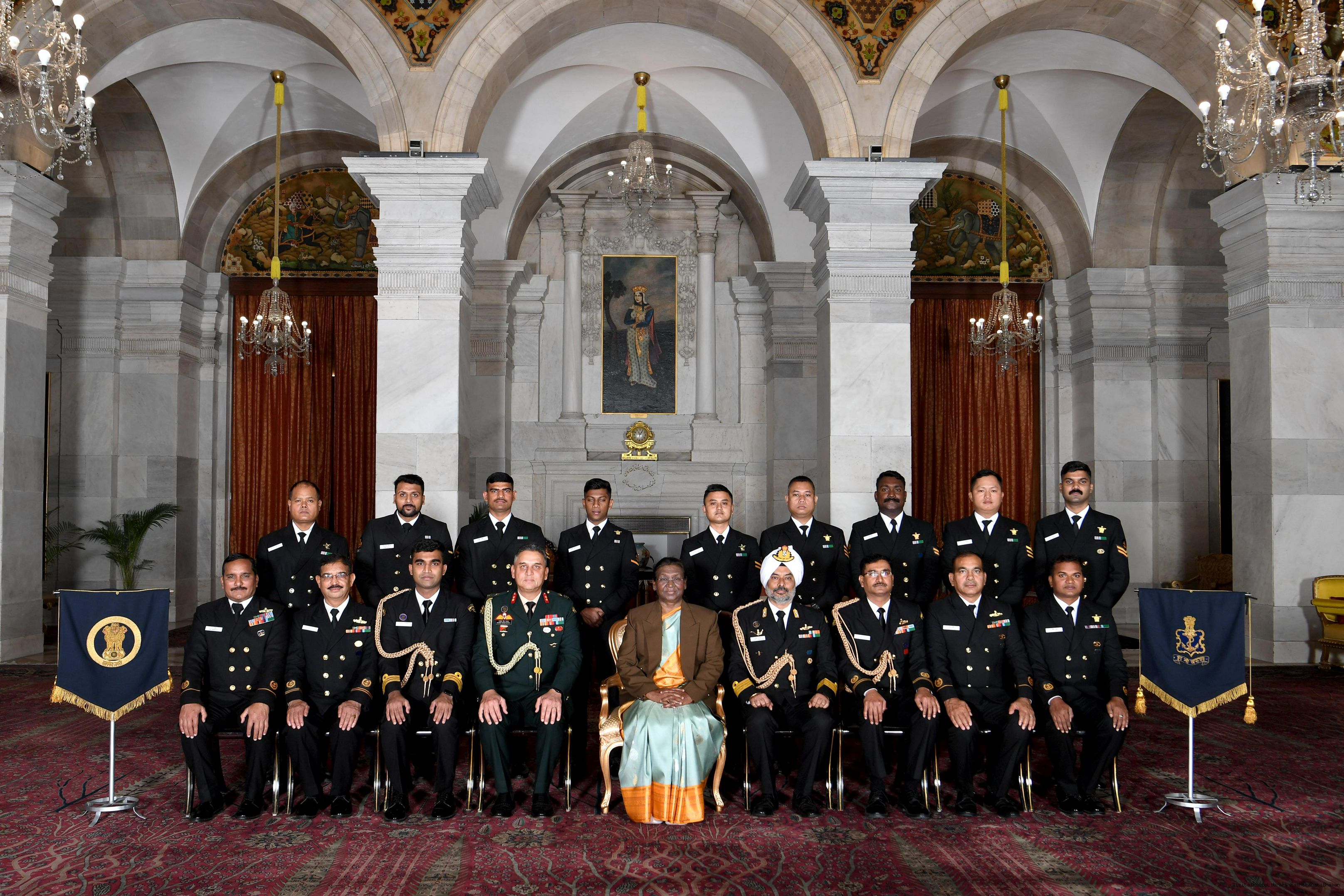 | Caption: | The President of India Smt. Droupadi Murmu posing a Group Photograph with Naval personnel of Rashtrapati Bhavan on December 4, 2023 |