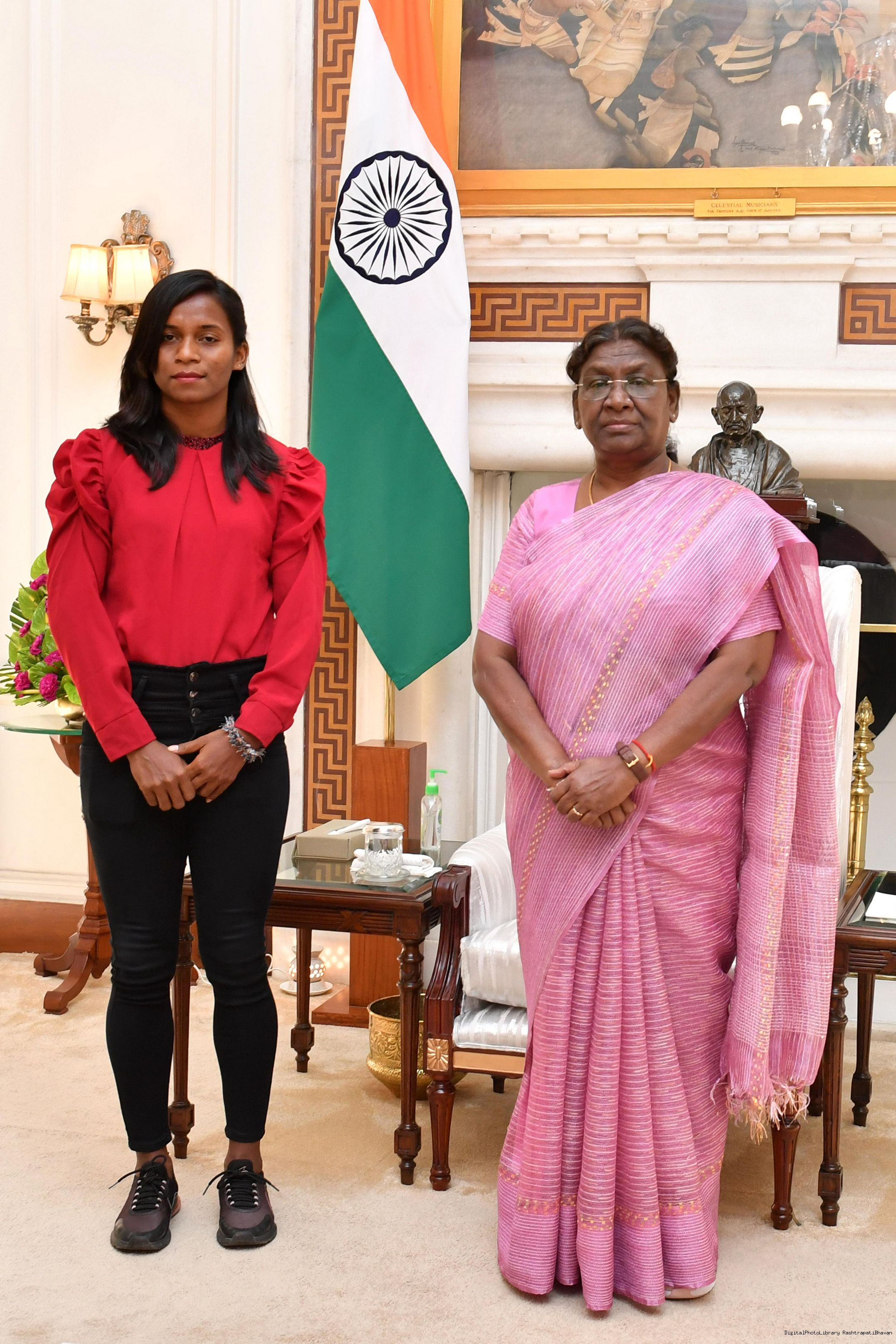 | Caption: | Ms. Jauna Murmu, International Athlete from District Mayurbhanj meeting with the President of India, Smt. Droupadi Murmu at Rashtrapati Bhavan on June 22, 2023. |