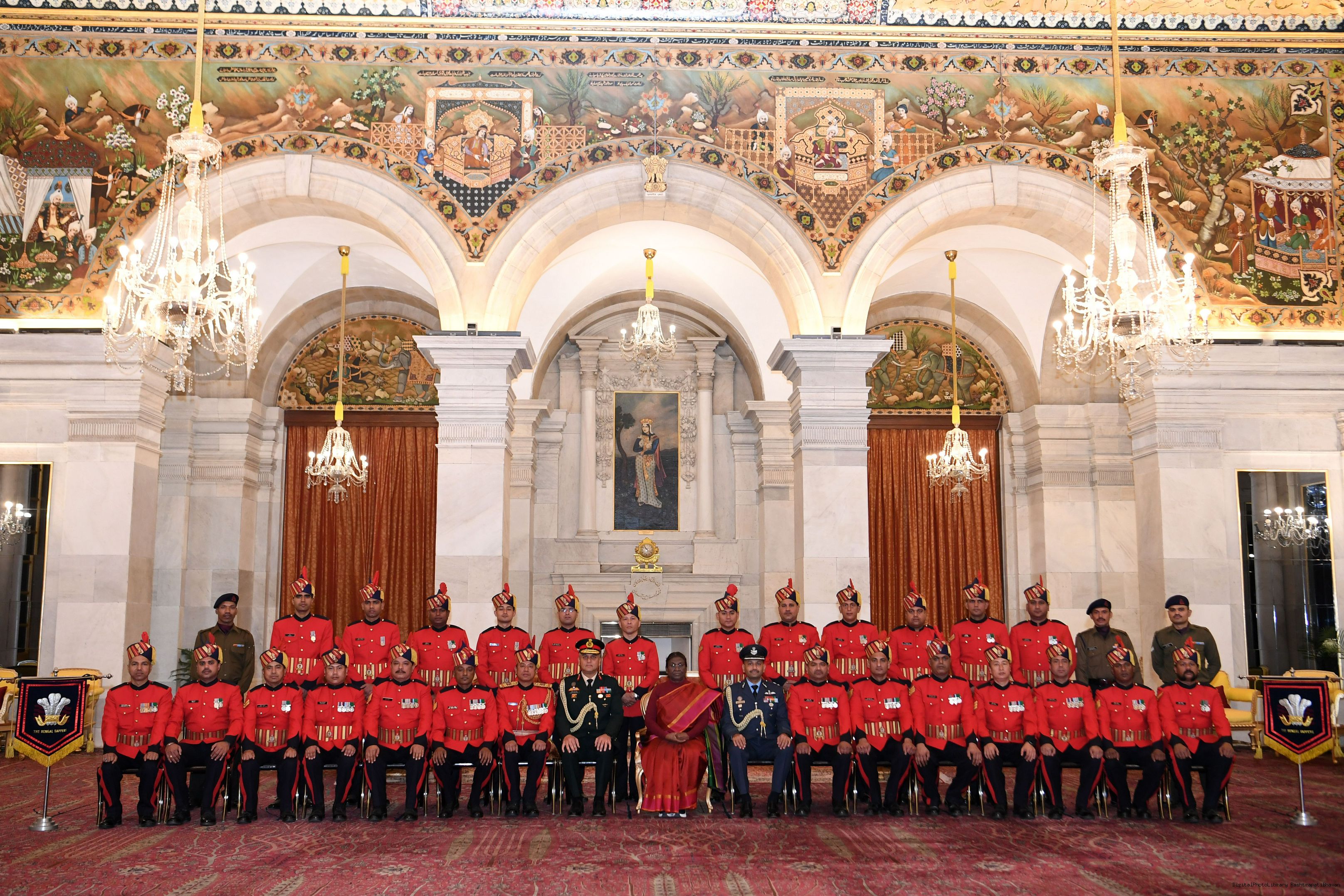 | Caption: | The President of India, Smt. Droupadi Murmu Group Photograph with Military Band (Bengal Engineers Roorkee) personel atteched with Rashtrapati Bhavan on Jan 03, 2024. |