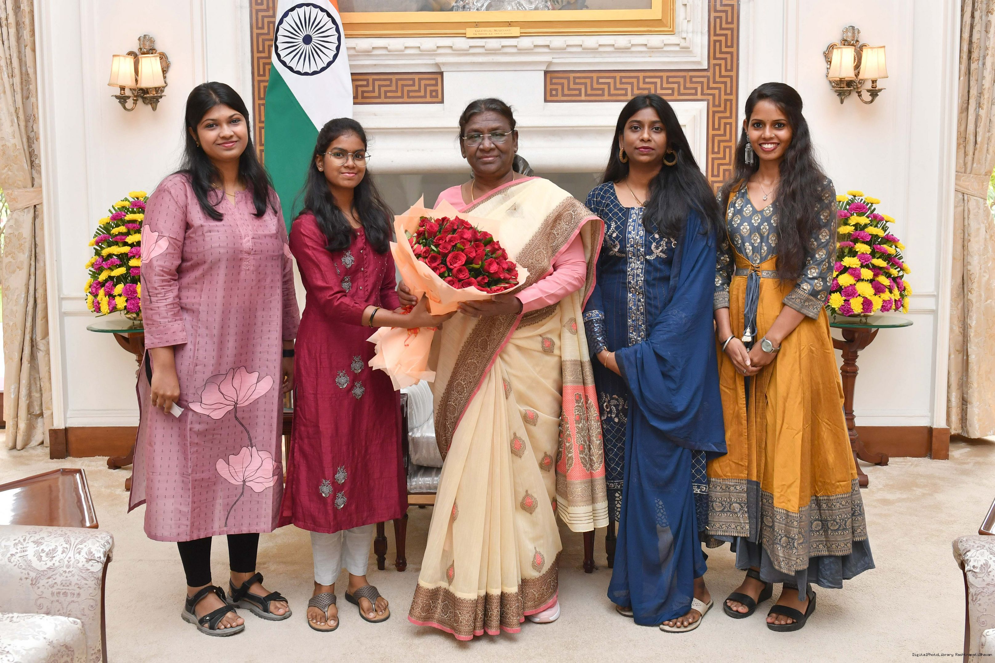 | Caption: | Ms. Anwesha Mohanta along with others meeting with the President of India, Smt. Droupadi Murmu at Rashtrapati Bhavan on June 23, 2023. |