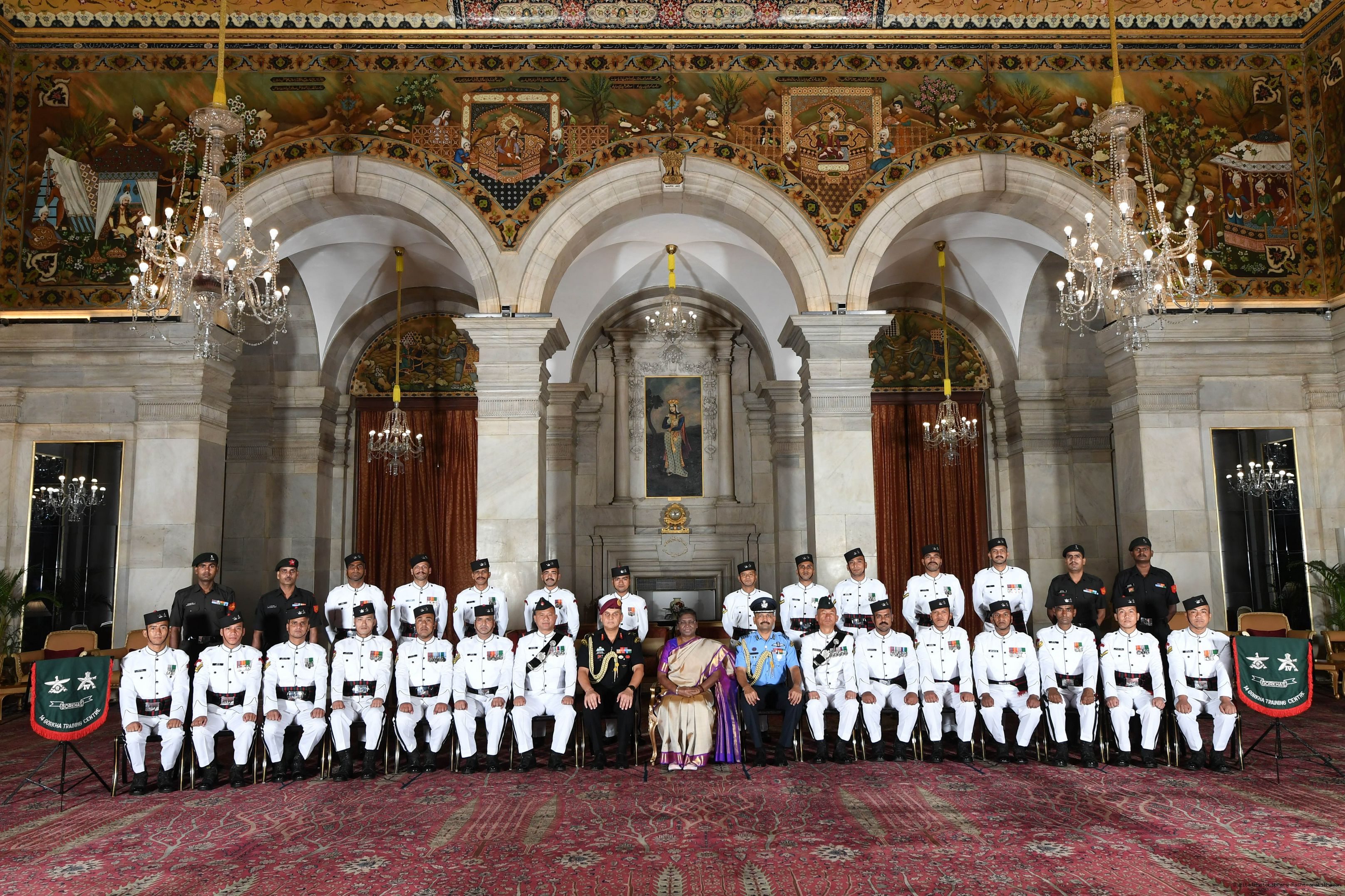 | Caption: | The President of india Smt. Droupadi Murmu posing a Group Photograph with Military Band (14, GTC) attached with Rashtrapati Bhavan at Rashtrapati Bhavan on June 30, 2023. |
