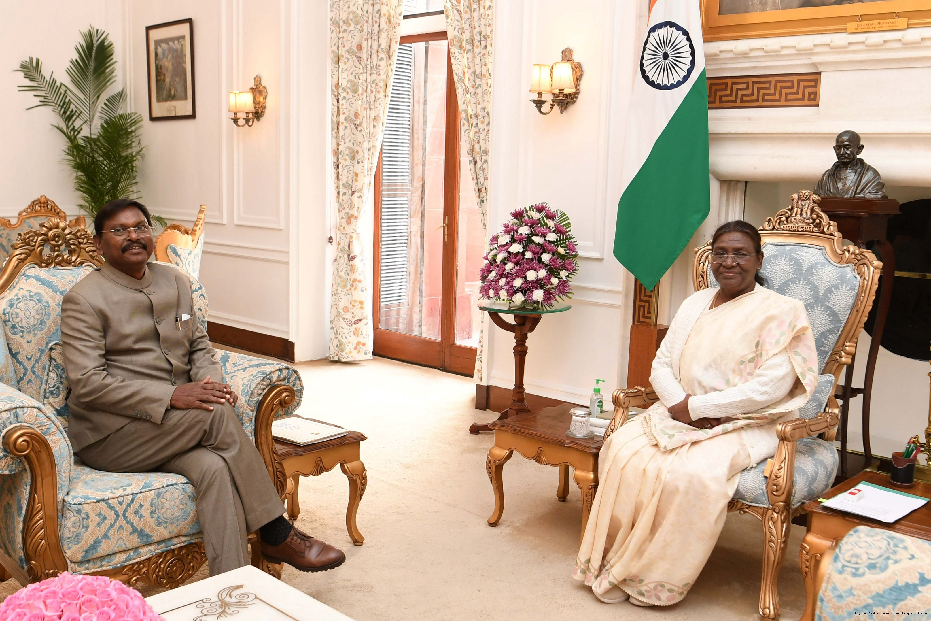 | Caption: | Shri Arjun Munda, Minister of Tribal Affairs, Agriculture Farmers Welfare, Govt. of India meeting with the President of India, Smt. Droupadi Murmu, at Rashtrapati Bhavan on Jan 18, 2024. |