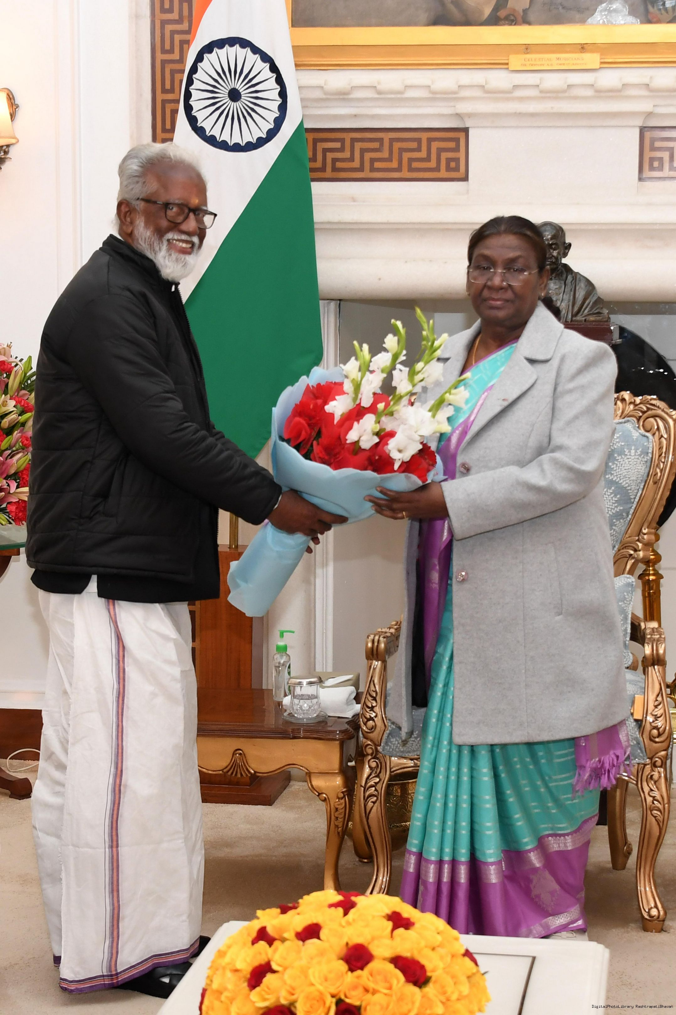 | Caption: | Shri Kummanam Rajasekharan, Former Governor of Mizoram and Chairman, Sugathakumari Navathi Celebrations Committee meeting with the President of India, Smt. Droupadi Murmu, at Rashtrapati Bhavan on Jan 24, 2024. |