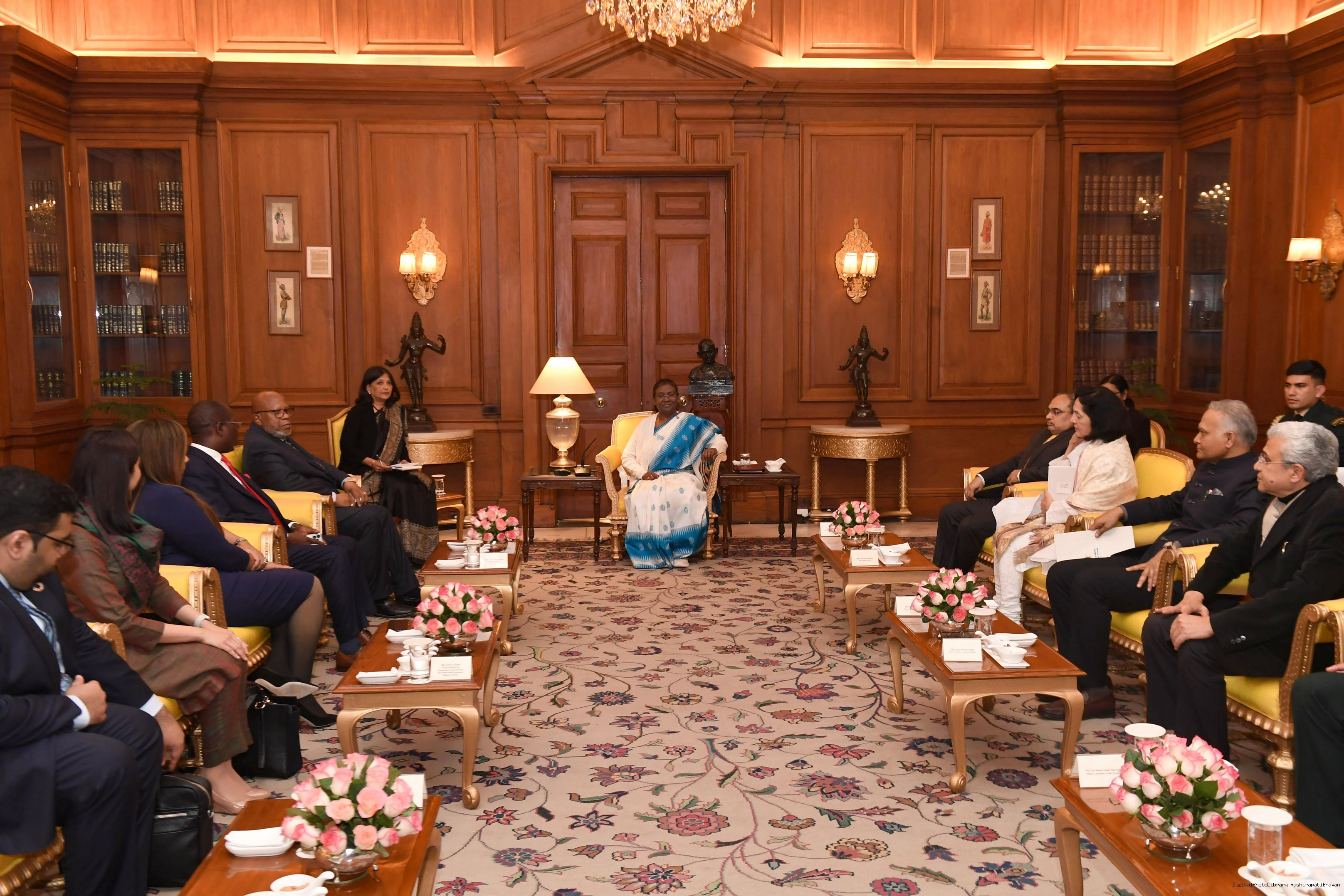 | Caption: | The President of the 78th session of the United Nations General Assembly (UNGA), H.E. Mr. Dennis Francis called on the President of India, Smt Droupadi Murmu at Rashtrapati Bhavan on January 24, 2024. |