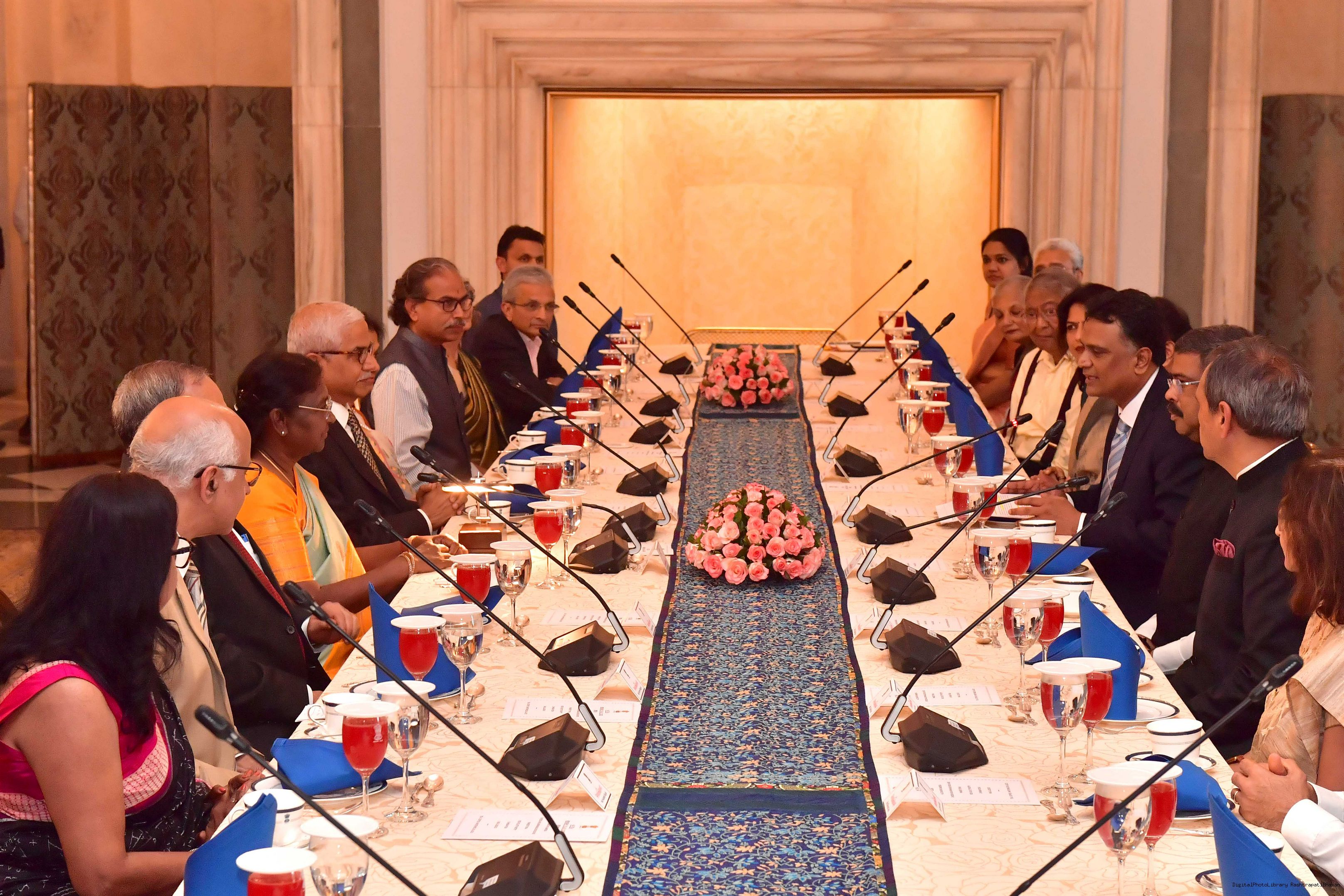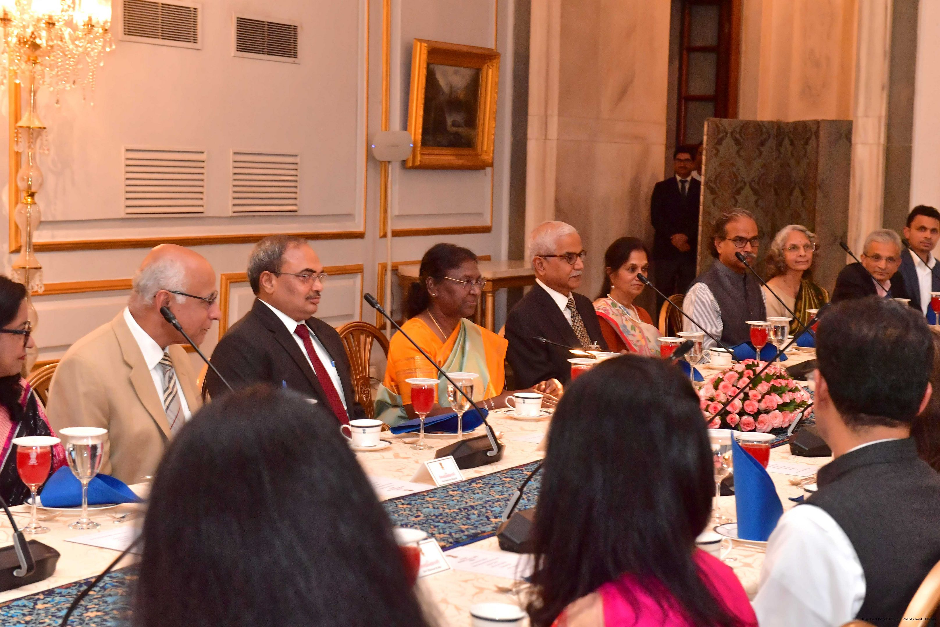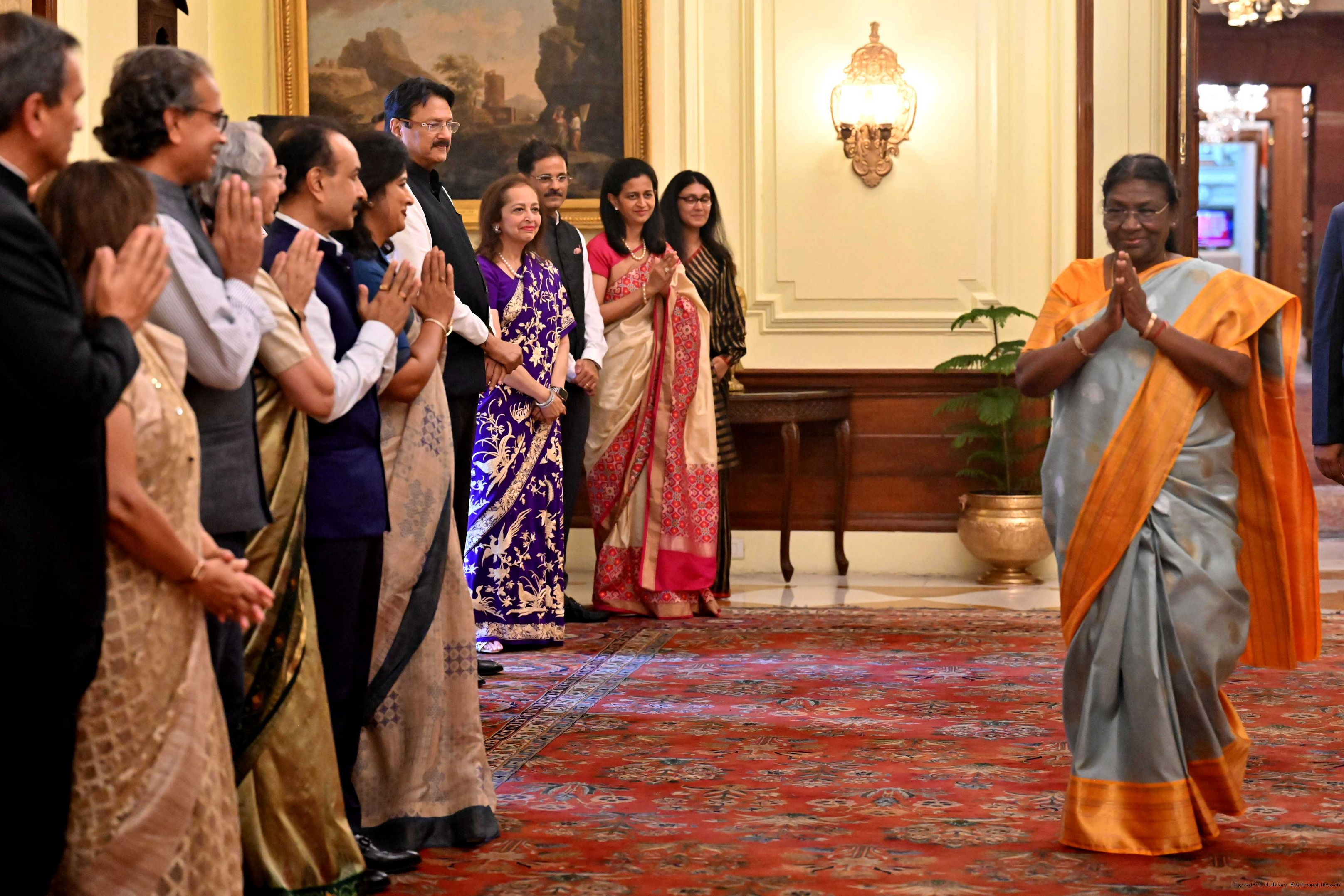 | Caption: | The President of India, Smt Droupadi Murmu meeting with Eminent Personalities followed by Hi Tea at Rashtrapati Bhavan on July 10, 2023. |