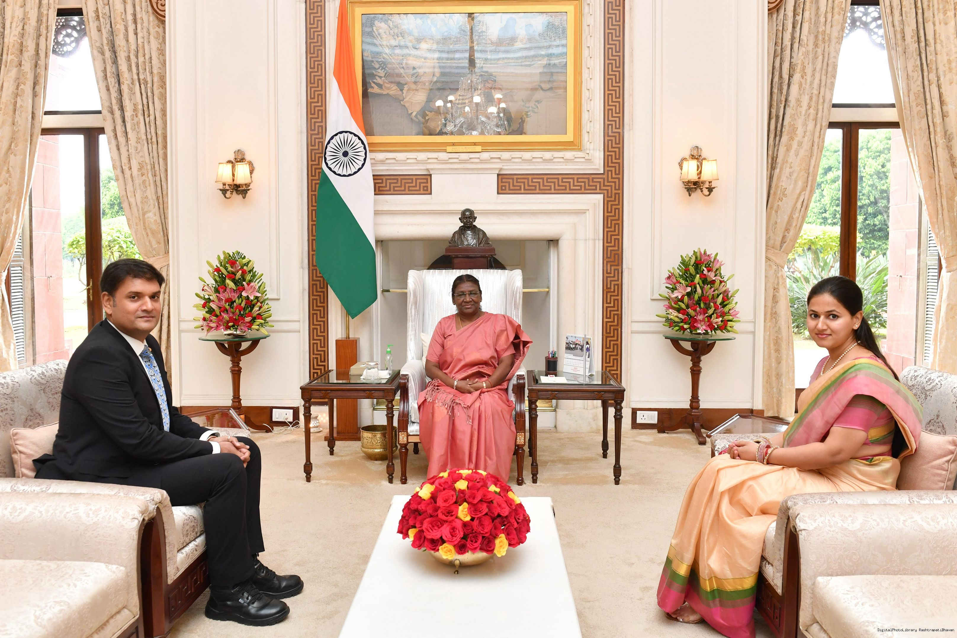 | Caption: | Shri Balram, Addl DCP, PSO to the President along with his wife Mrs. Apoorva Gupta meeting with the President of India, Smt. Droupadi Murmu at Rashtrapati Bhavan on July 11, 2023. |