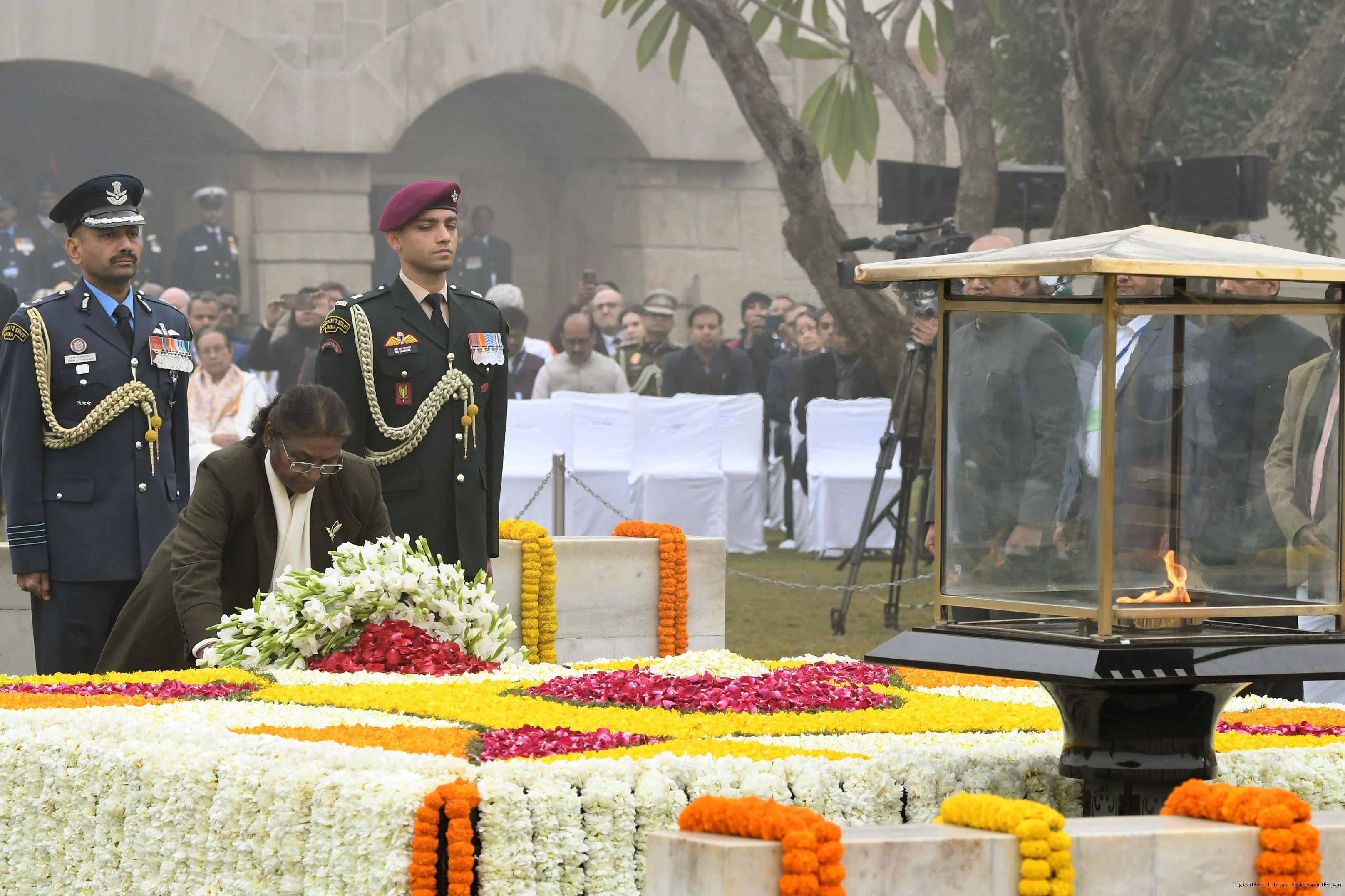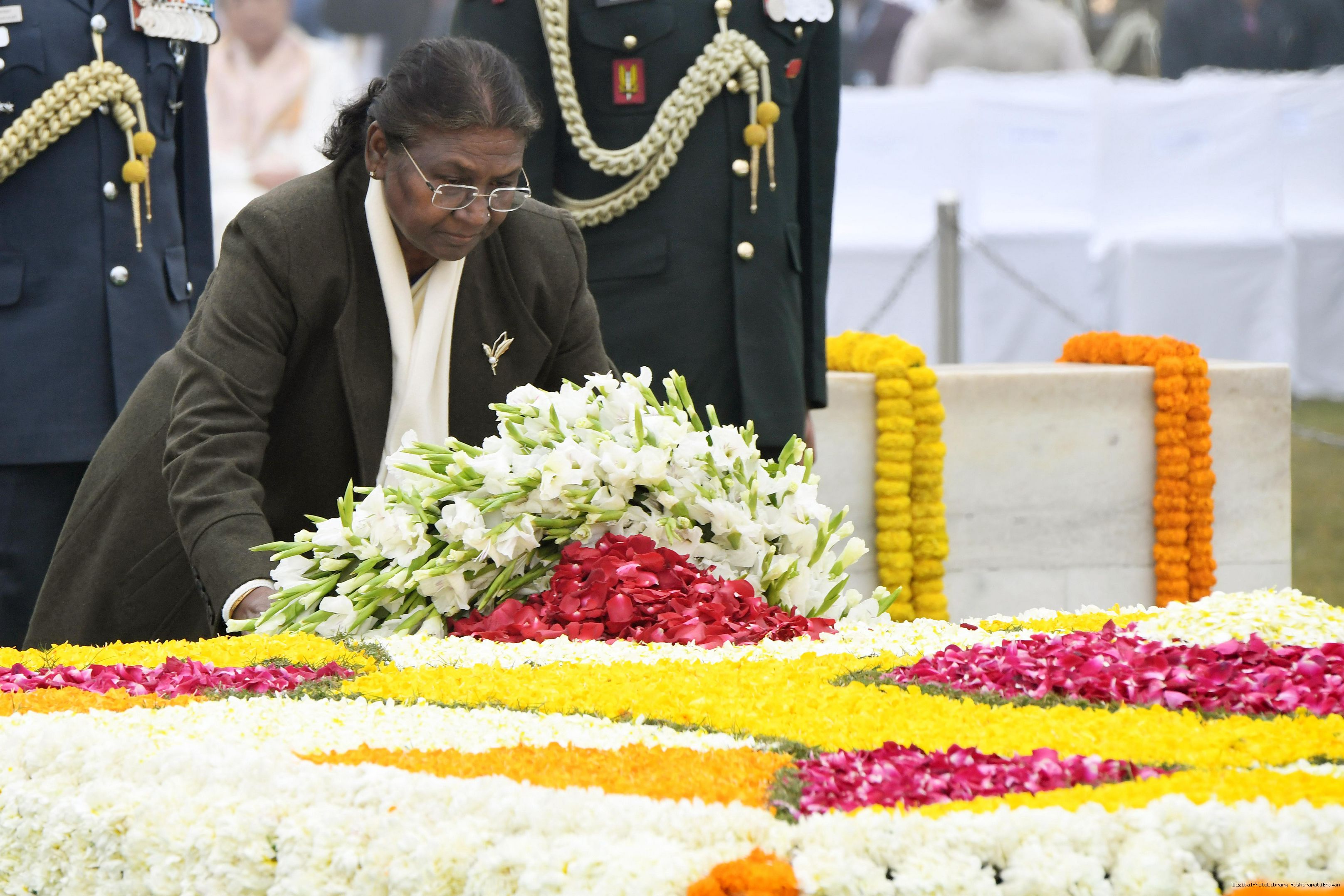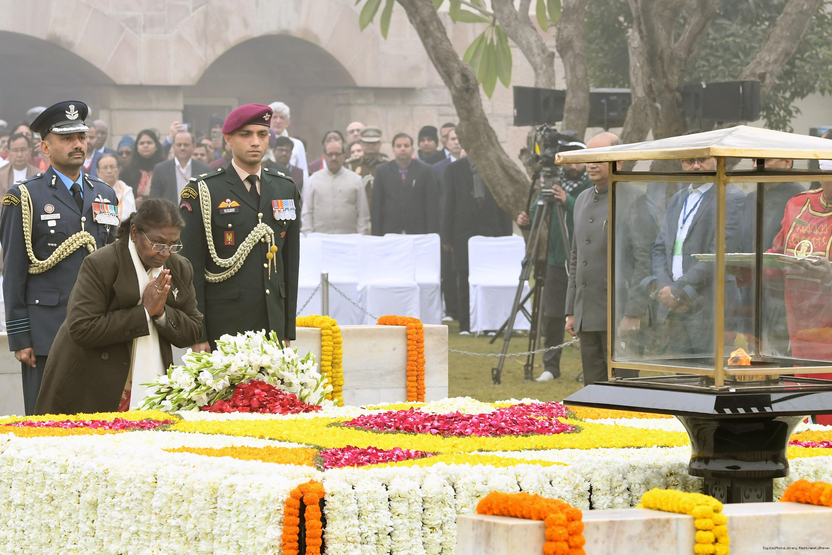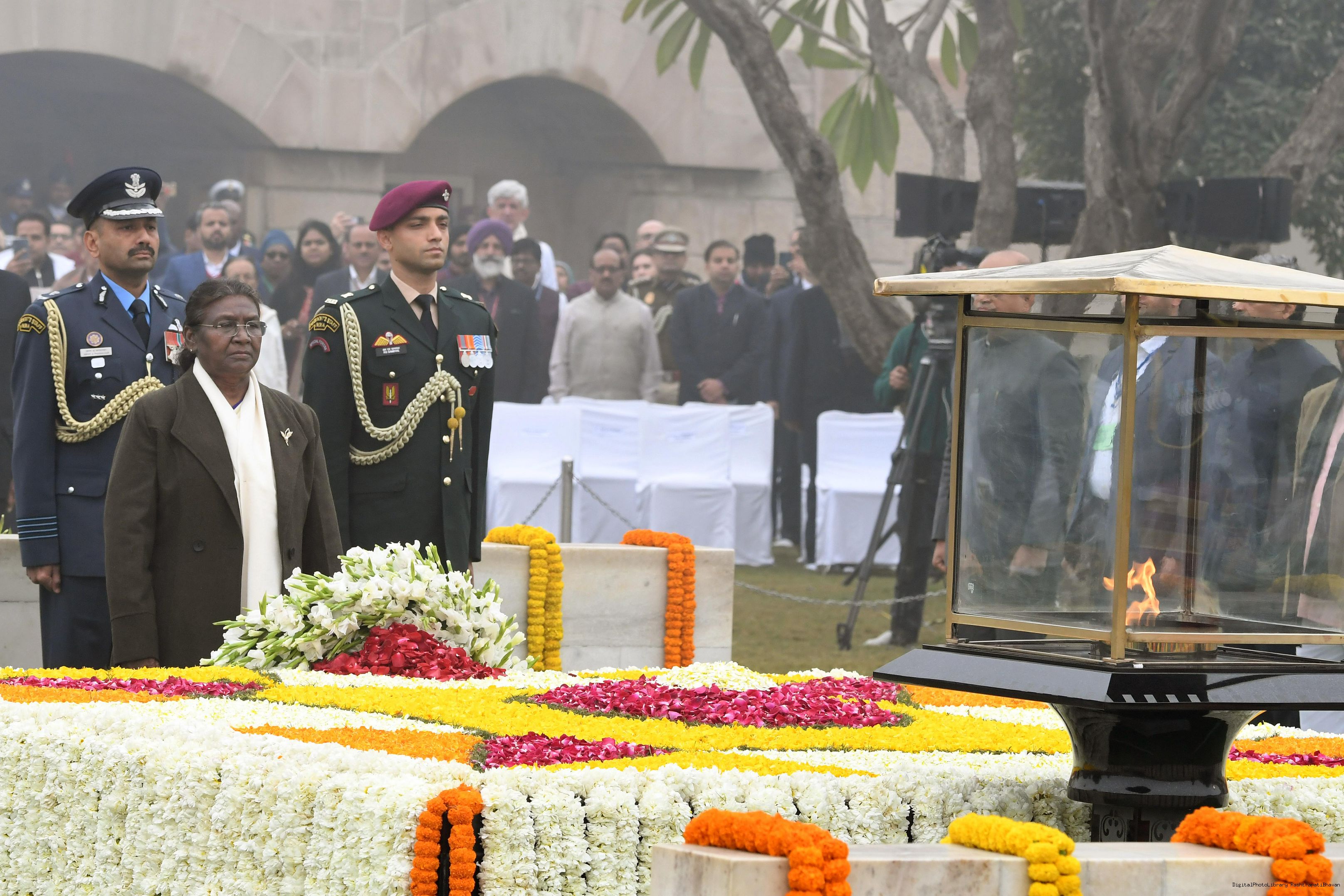 | Caption: | The President of India, Smt. Droupadi Murmu paid homage to Mahatma Gandhi on the 76 Martyrs Day and attended Sarva Dharma Prarthana at Rajghat, in New Delhi on January 30, 2024. |