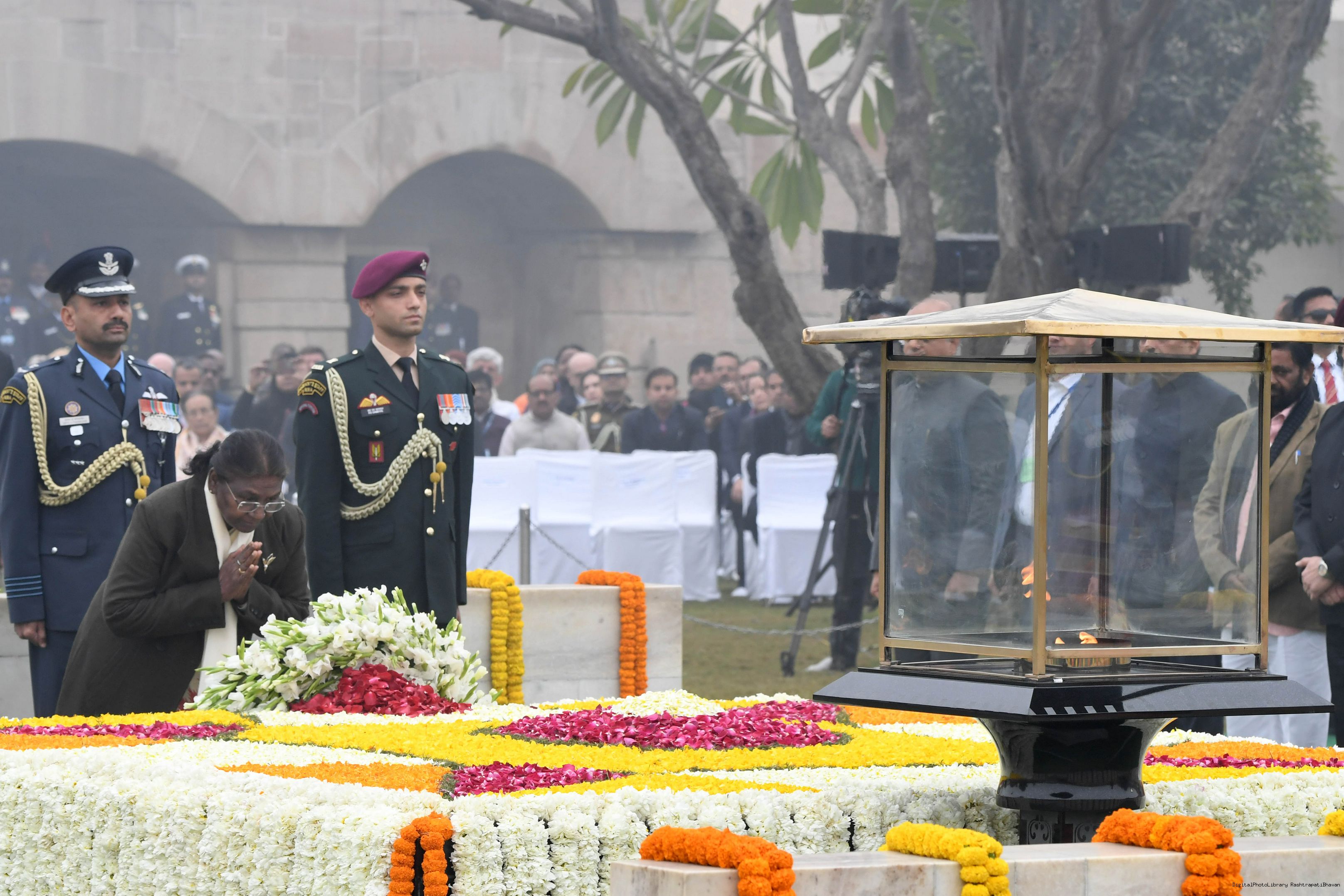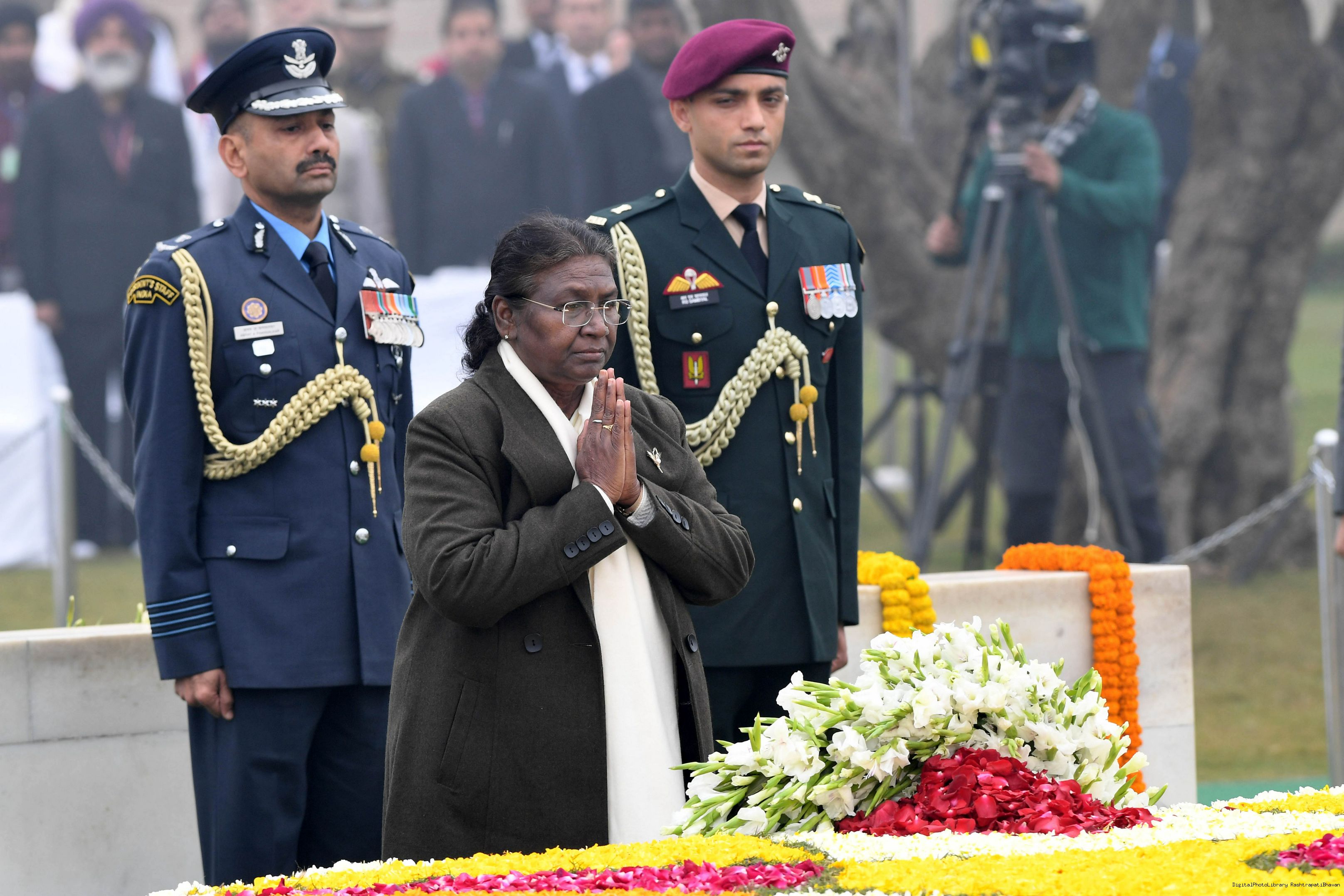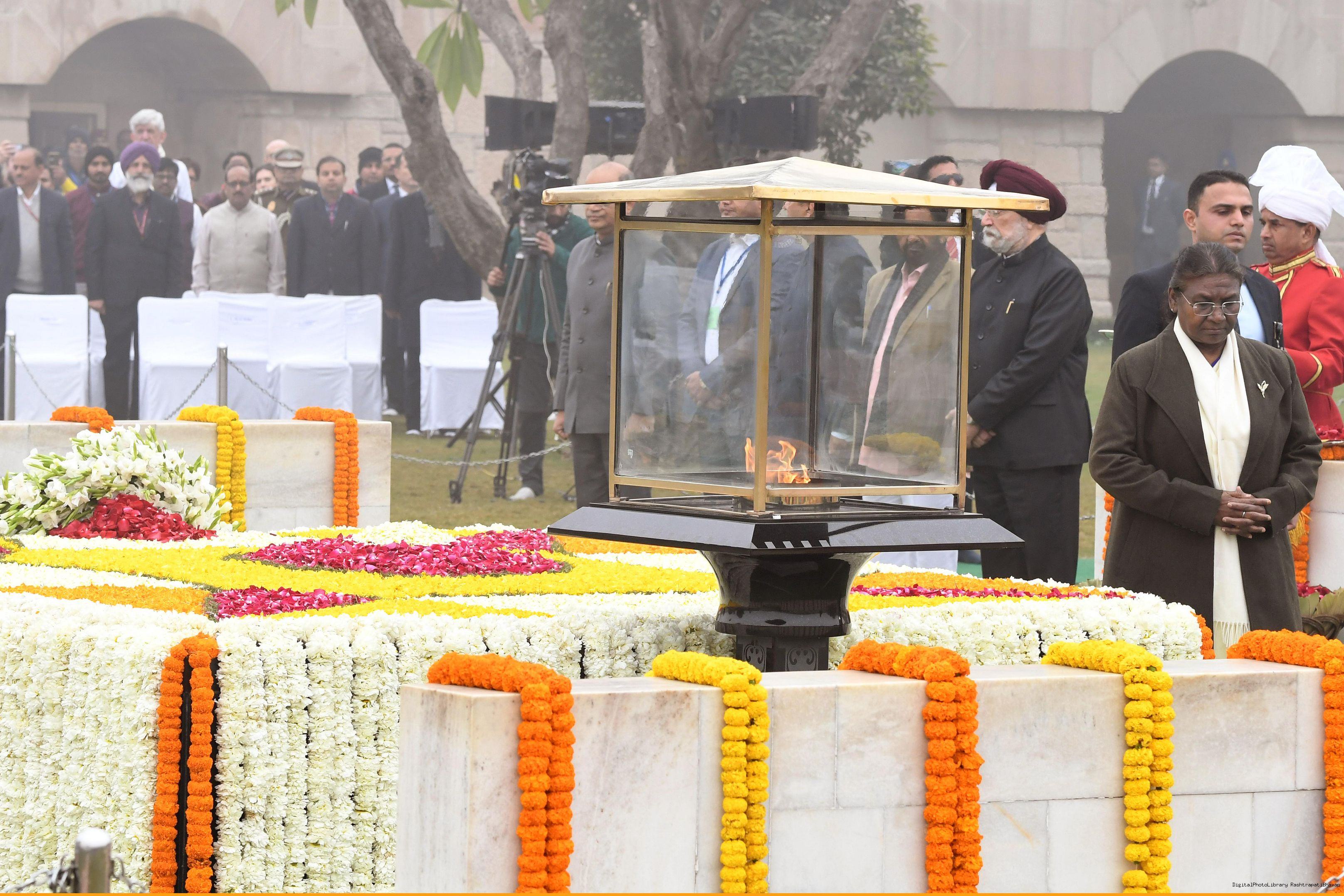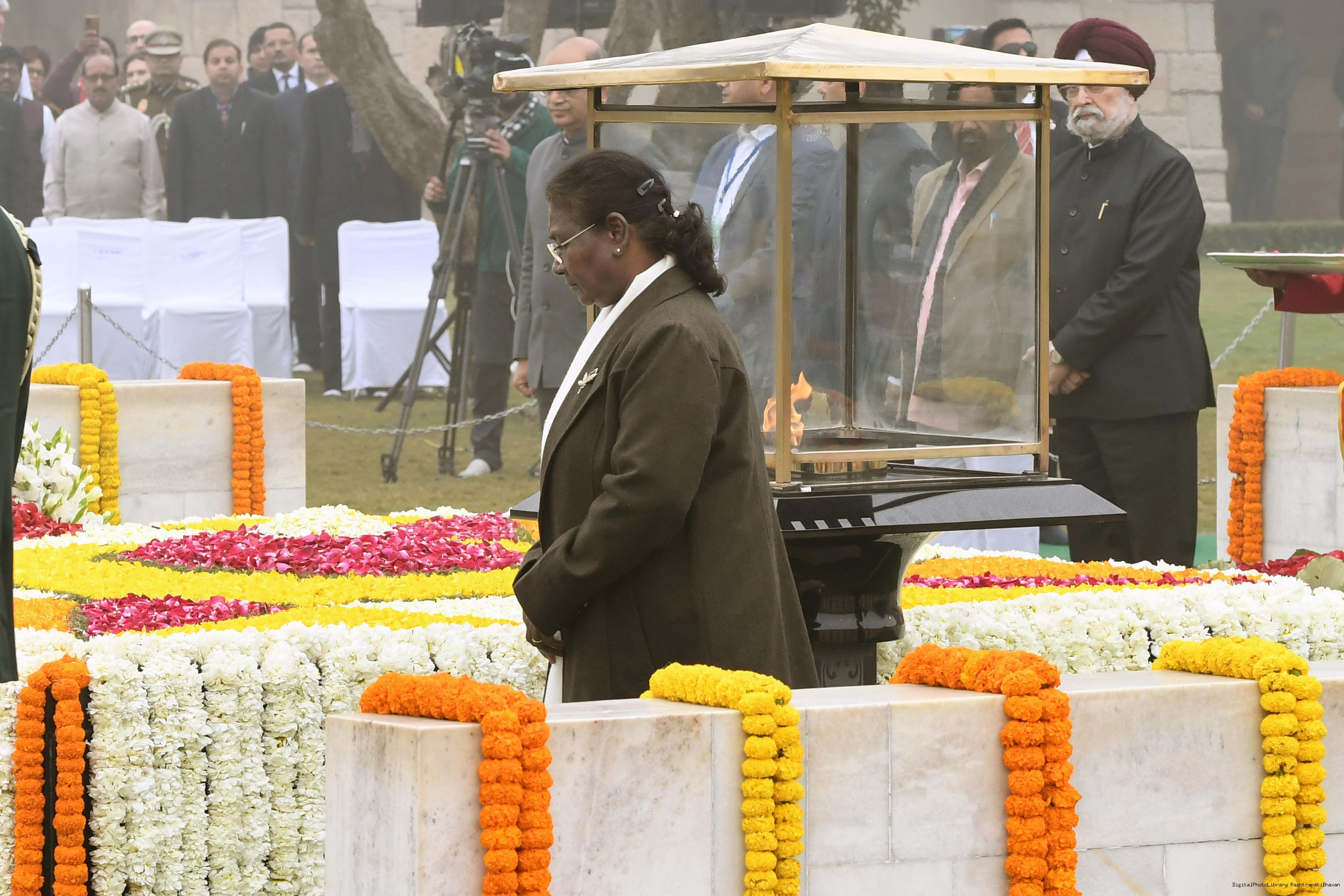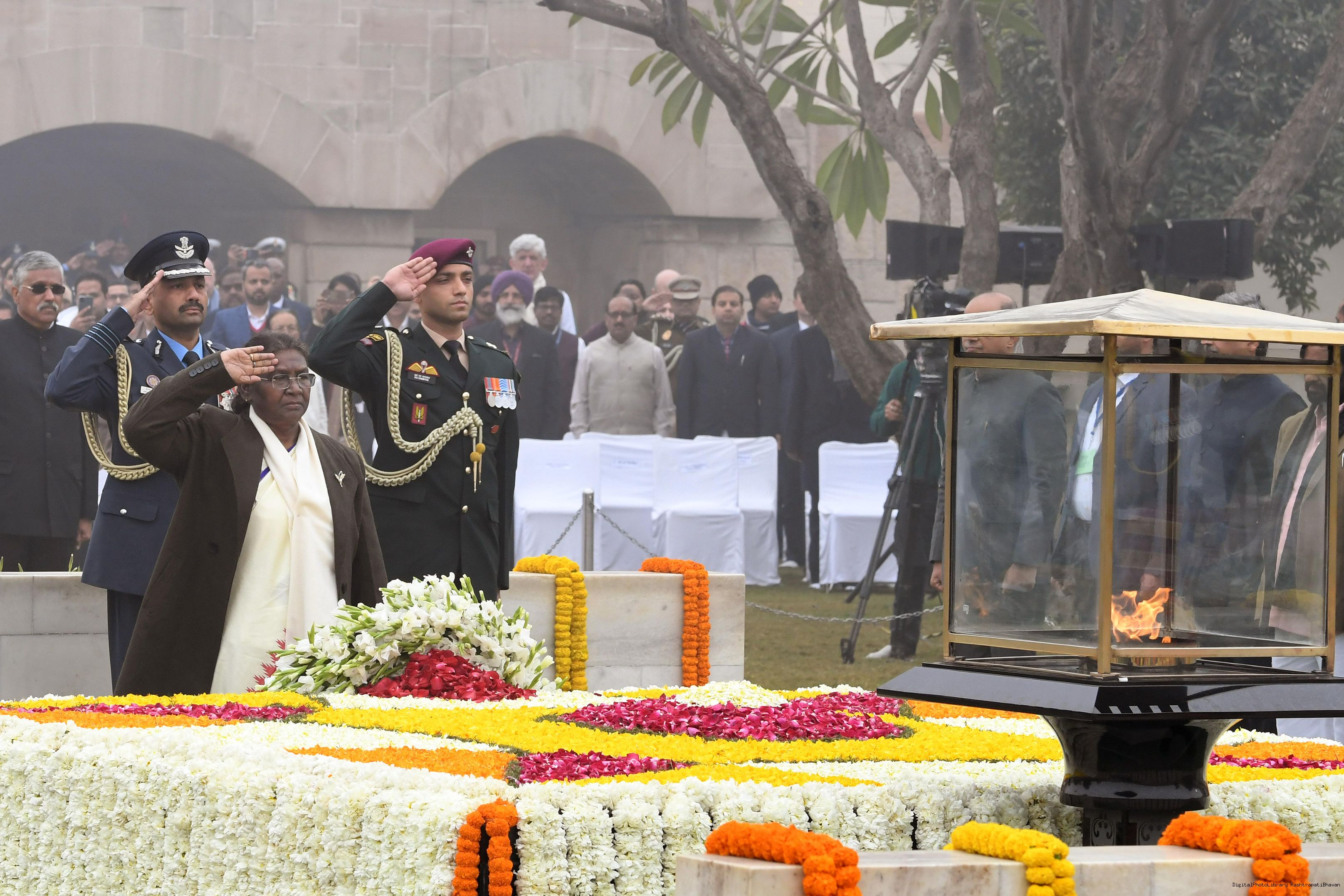 | Caption: | The President of India, Smt. Droupadi Murmu paid homage to Mahatma Gandhi on the 76 Martyrs Day and attended Sarva Dharma Prarthana at Rajghat, in New Delhi on January 30, 2024. |