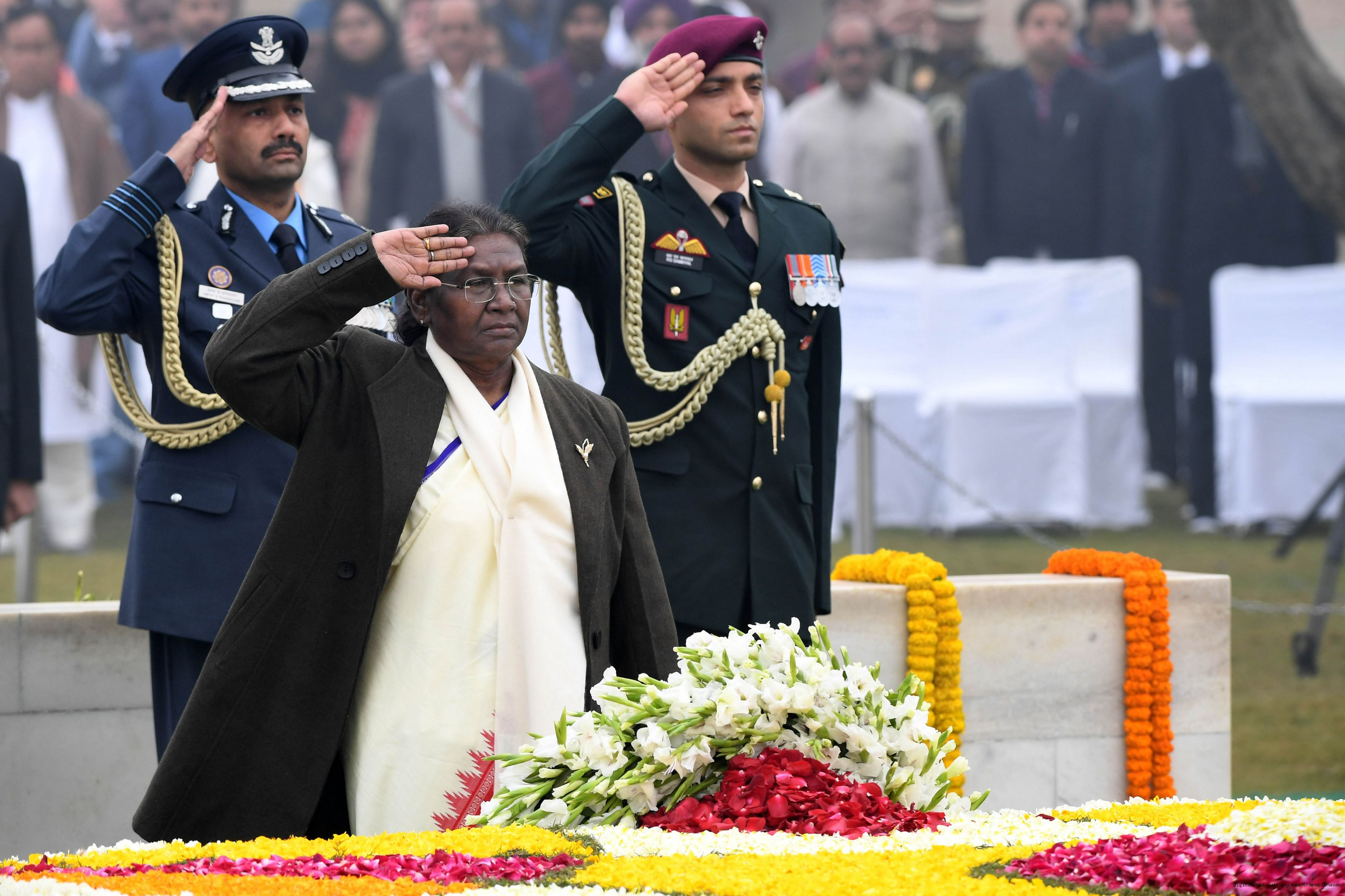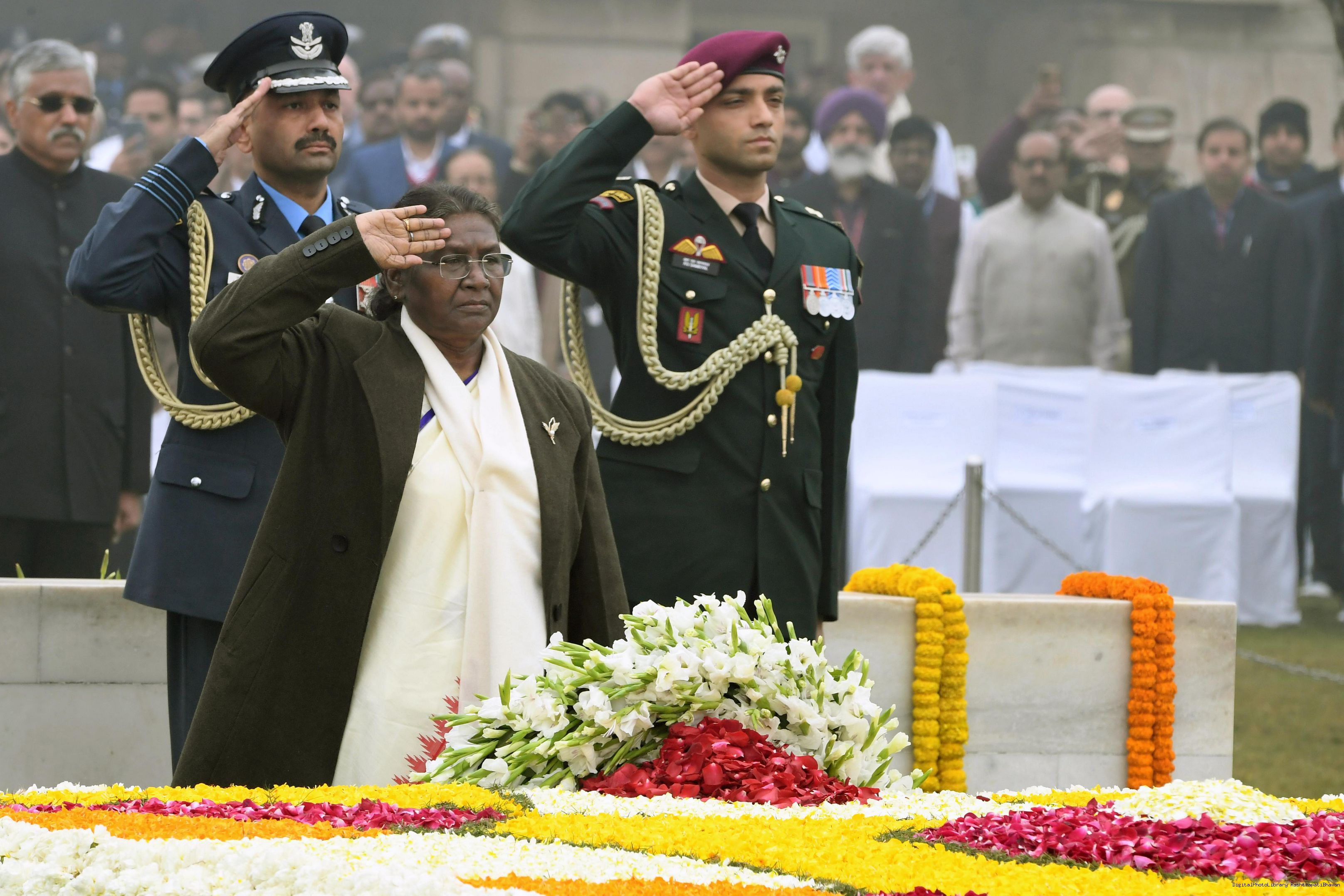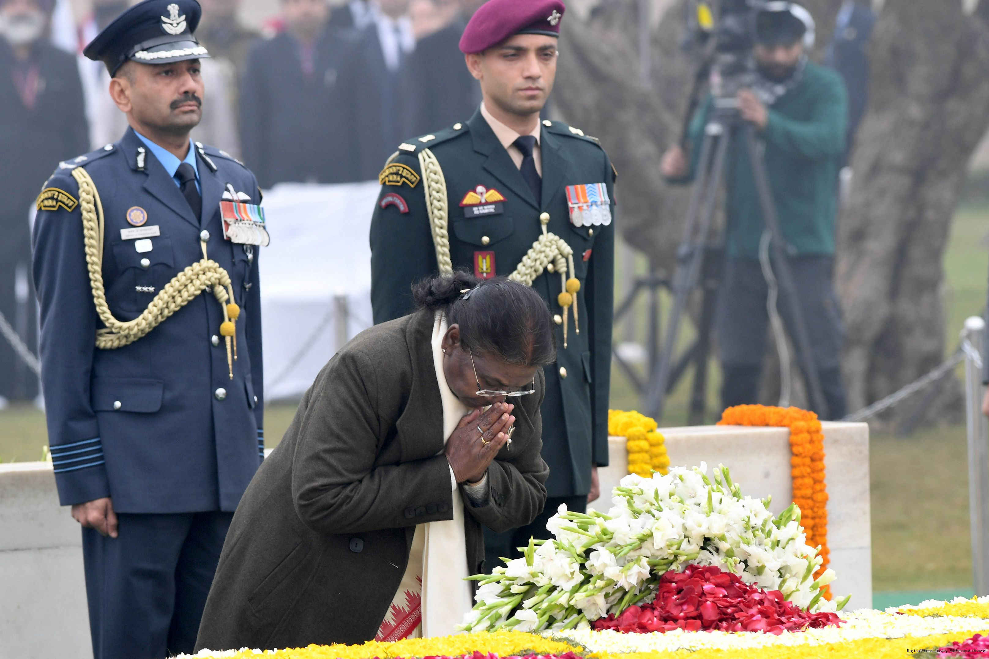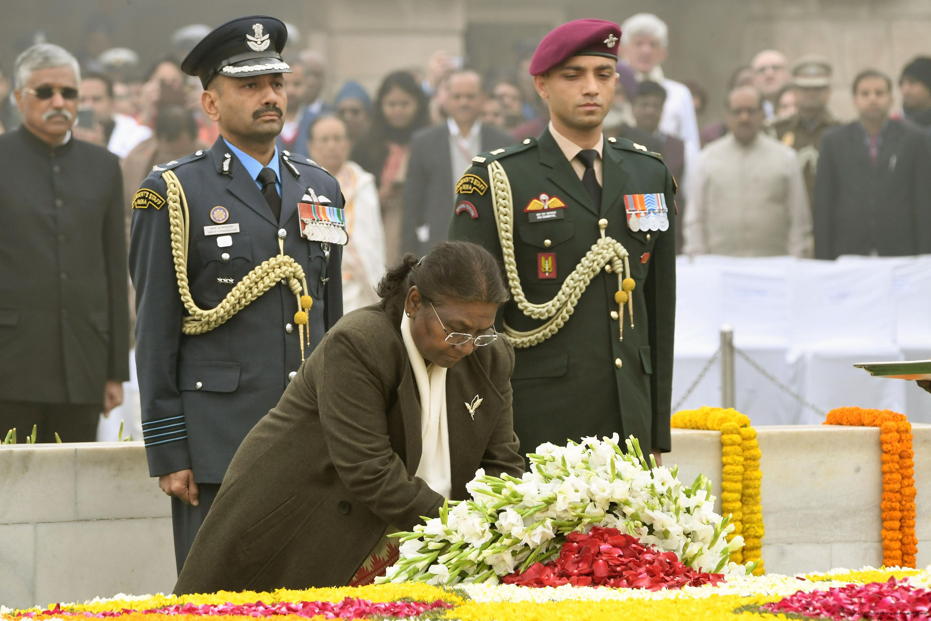 | Caption: | The President of India, Smt. Droupadi Murmu paid homage to Mahatma Gandhi on the 76 Martyrs Day and attended Sarva Dharma Prarthana at Rajghat, in New Delhi on January 30, 2024. |