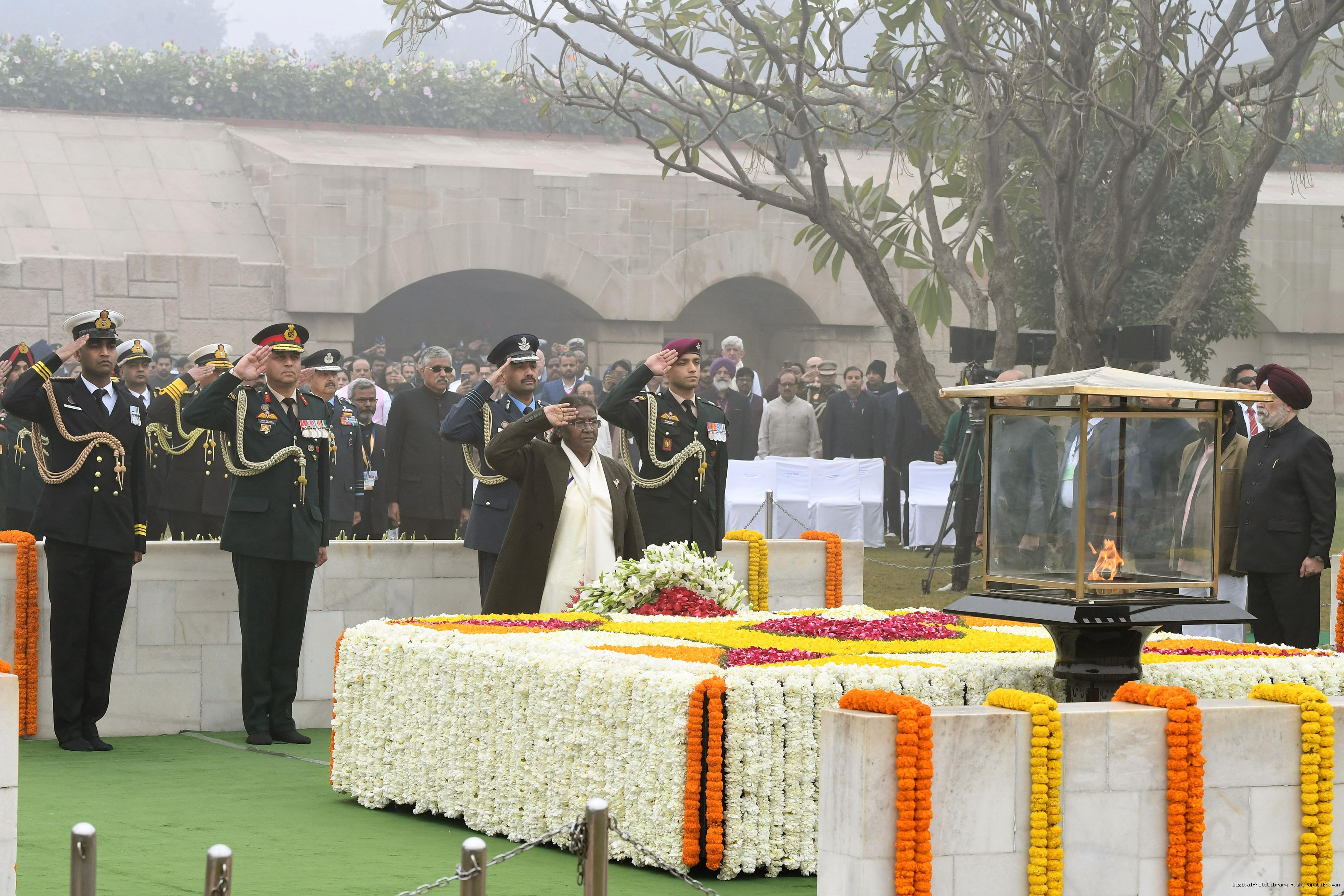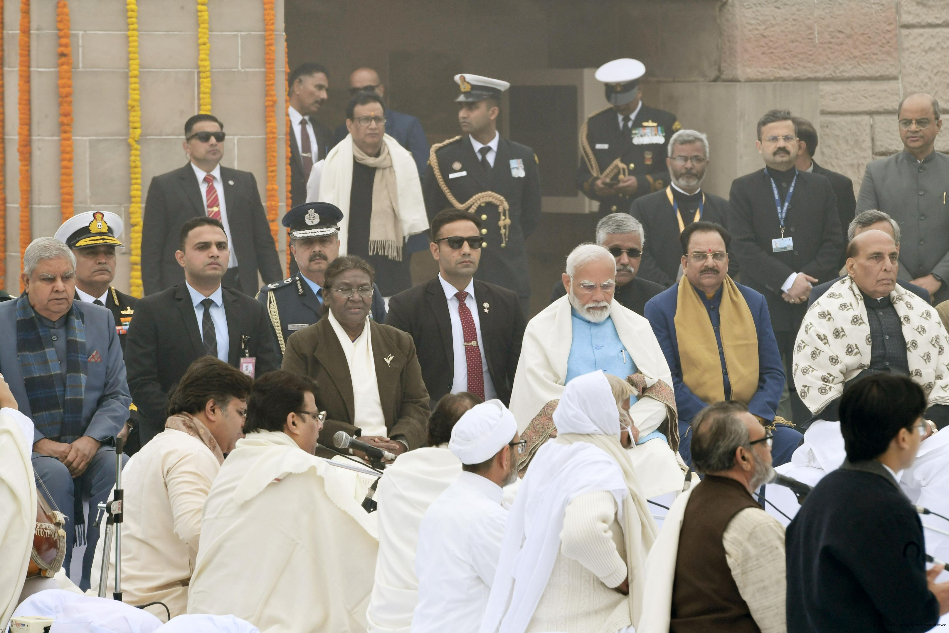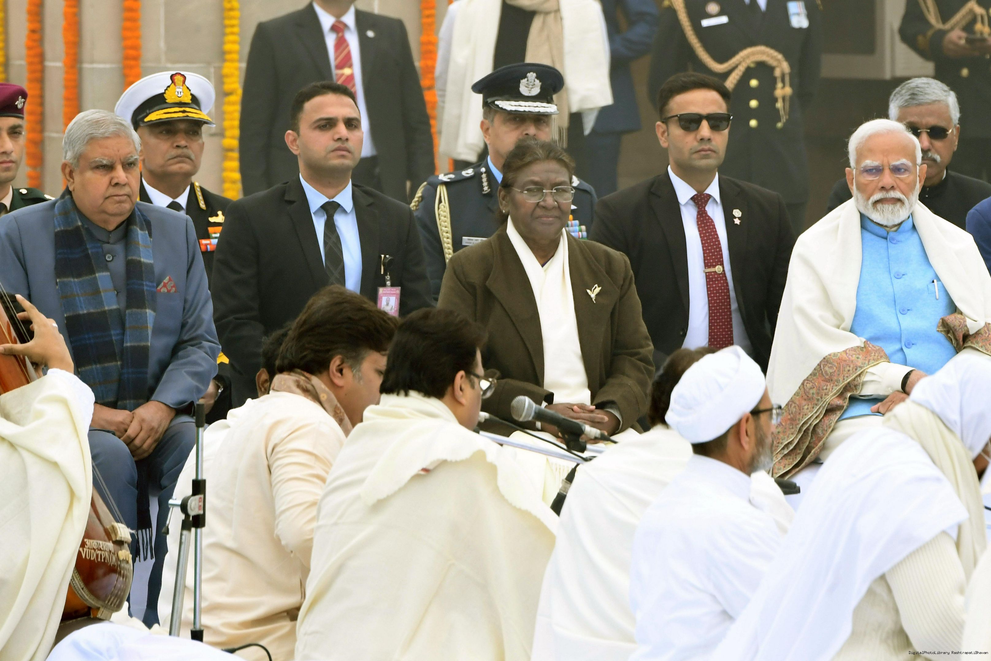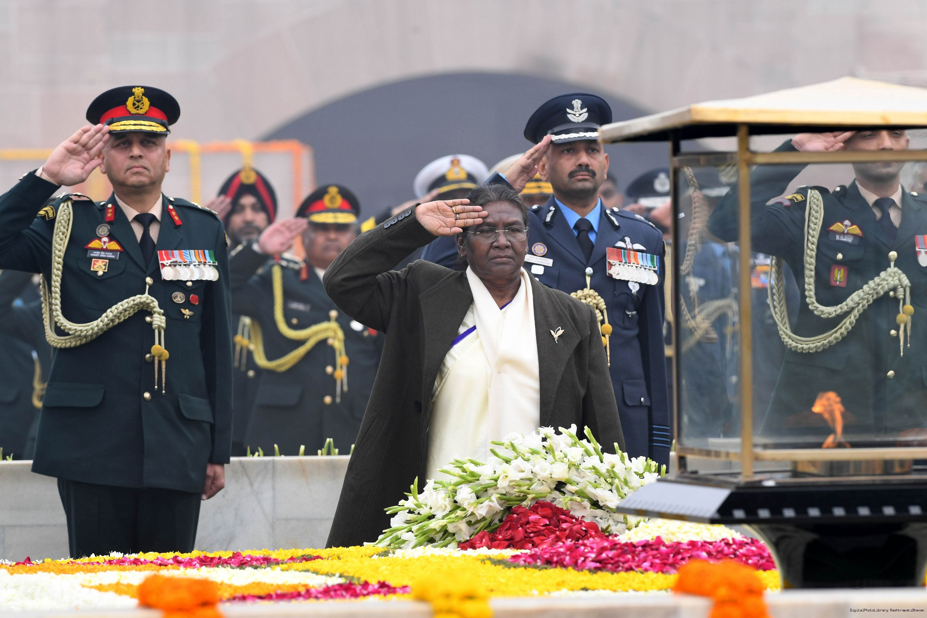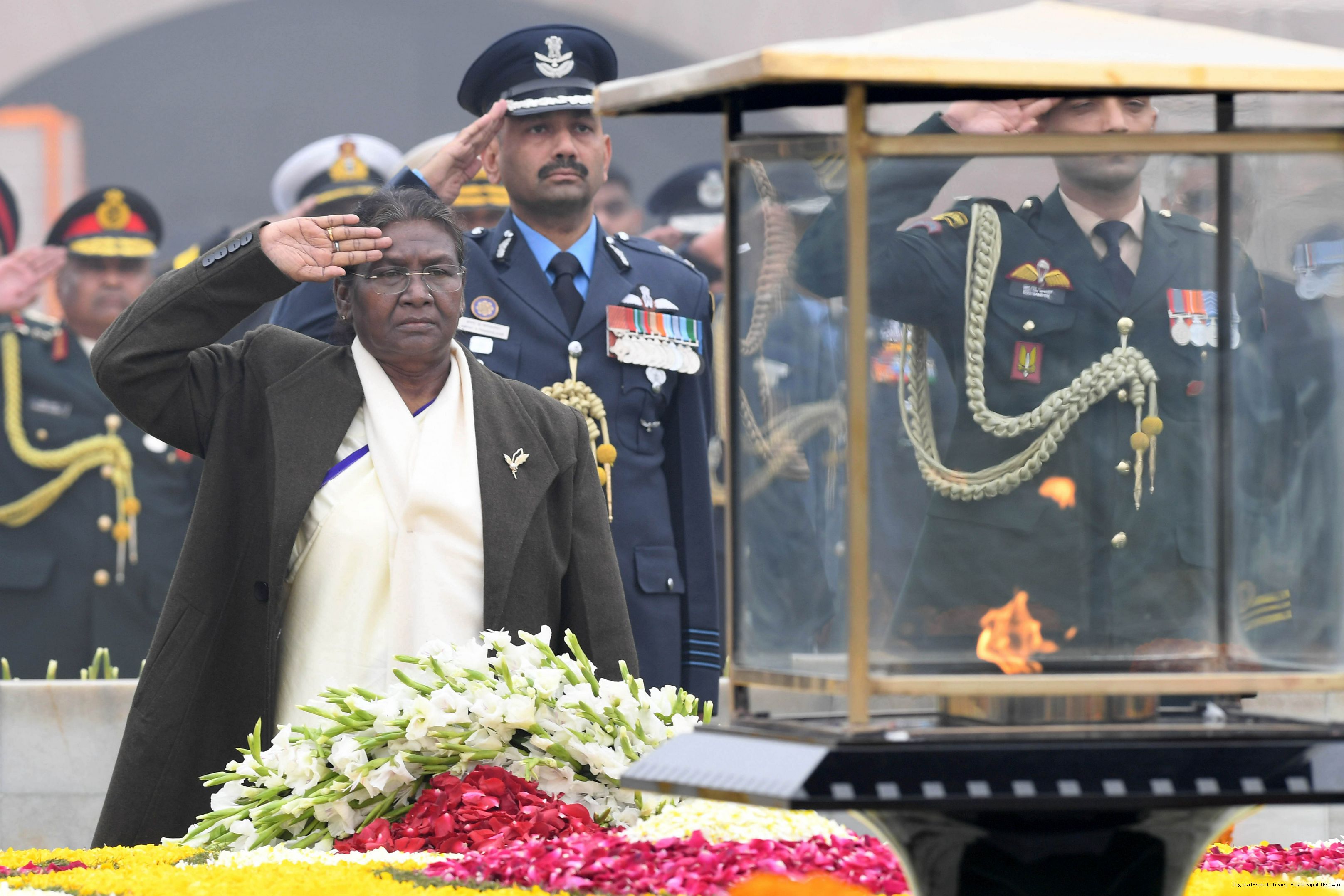 | Caption: | The President of India, Smt. Droupadi Murmu paid homage to Mahatma Gandhi on the 76 Martyrs Day and attended Sarva Dharma Prarthana at Rajghat, in New Delhi on January 30, 2024. |