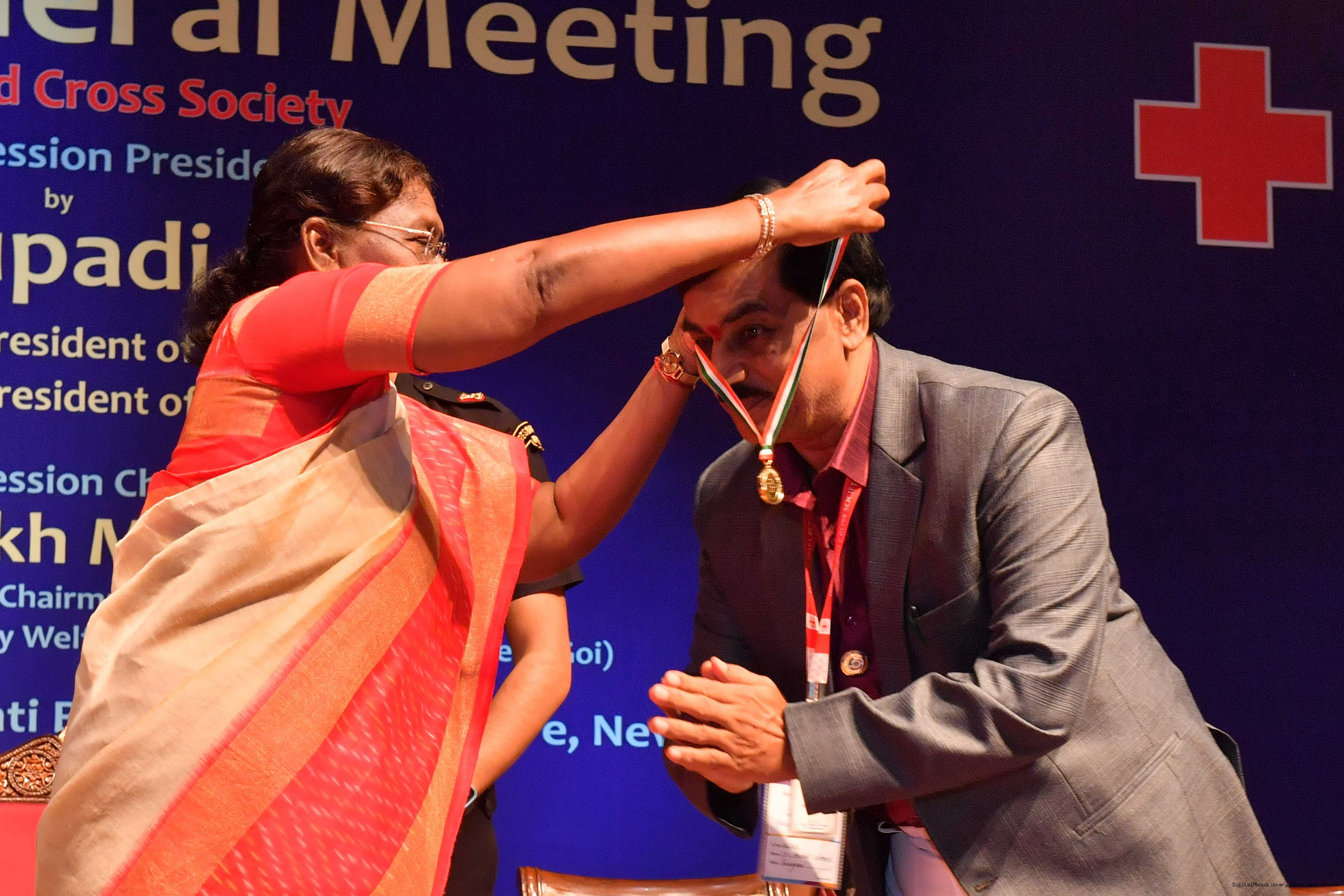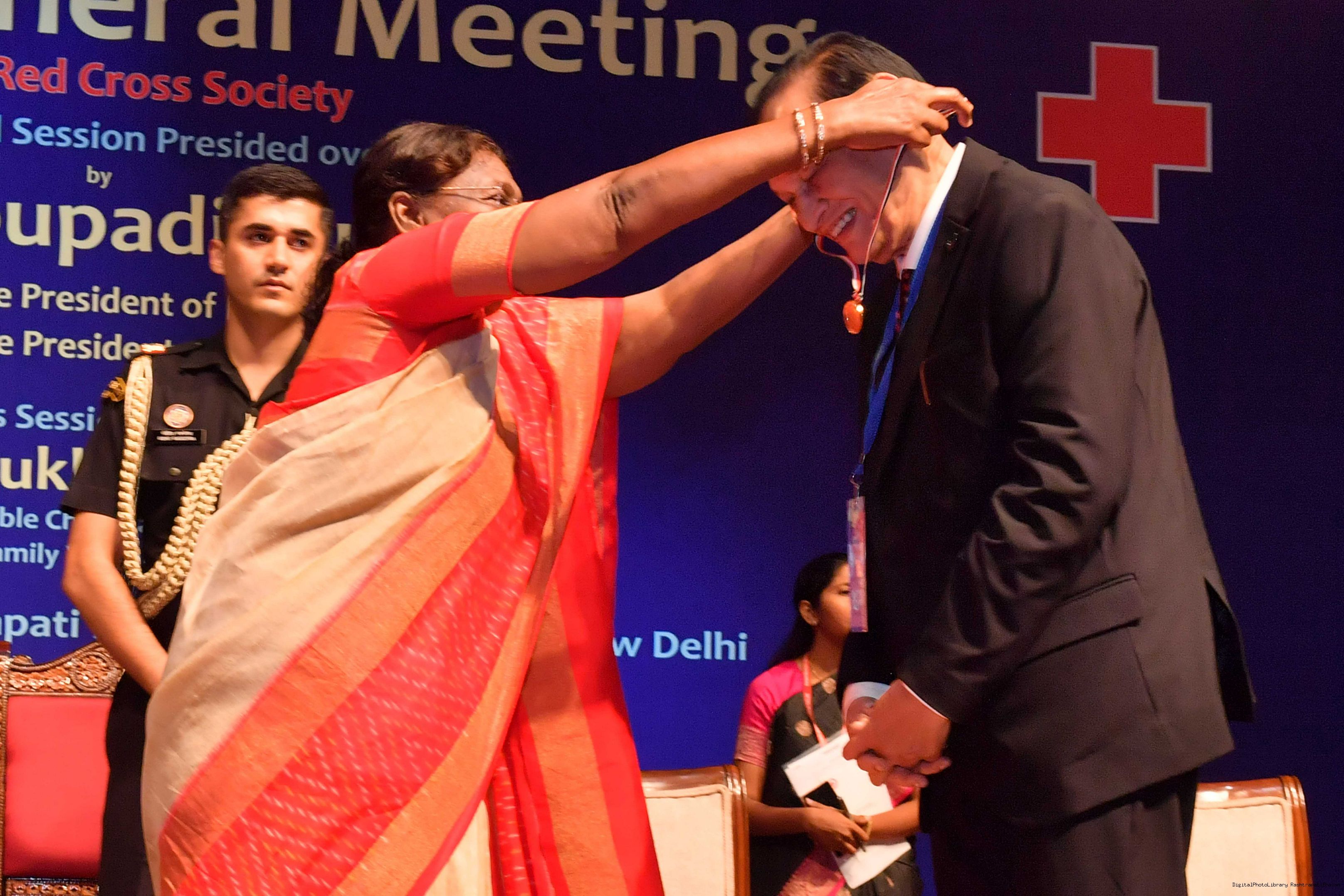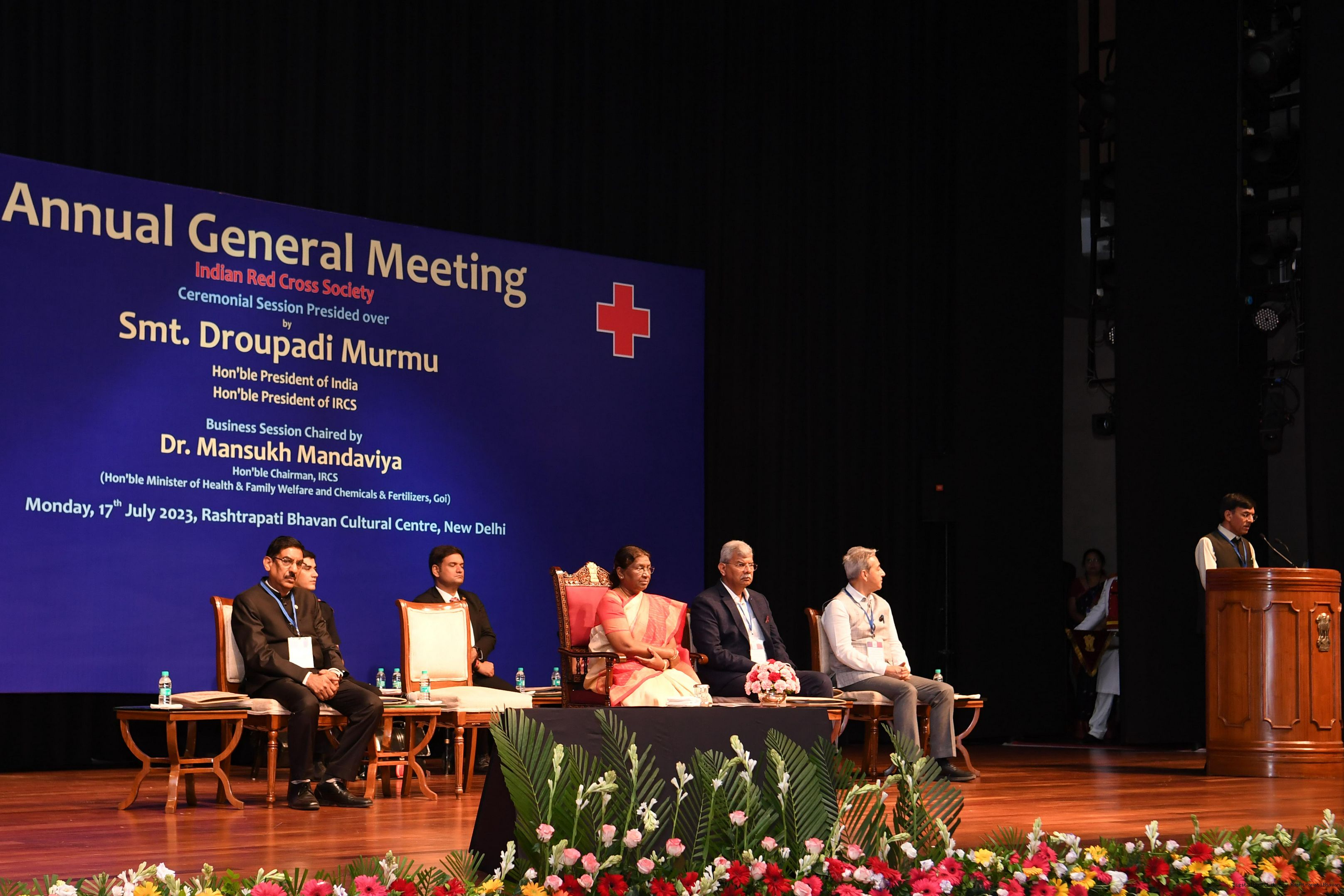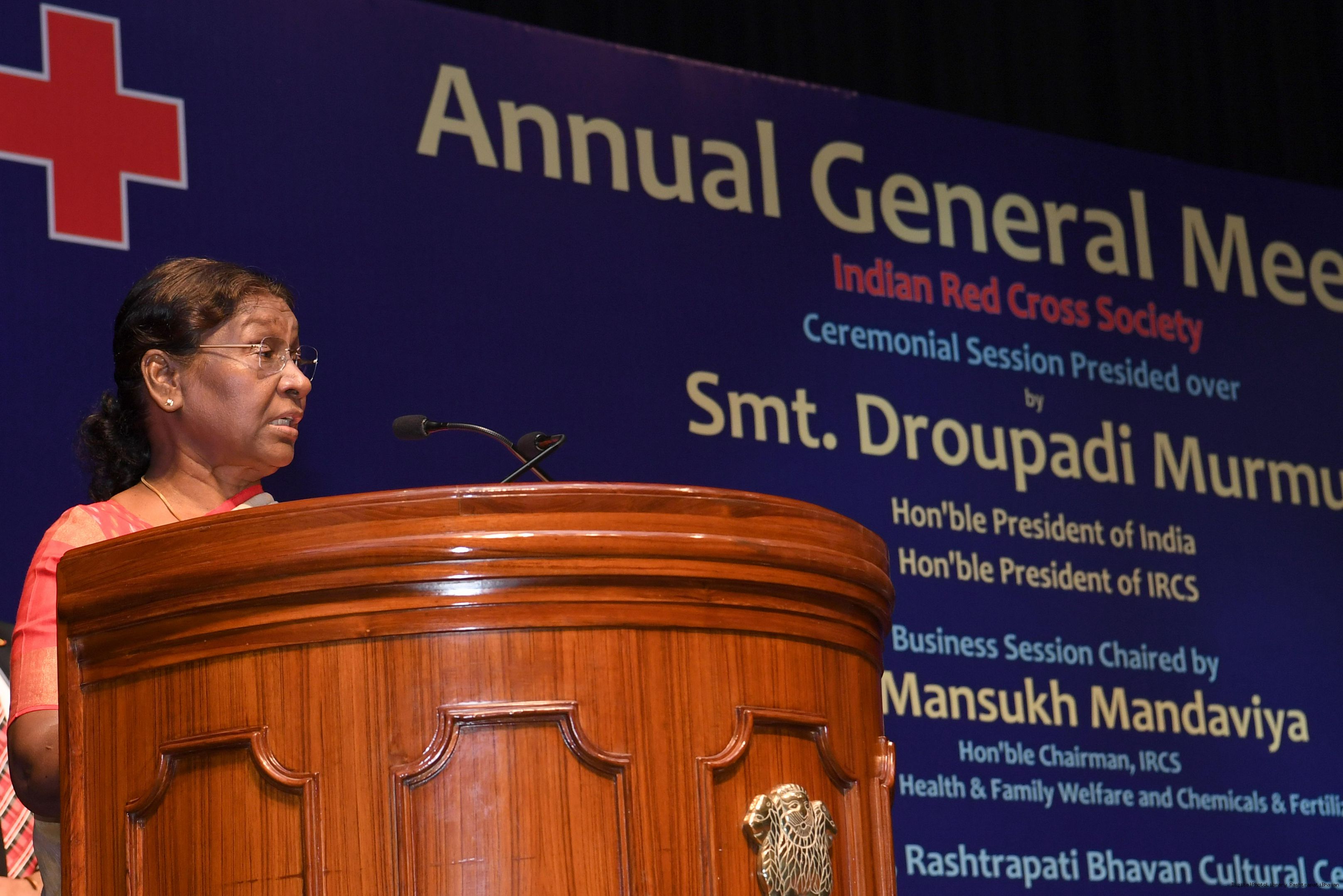 | Caption: | The President of India, Smt Droupadi Murmu presided over the ceremonial session of AGM of Indian Red Cross Society at Rashtrapati Bhavan Cultural Centre on July 17, 2023. |