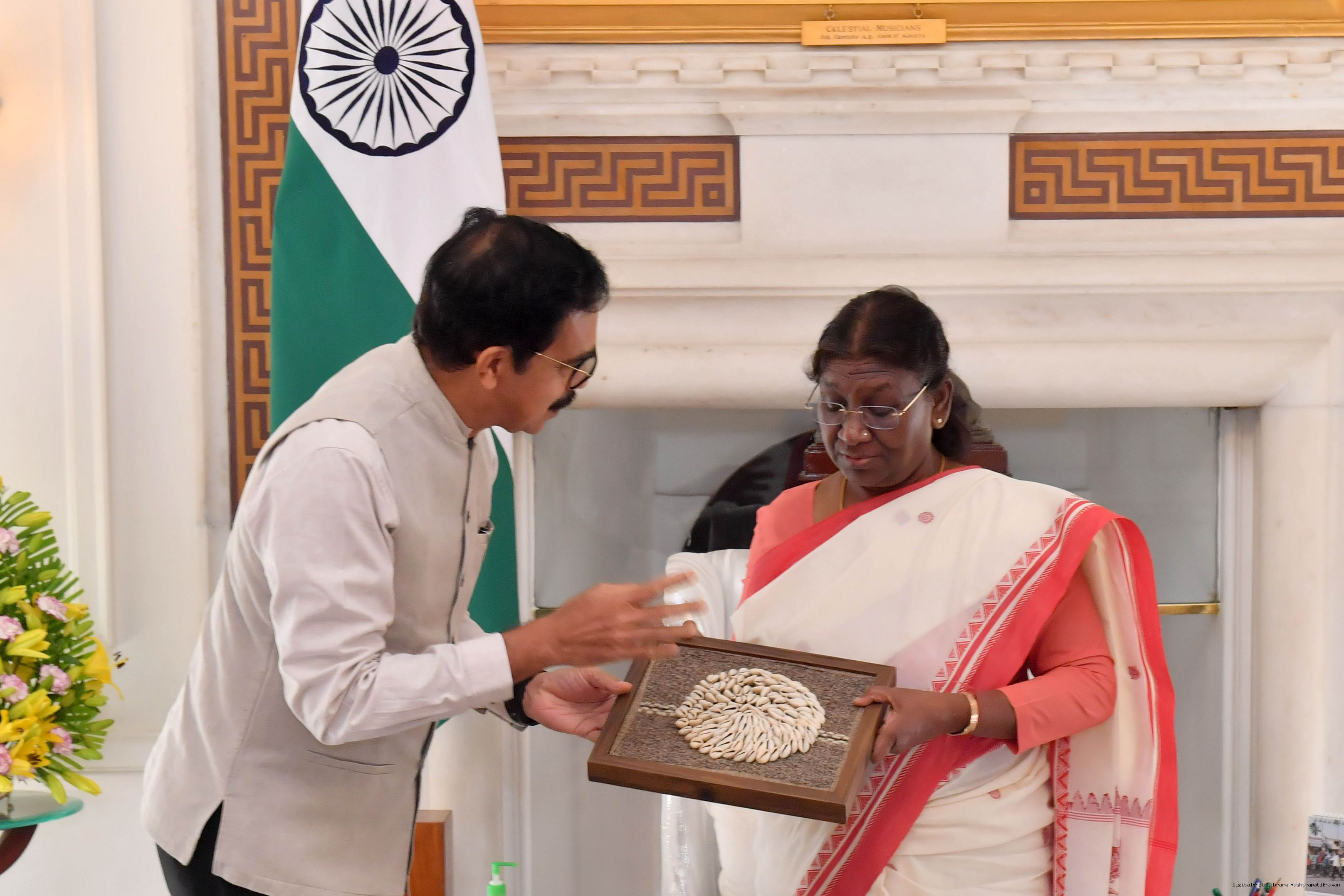| Caption: | Prof. Harilal B. Menon, Vice Chancellor, Goa University meeting with the President of India, Smt. Droupadi Murmu at Rashtrapati Bhavan on July 20, 2023. |